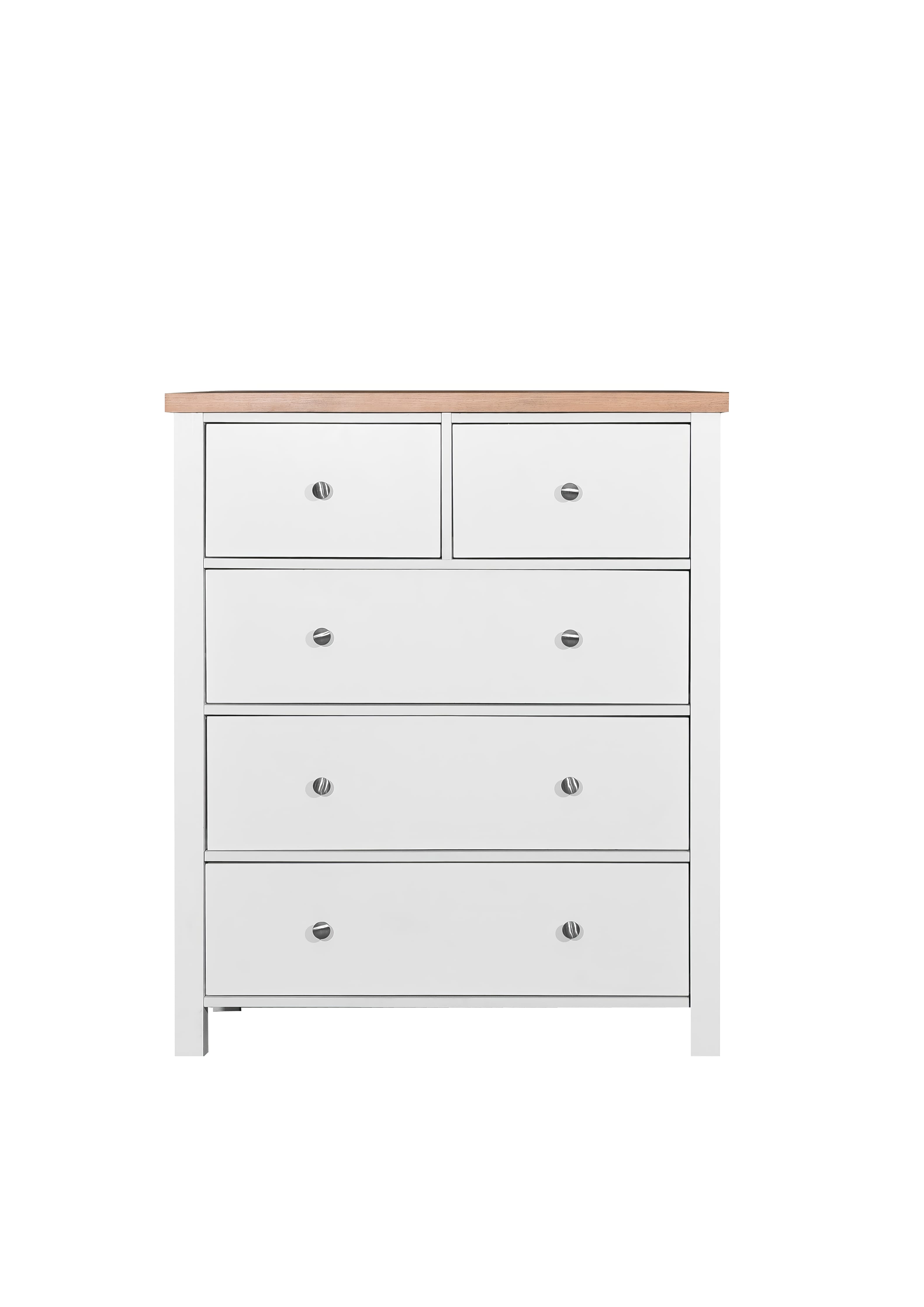 Bring elegance to your home, with a sense of British style and design with this bright collection. The Astbury series lends itself to solid wood looks with self-assembly simplicity. White Frames with Contrasting Oak Top. 3 Large and 2 Small Drawers. Round Metal Knobs and Metal Drawer Runners.