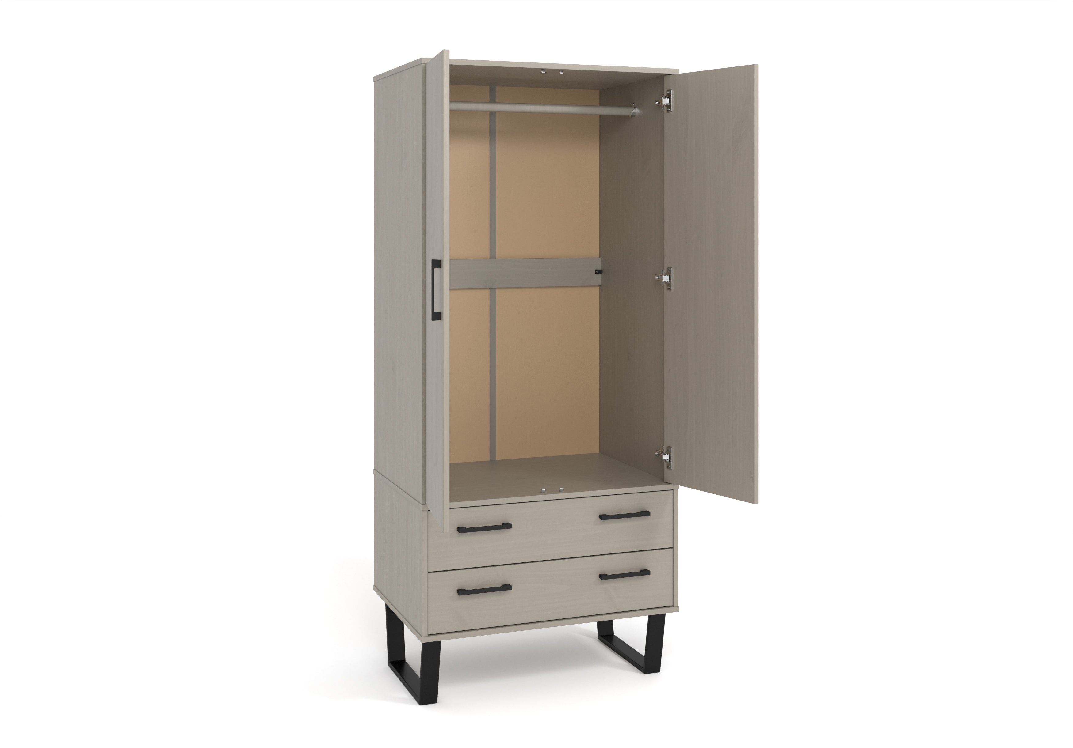 Compact and practical, this industrial look wardrobe offers plenty of drawer space along with a generous hanging space, all finished in an antique wax finish with black pull handles and a metal underframe.