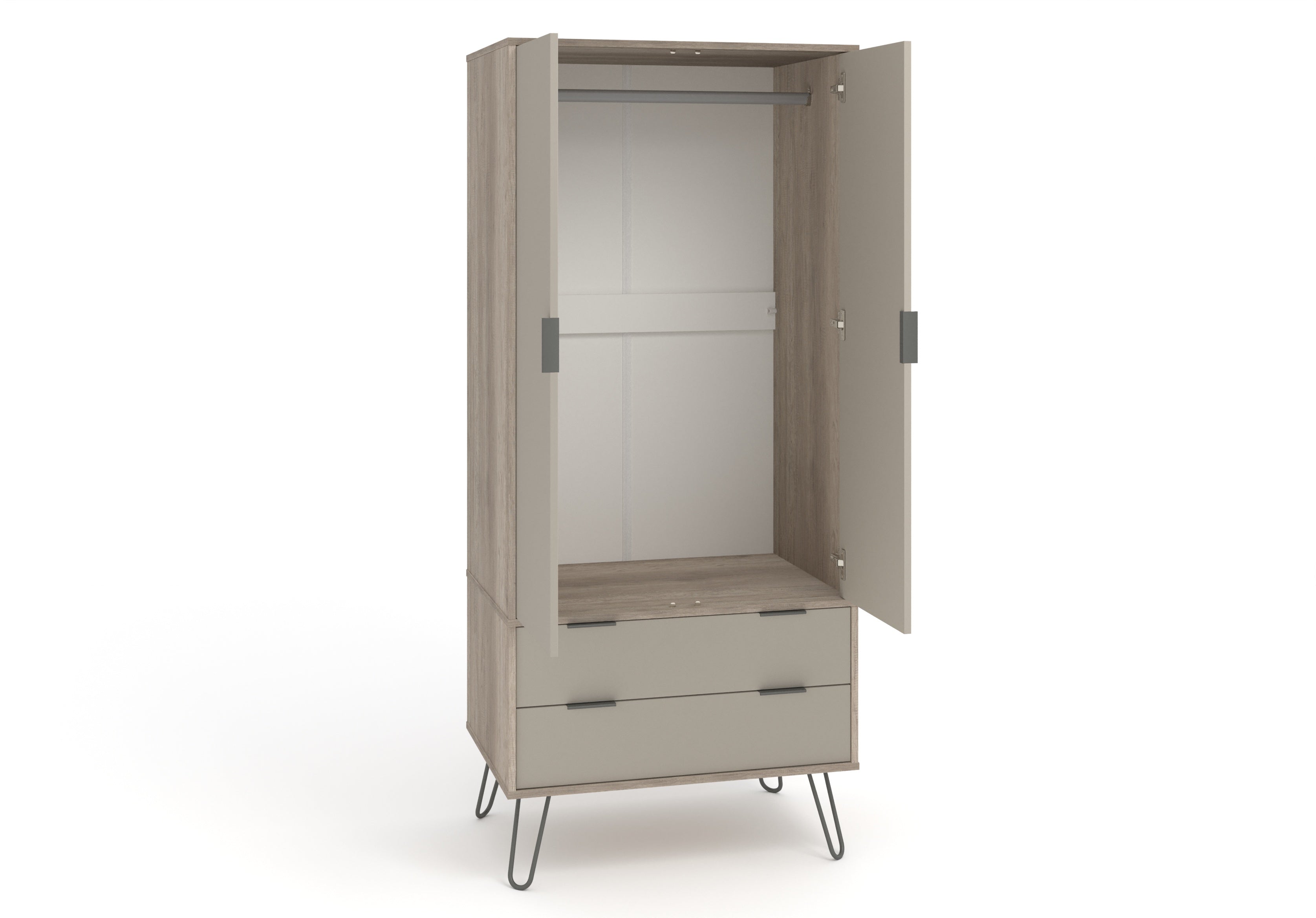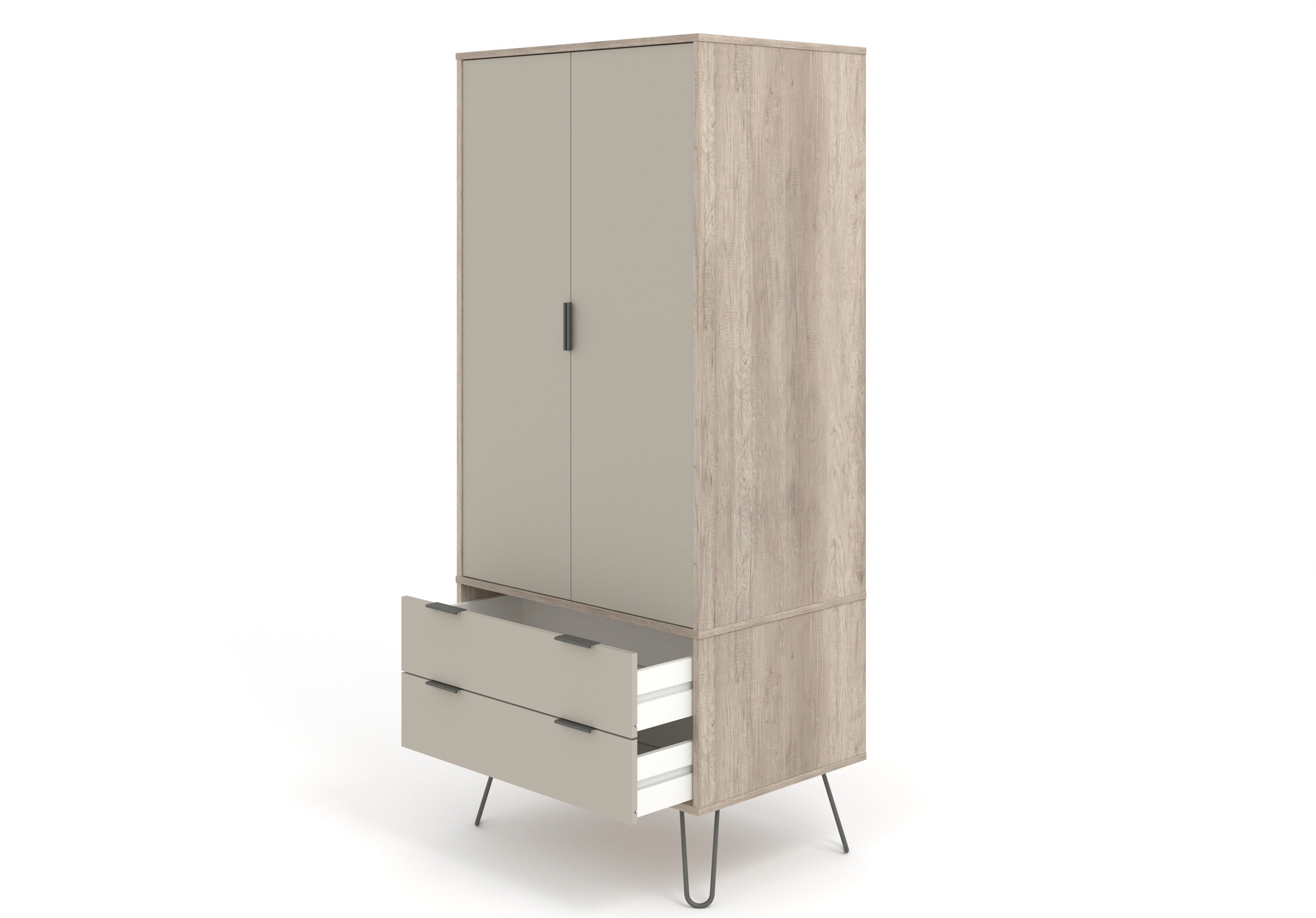 Compact and practical, this industrial look wardrobe offers plenty of drawer space along with a generous hanging space, all finished in an antique wax finish with plastic pull handles and metal feet.