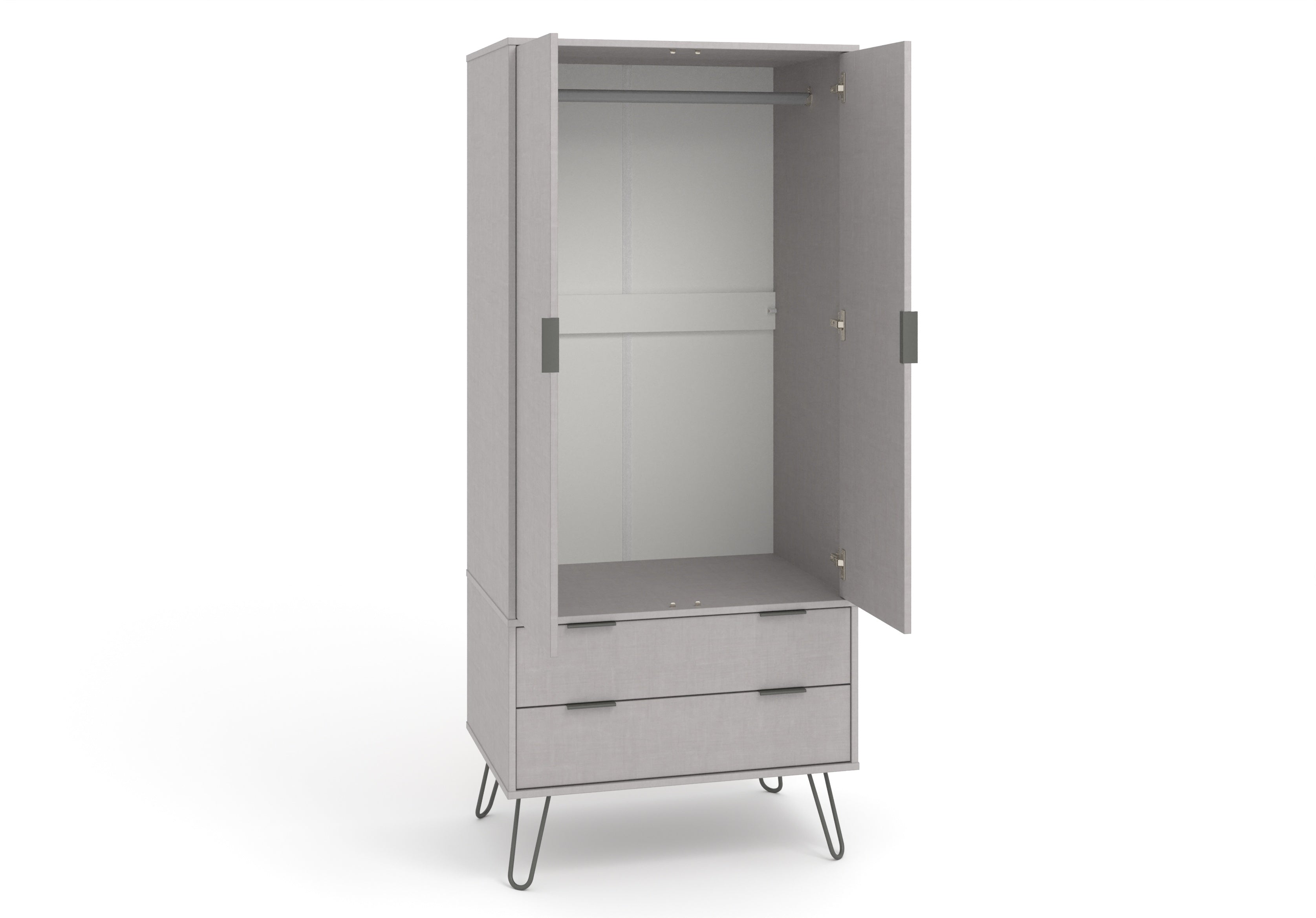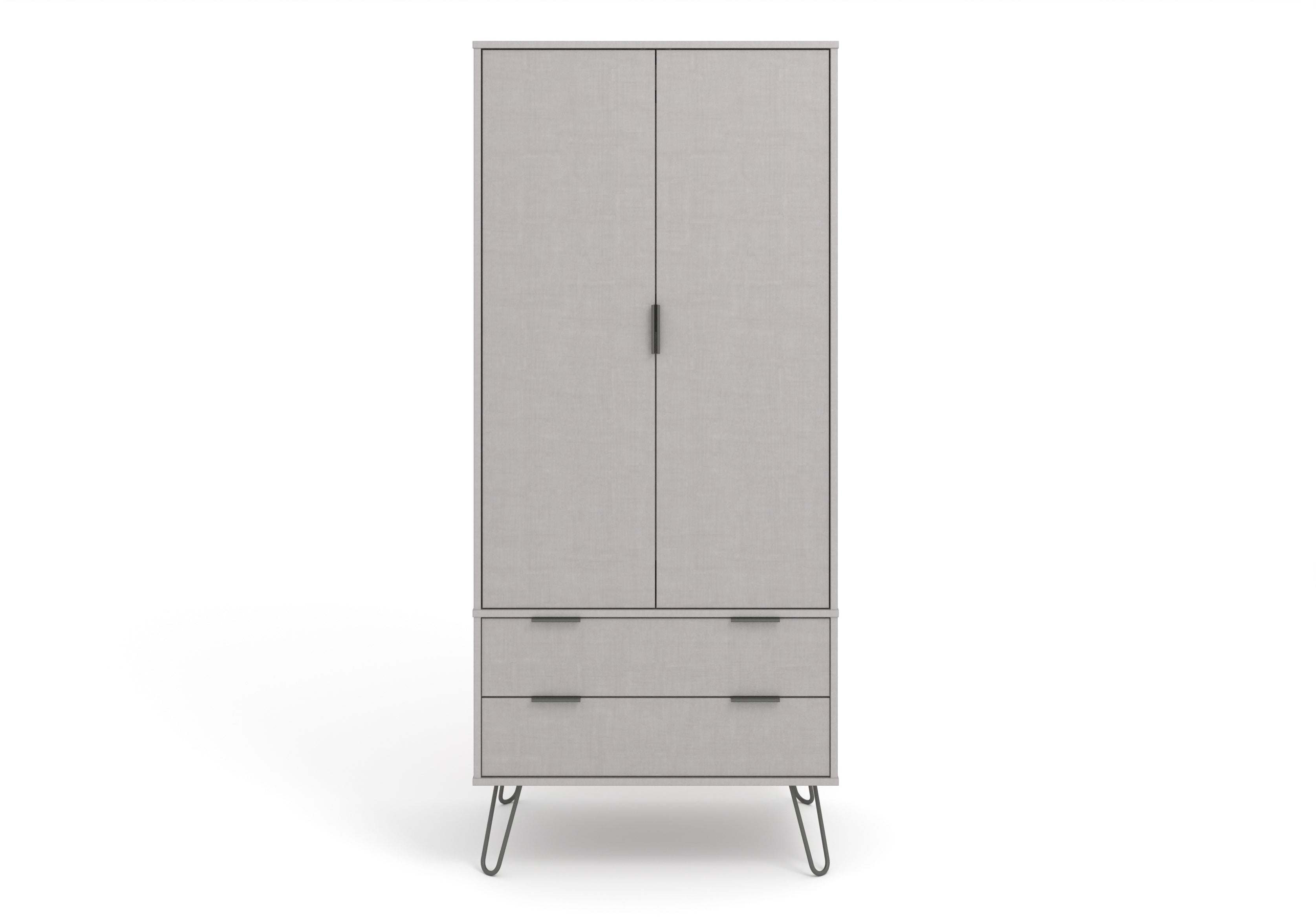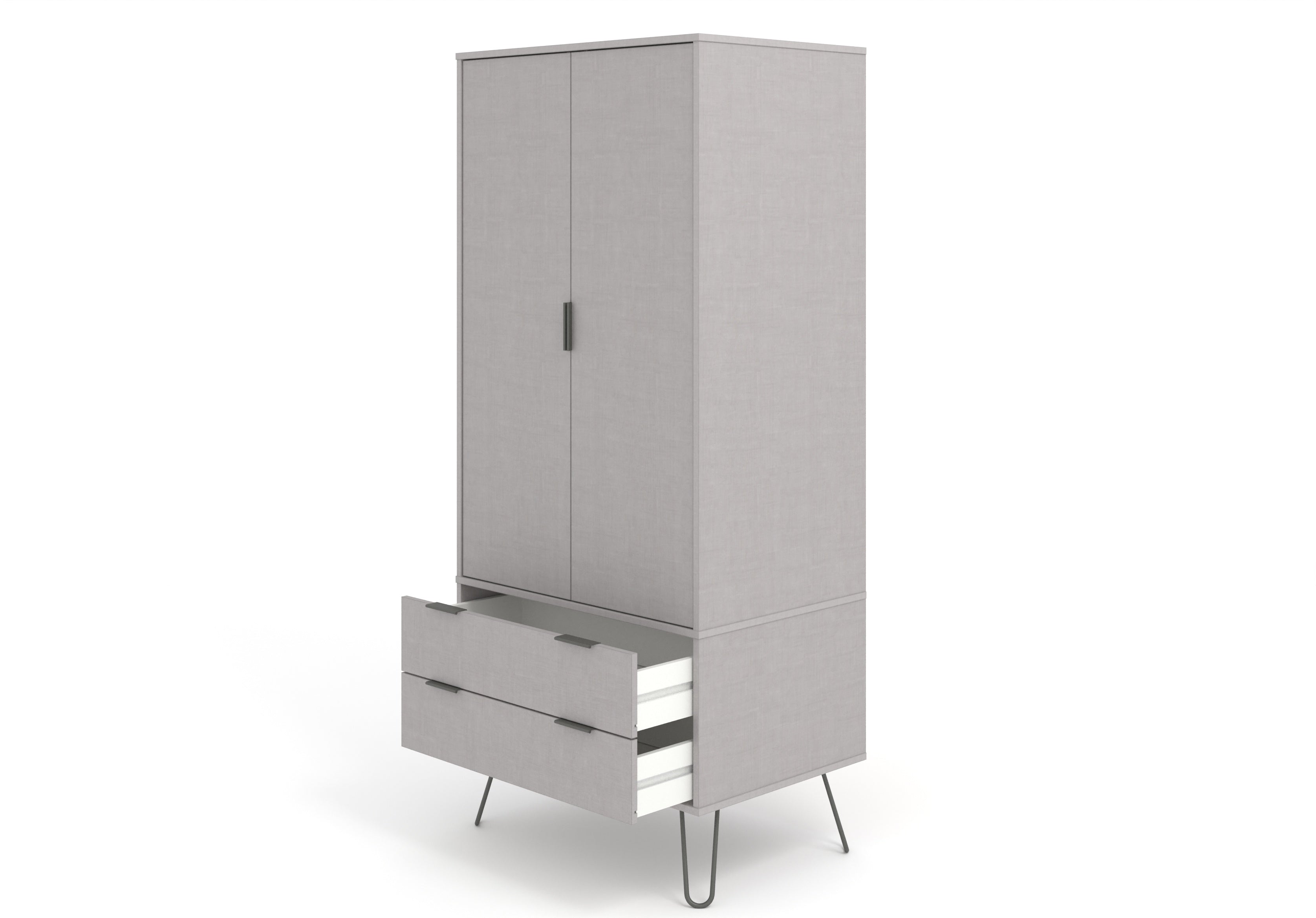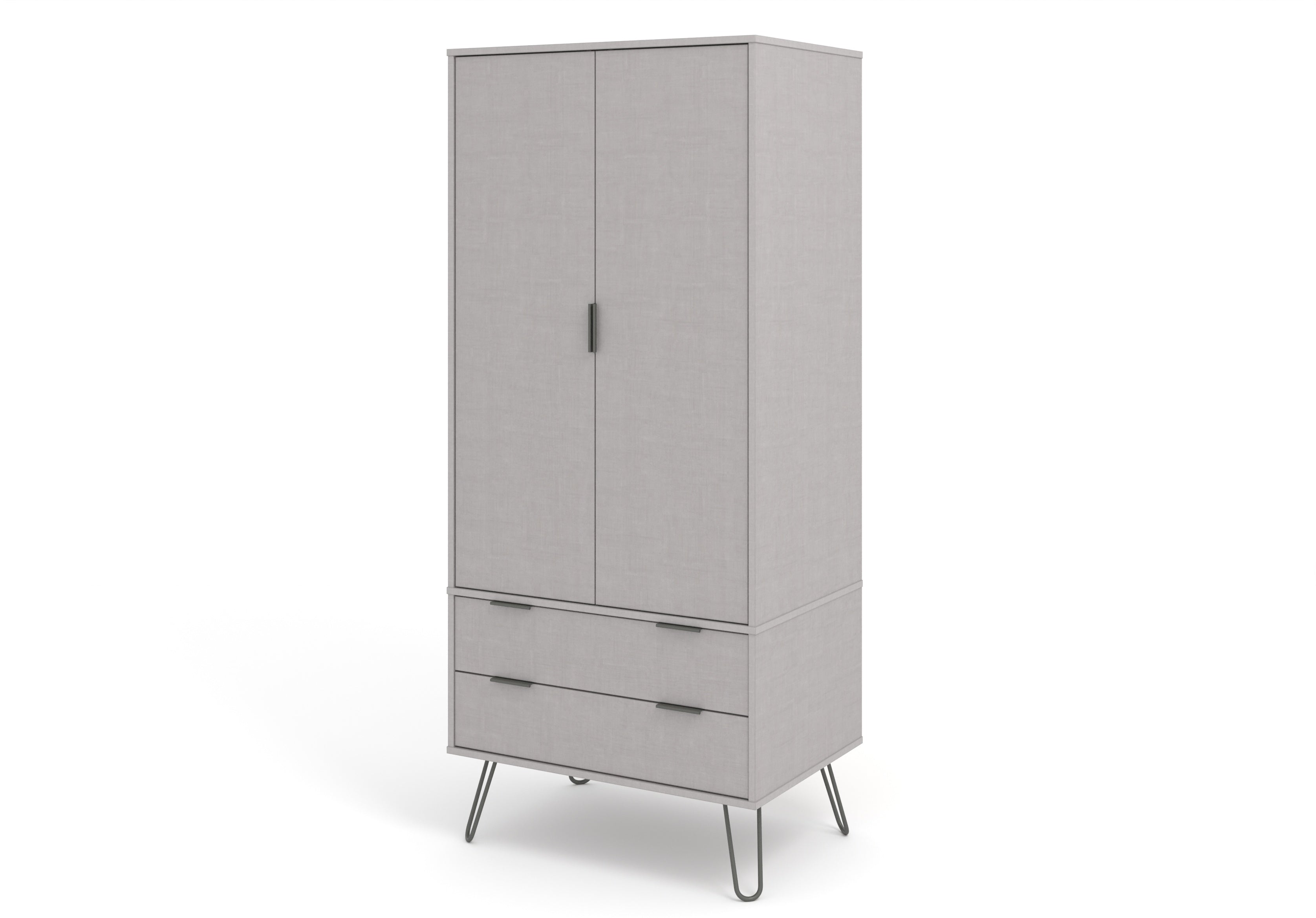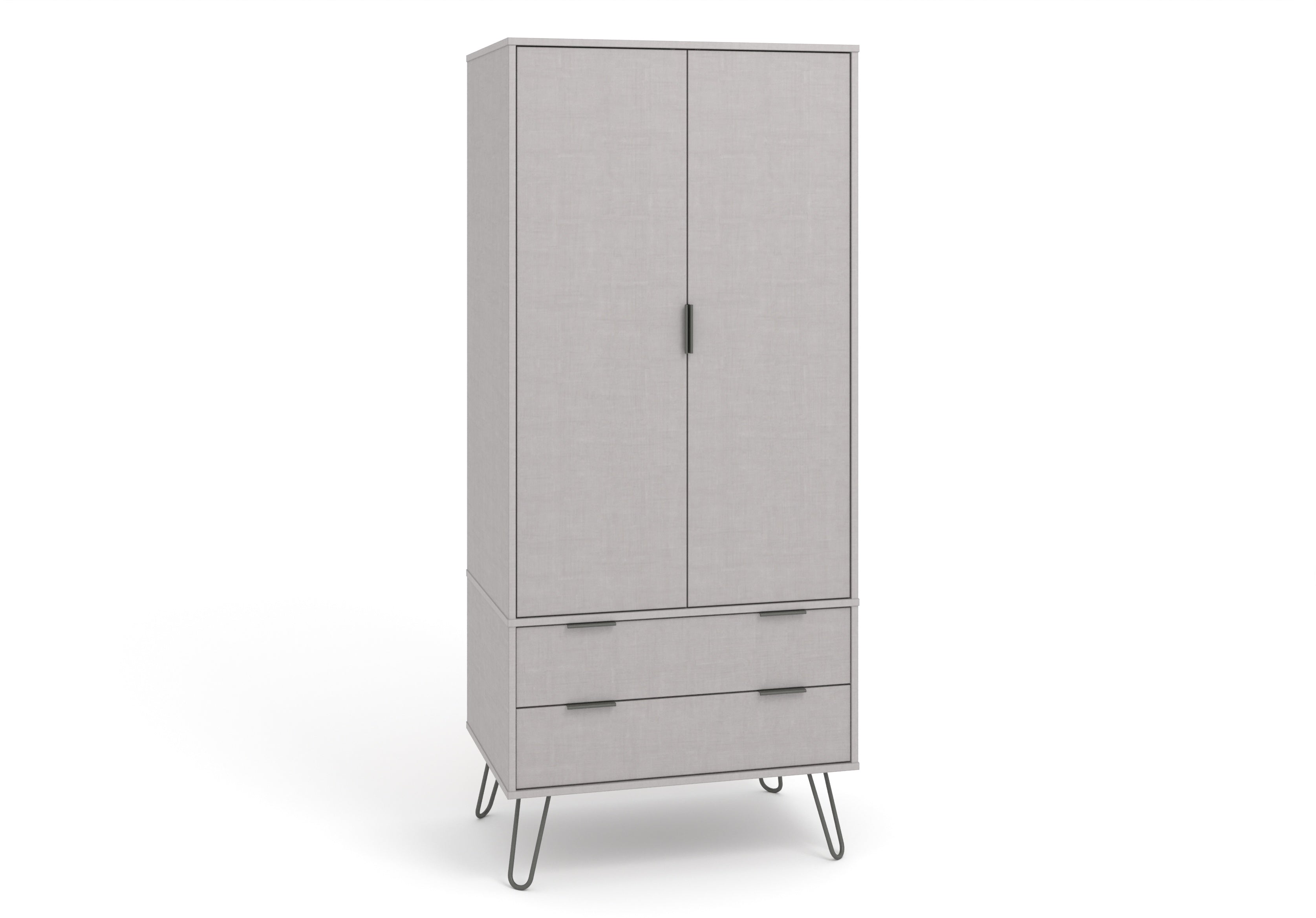 Compact and practical, this industrial look wardrobe offers plenty of drawer space along with a generous hanging space, all finished in an antique wax finish with plastic pull handles and metal feet.