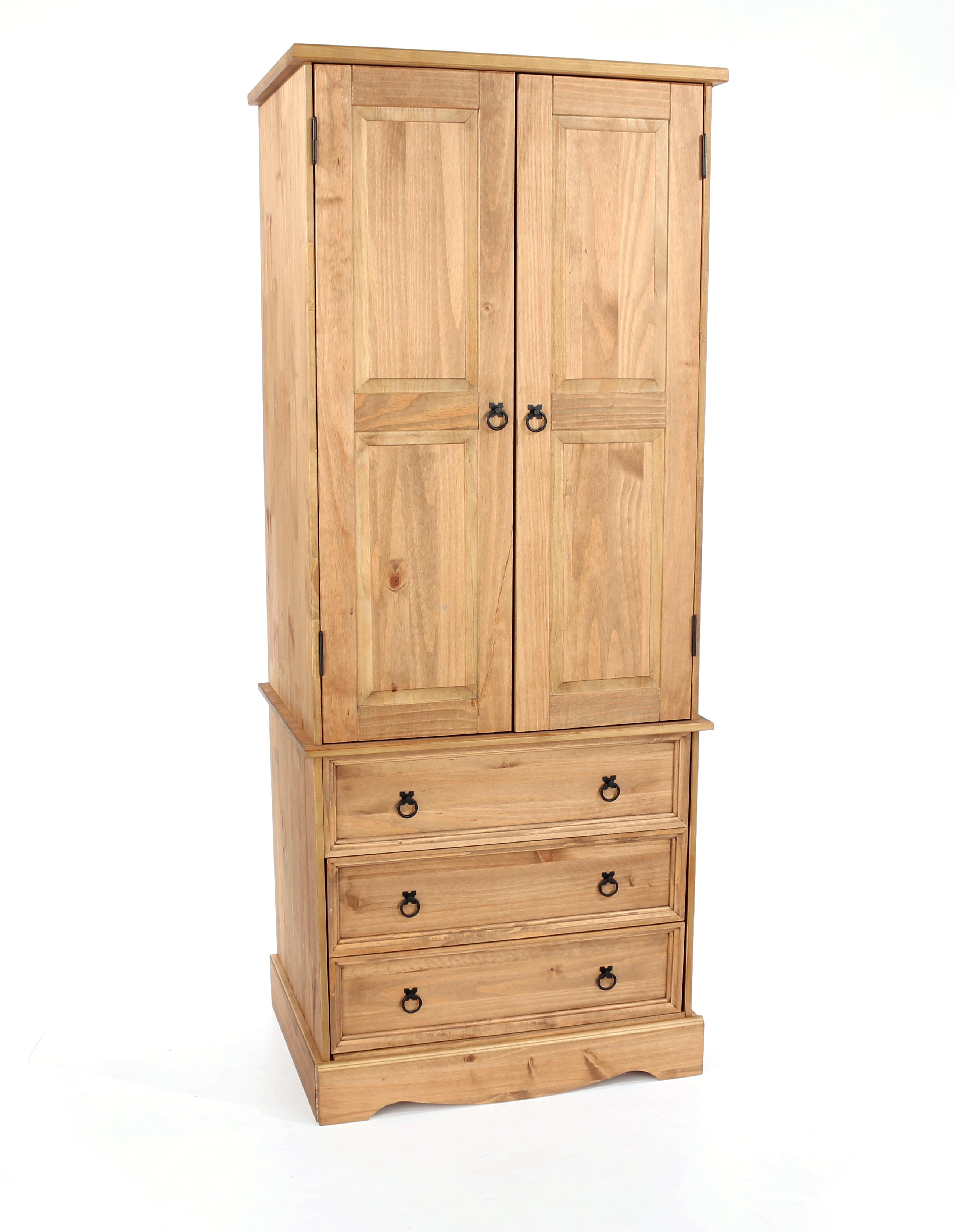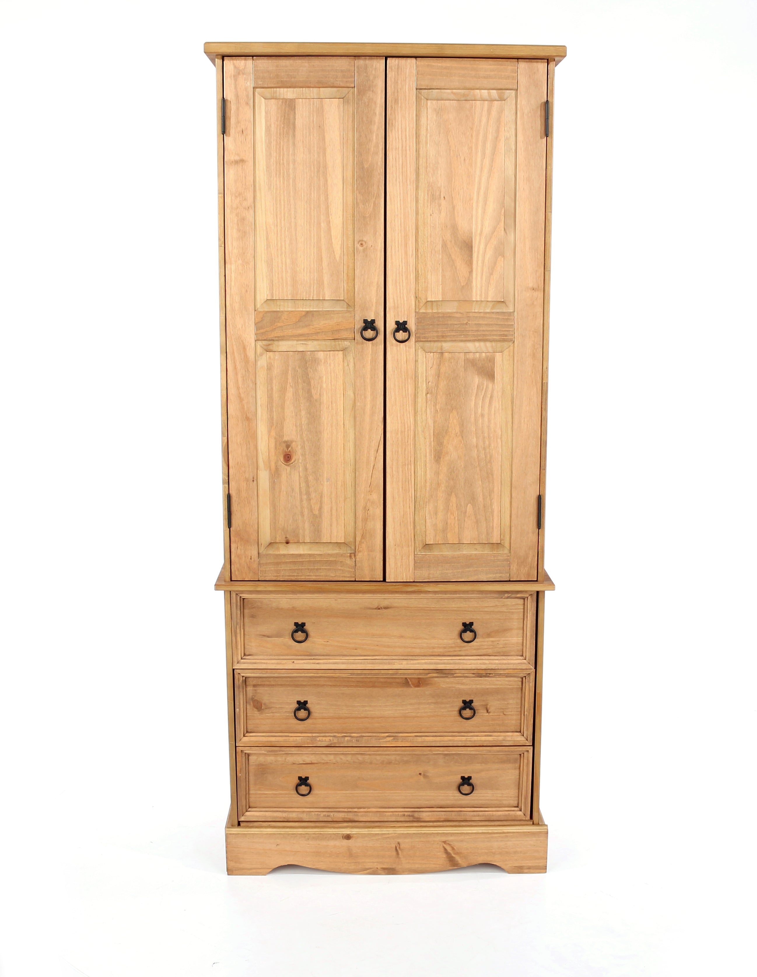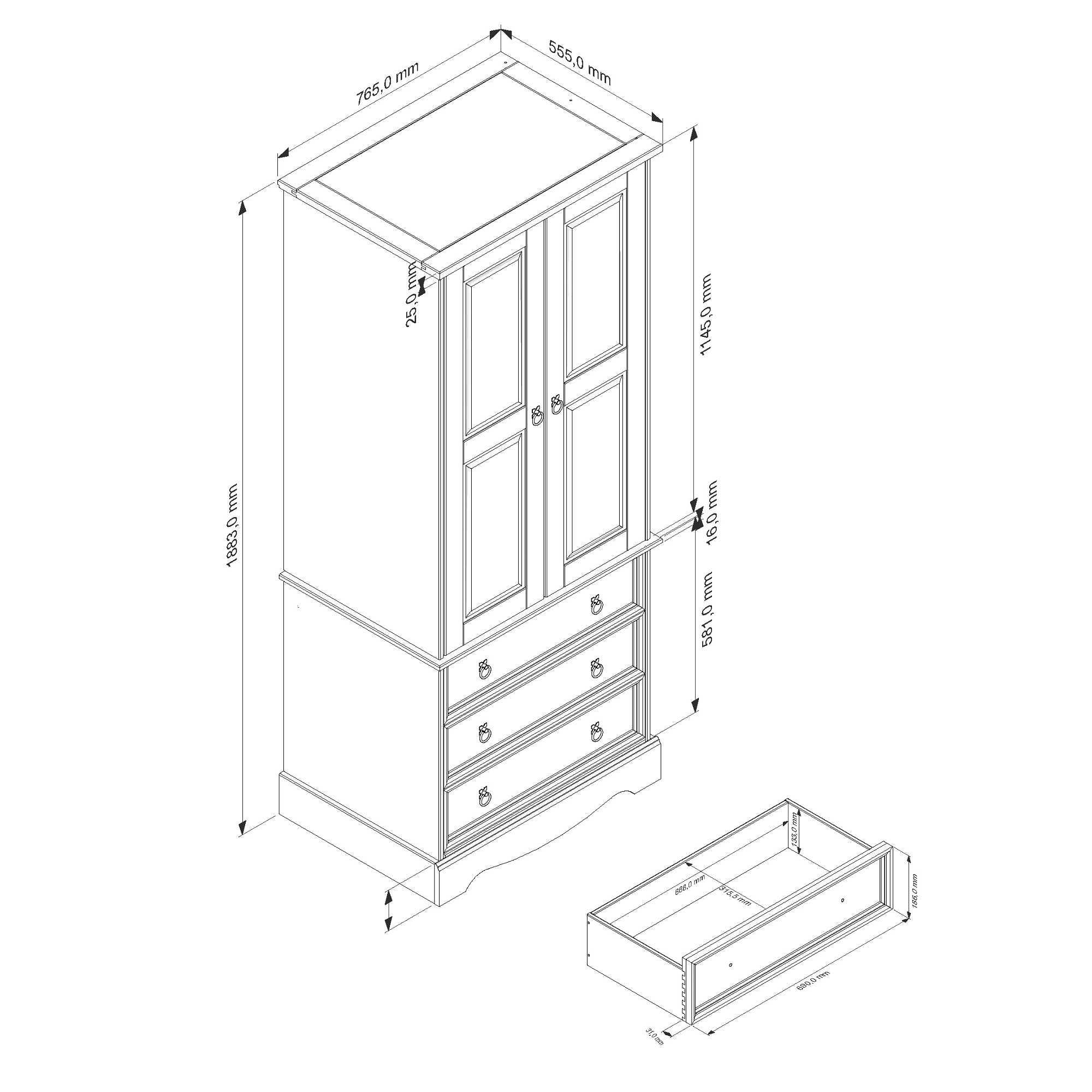 Combining 3 drawer storage and useful hanging space all into one wardrobe finished in antique wax with black metal hardware, this wardrobe offers practical elegance for your bedroom.