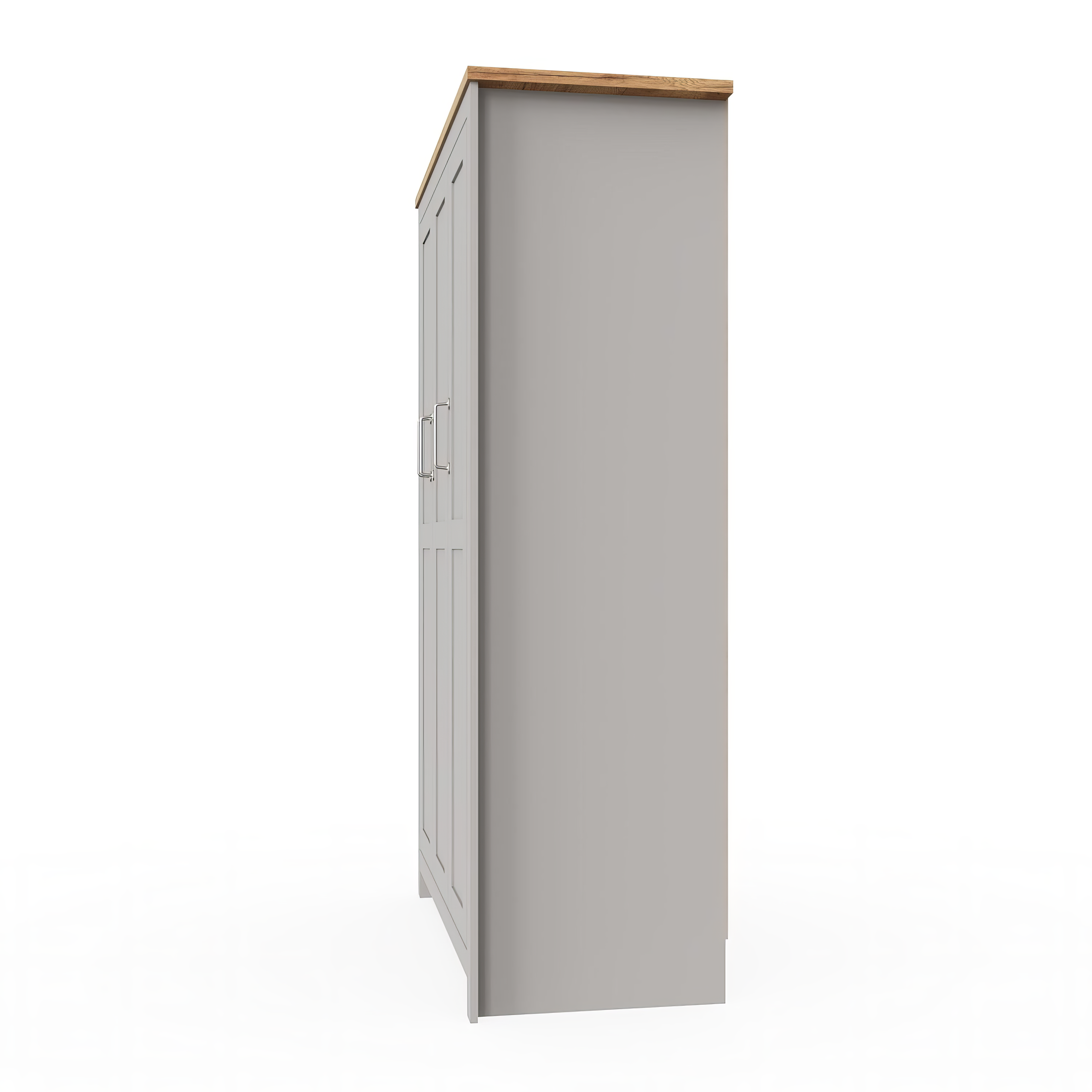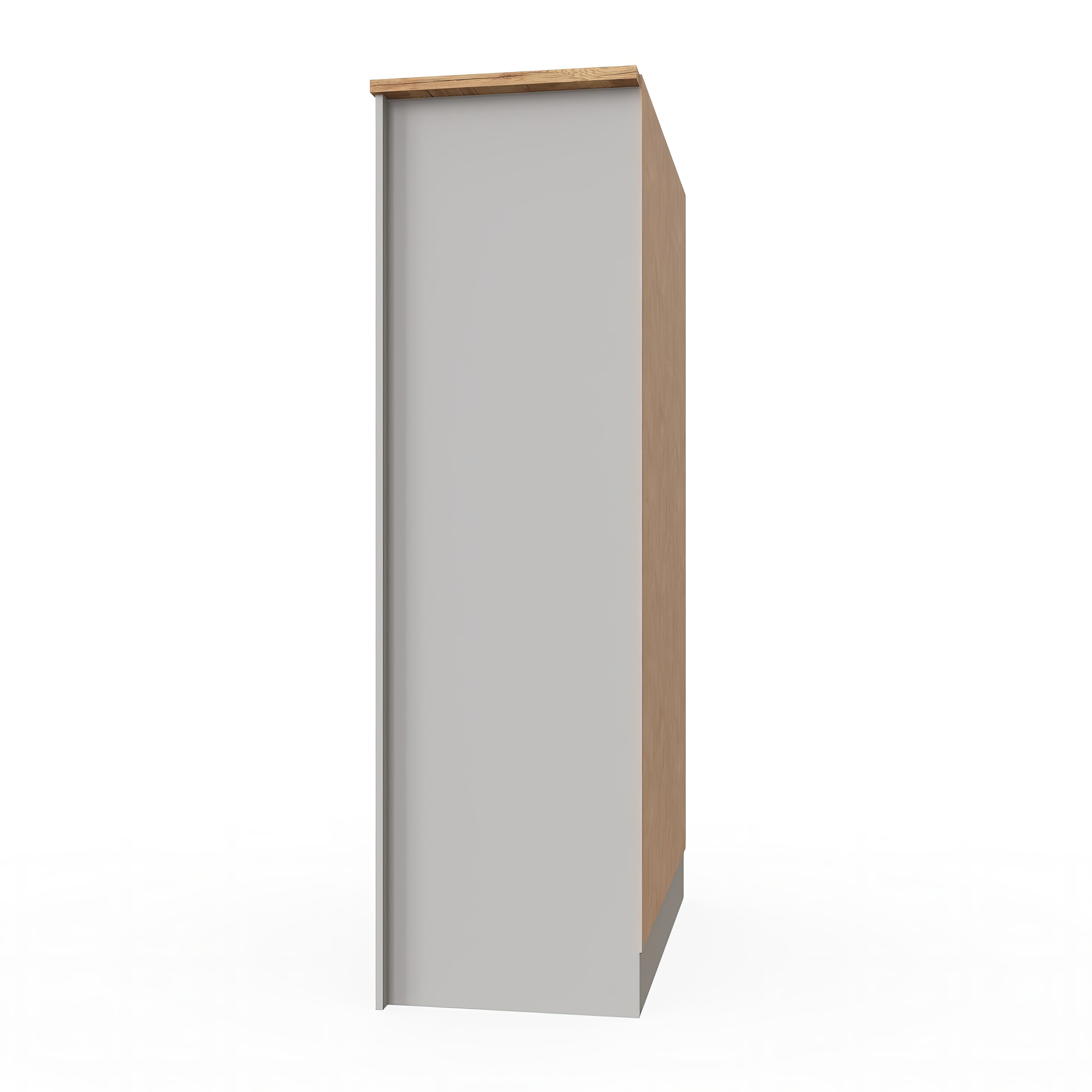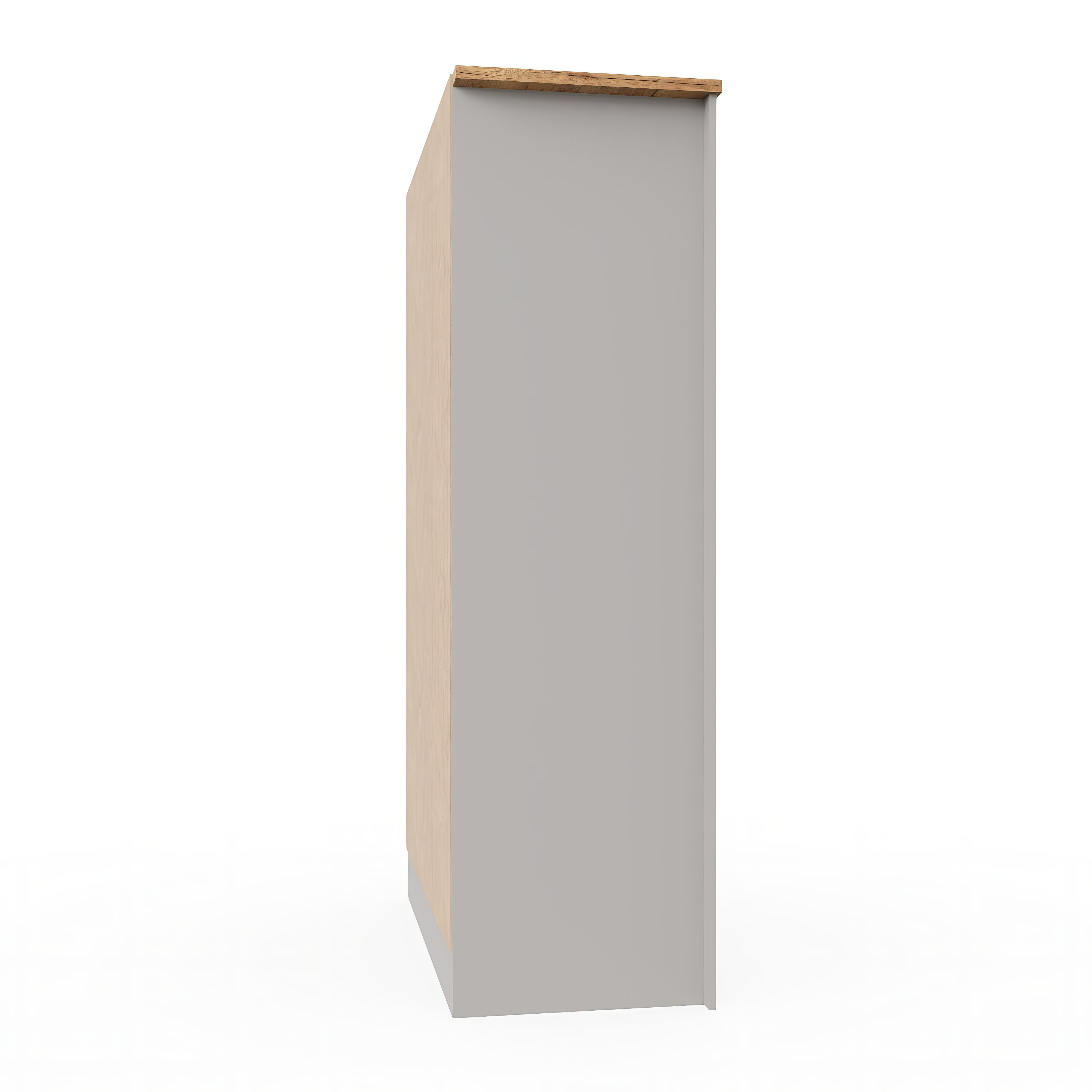 This wardrobe boasts a soft cream finish on its frames, perfectly balanced by a contrasting oak effect top. The elegant steel handles and metal drawer runners enhance both the look and functionality, ensuring a premium feel.
