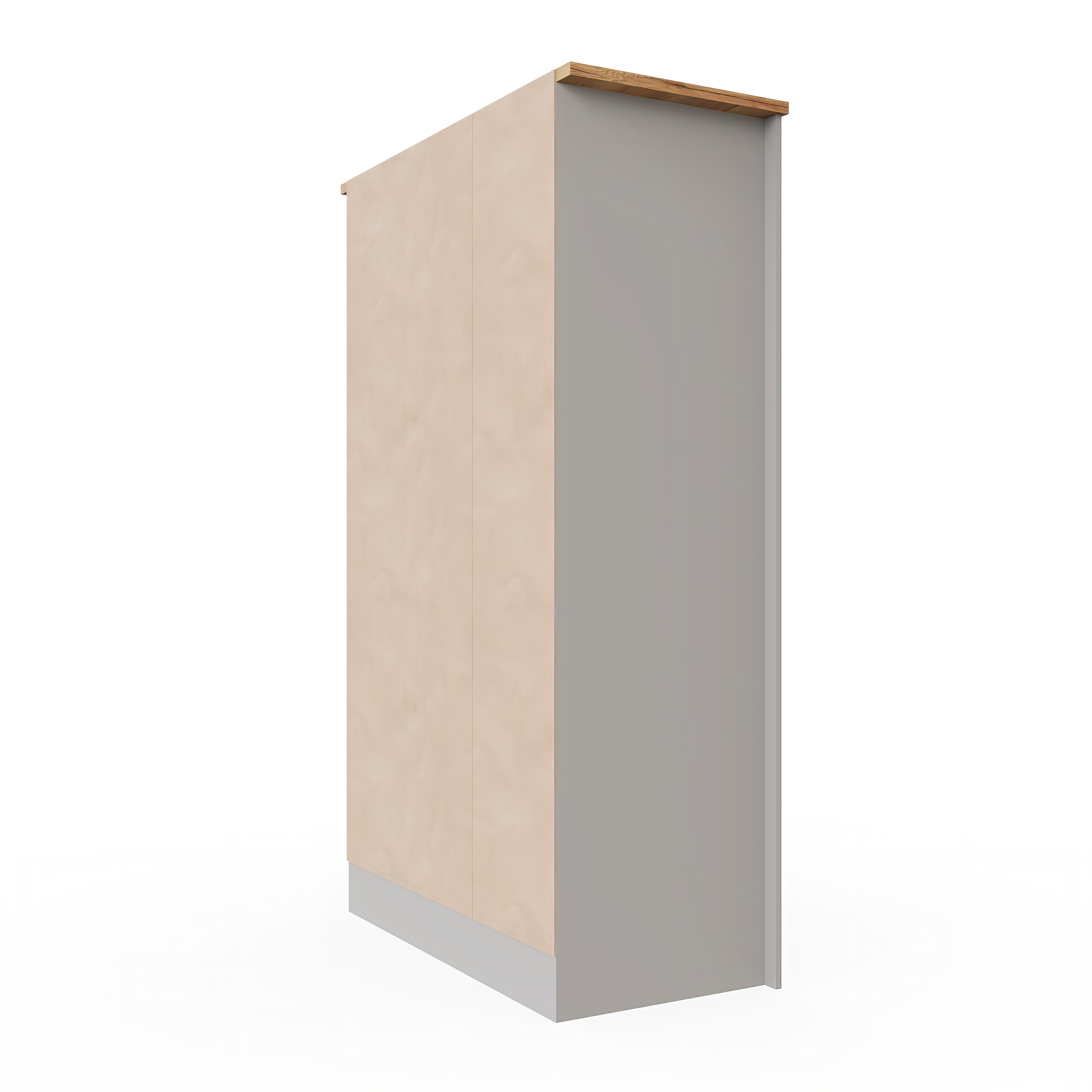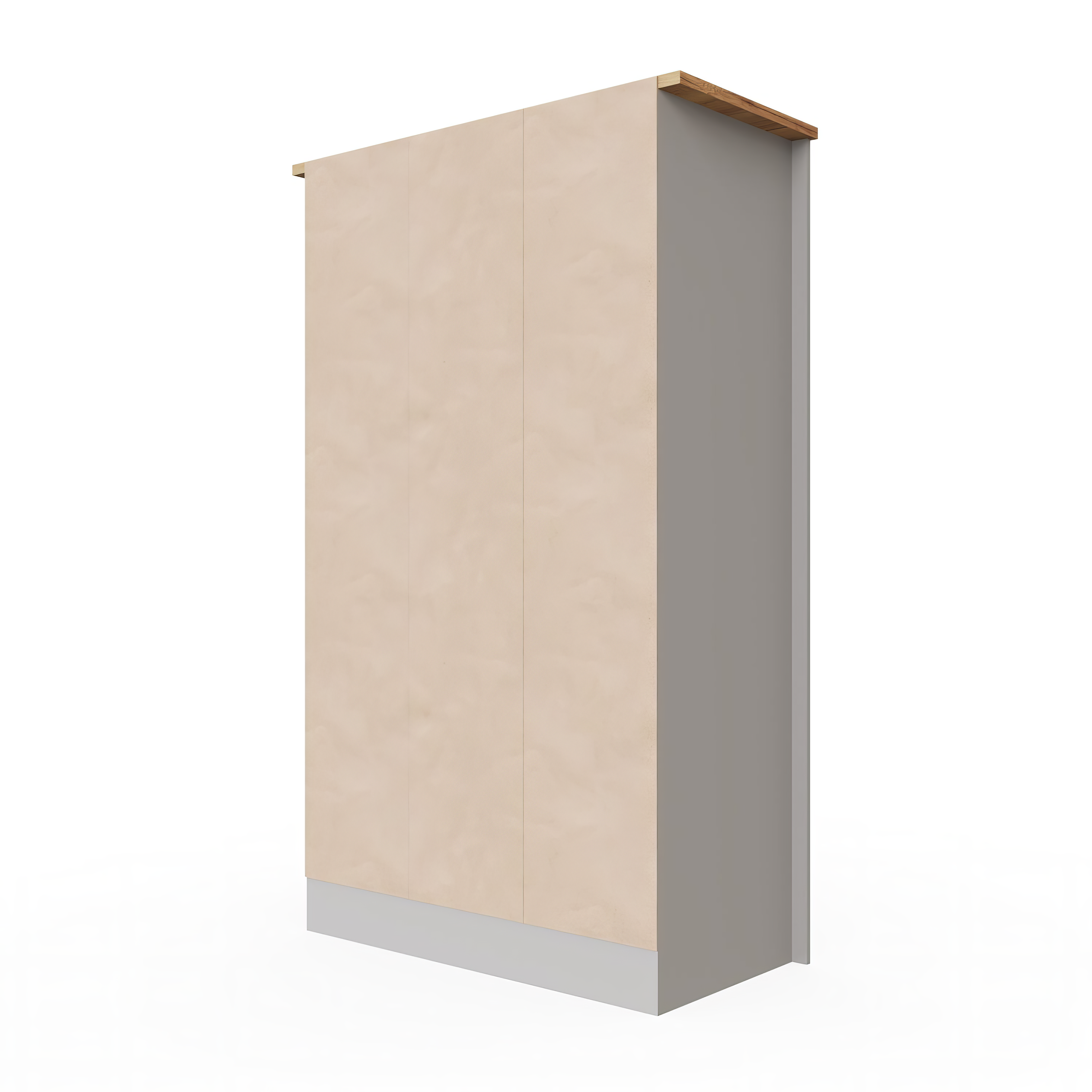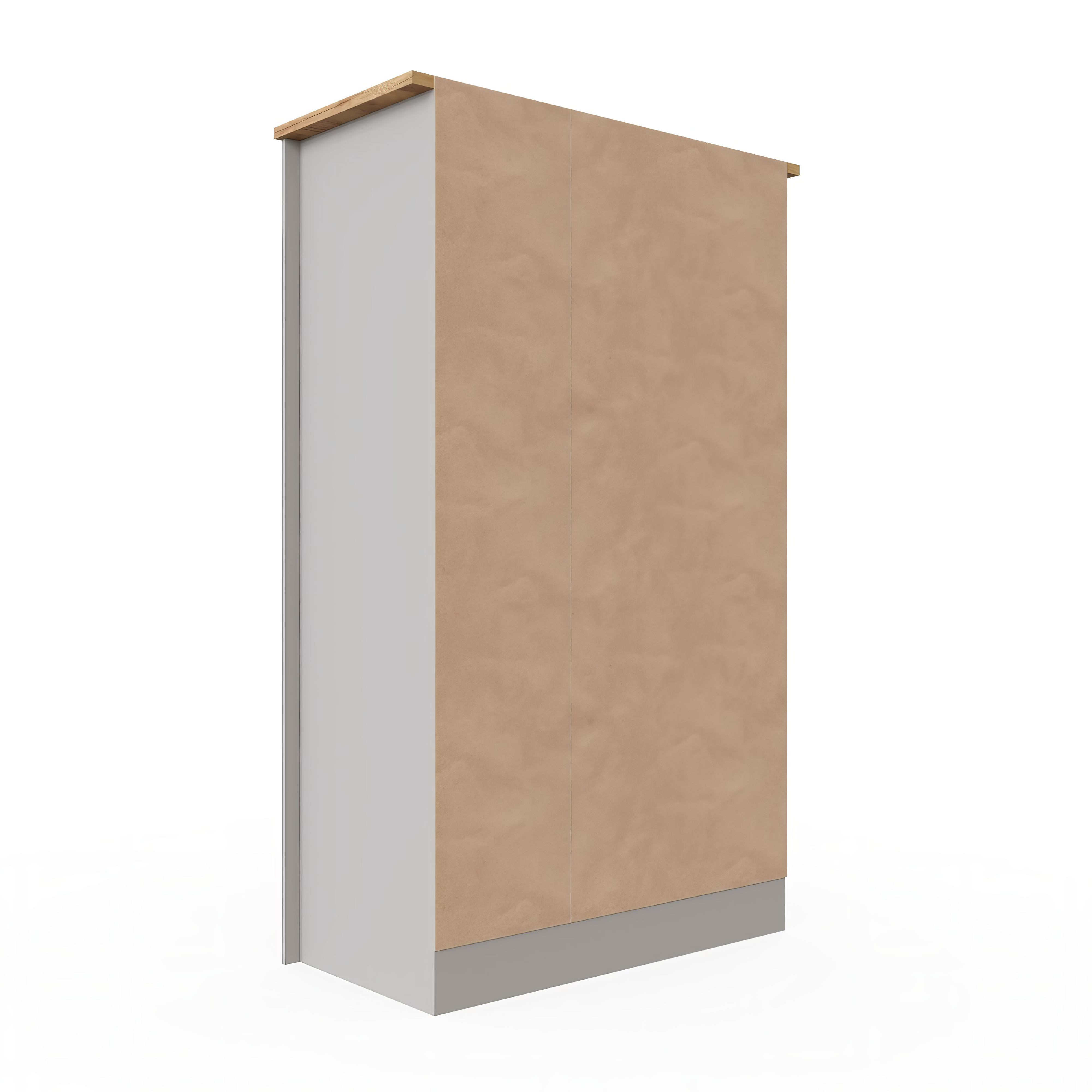 This wardrobe boasts a soft cream finish on its frames, perfectly balanced by a contrasting oak effect top. The elegant steel handles and metal drawer runners enhance both the look and functionality, ensuring a premium feel.