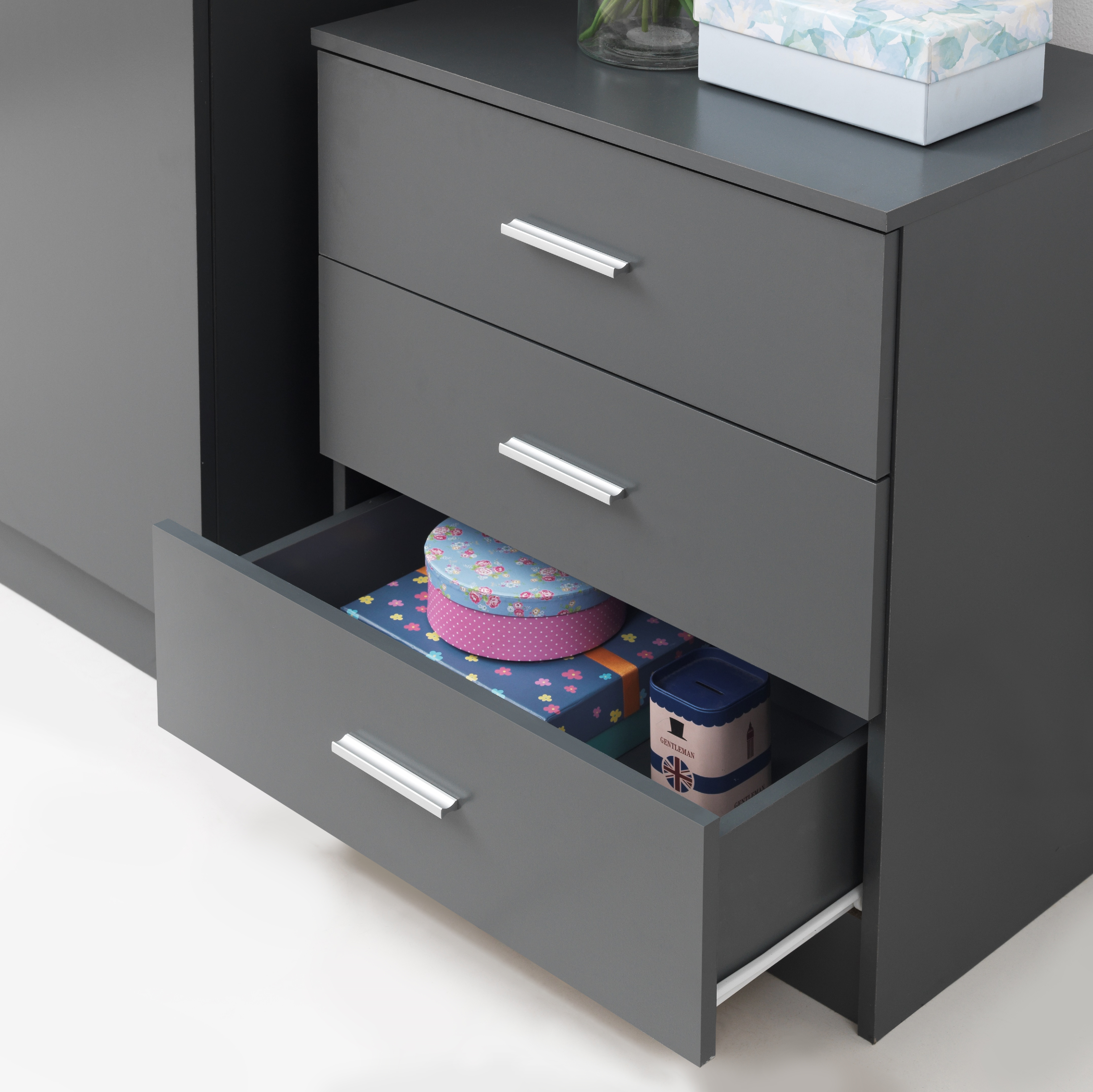 • Three spacious drawers provide generous storage for folded garments and essentials.