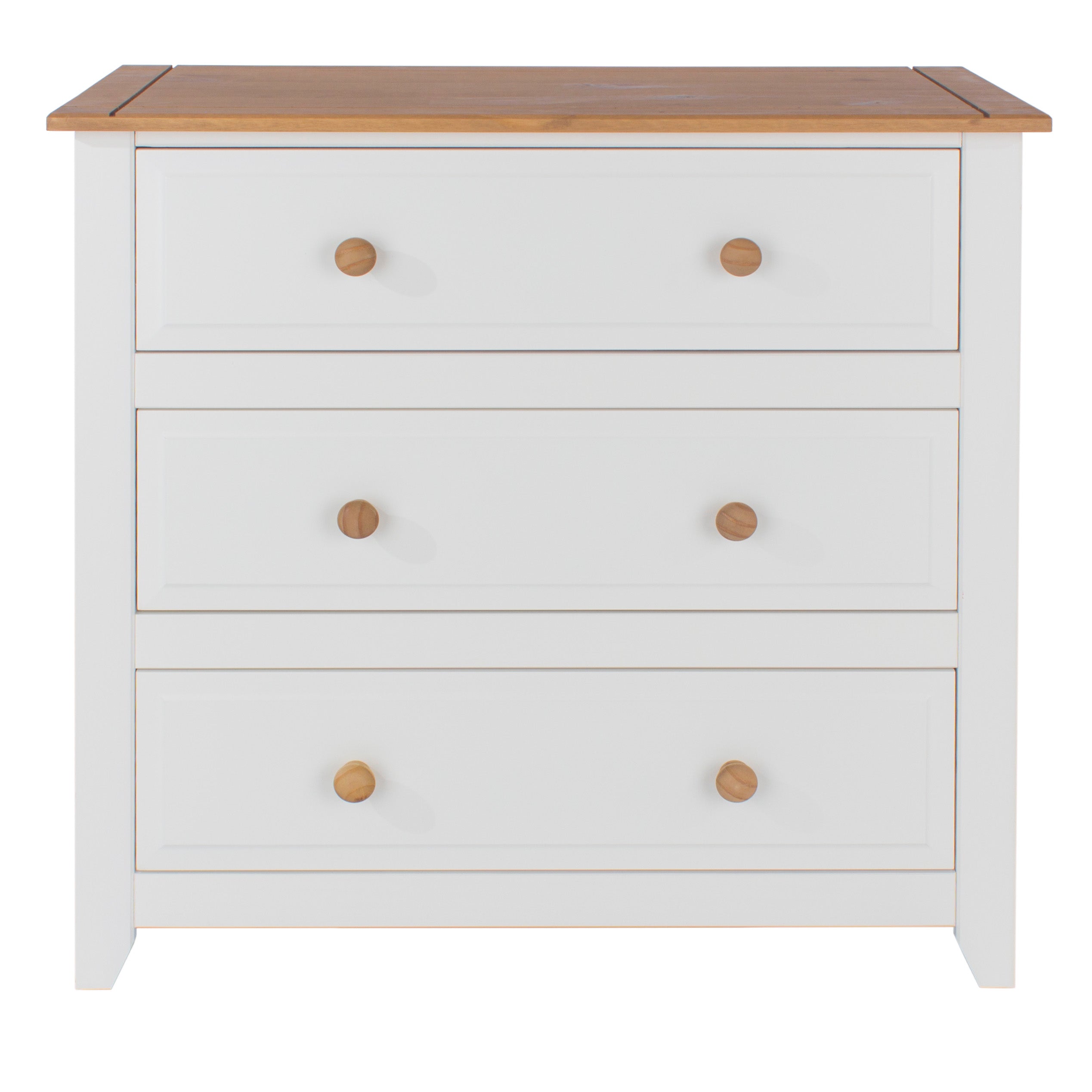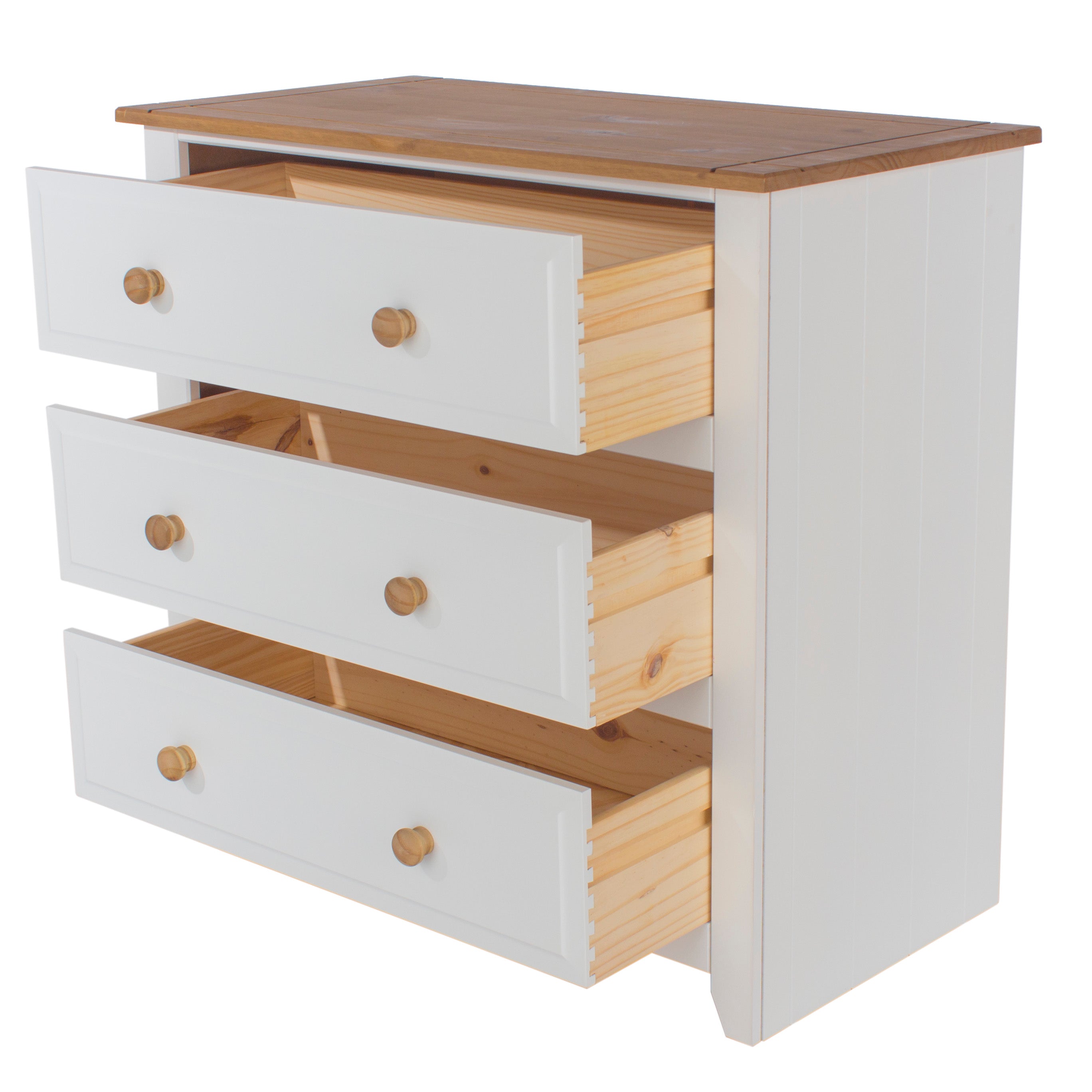 Ideal where space is a premium, our 3 drawer chest is finished in an arctic white paint with an antique waxed pine top and matching handles, offering practical storage with a stylish look.