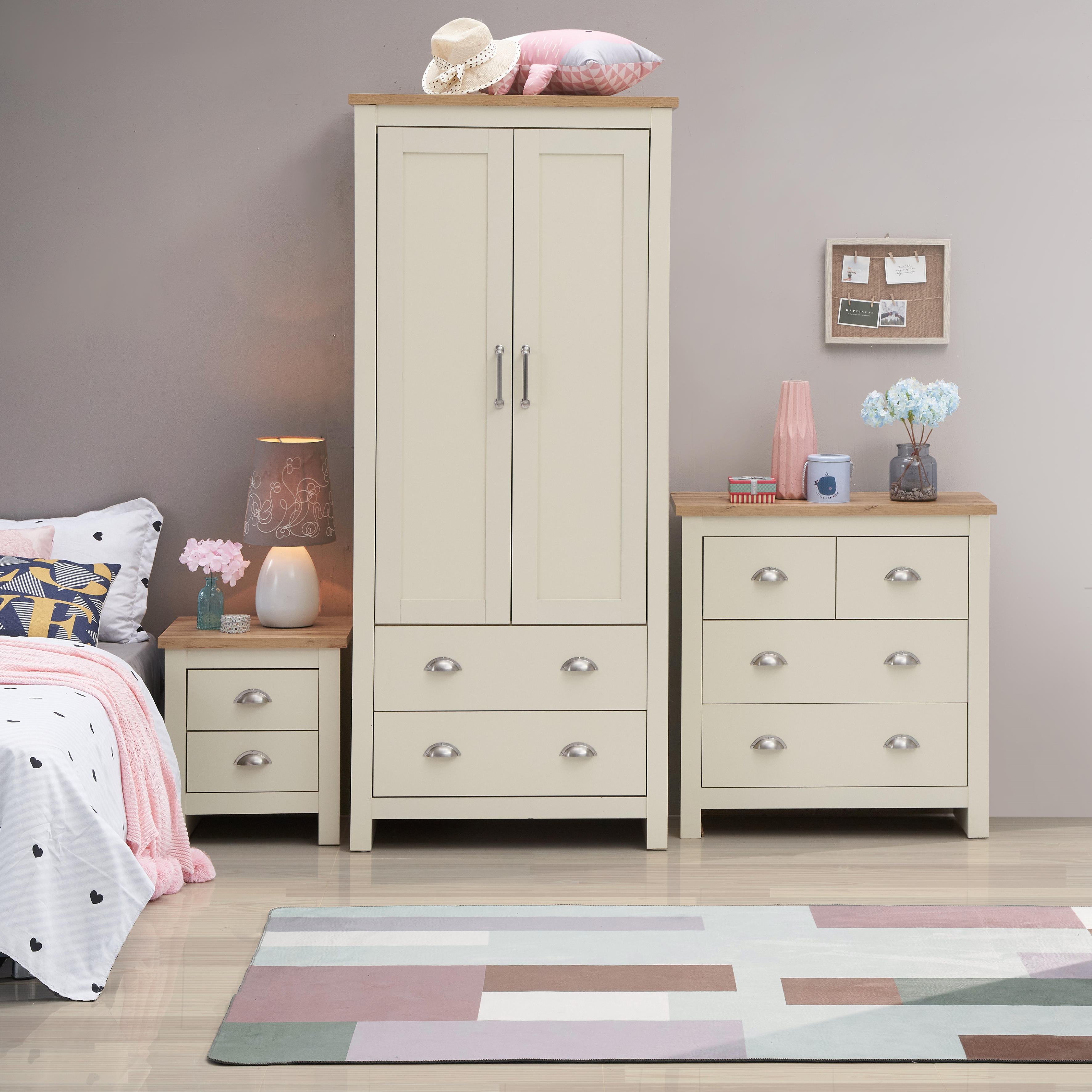 The set features sturdy particle board construction with cream or light grey frames complemented by oak-effect tops. Elegant steel handles and metal drawer runners add a refined finish and long-lasting performance.