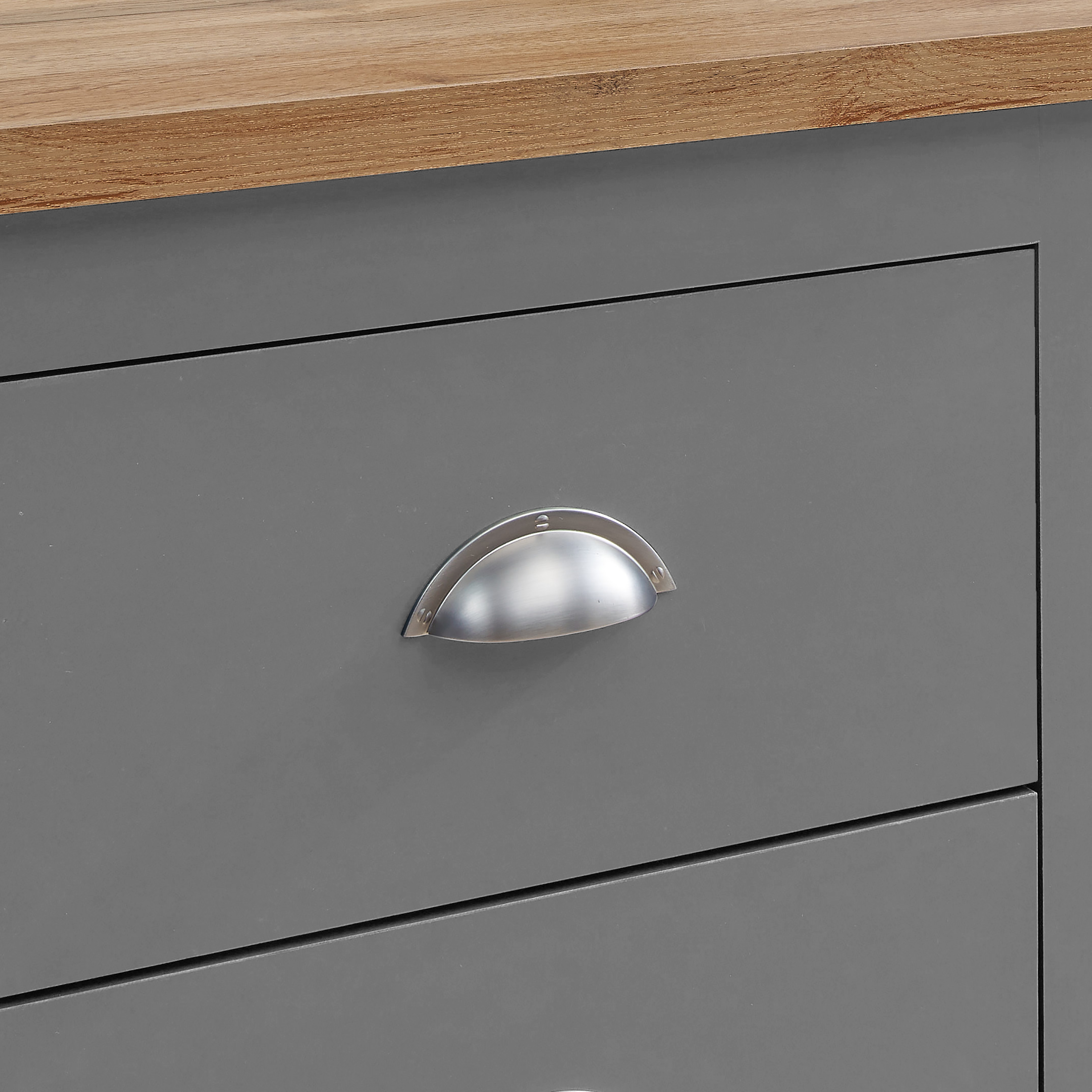 The set features sturdy particle board construction with cream or light grey frames complemented by oak-effect tops. Elegant steel handles and metal drawer runners add a refined finish and long-lasting performance.