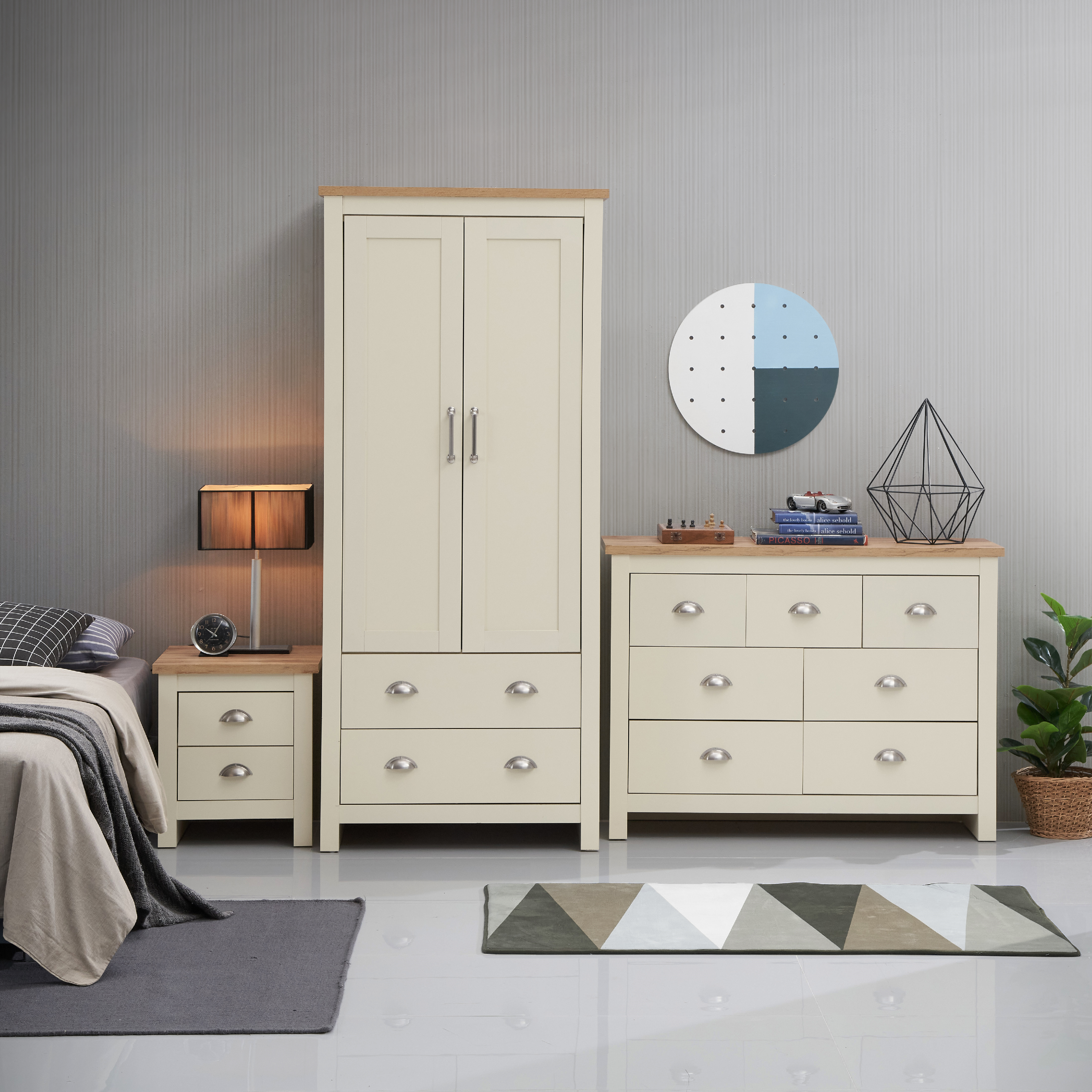 Bring warmth and comfort to your bedroom with the elegant Lisbon 3-Piece Bedroom Furniture Set. Featuring a harmonious blend of cream and light grey frames with contrasting oak effect tops, this collection combines modern style with practical storage solutions. Ideal for creating a well-organised and inviting space, each piece is designed to complement a variety of decor styles.