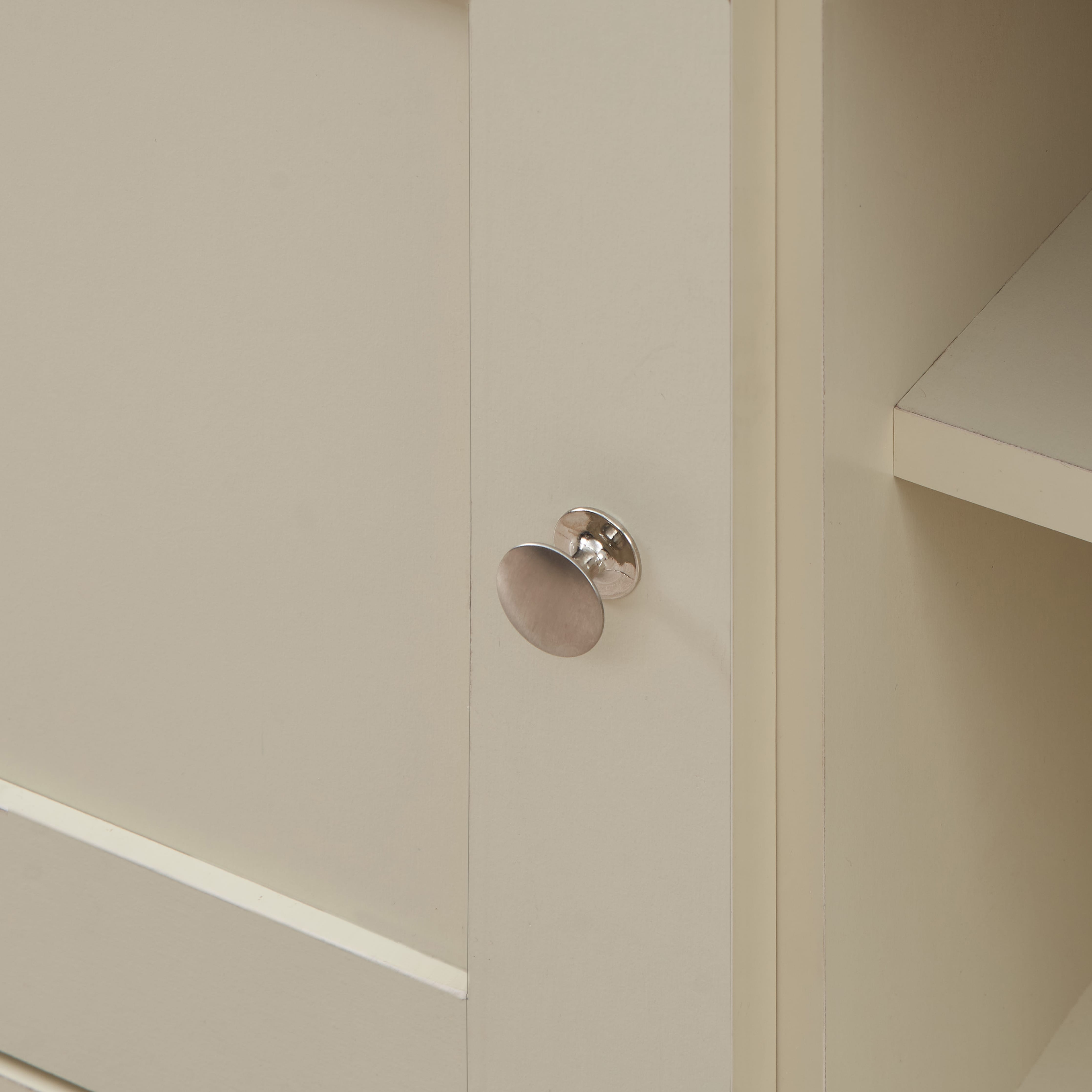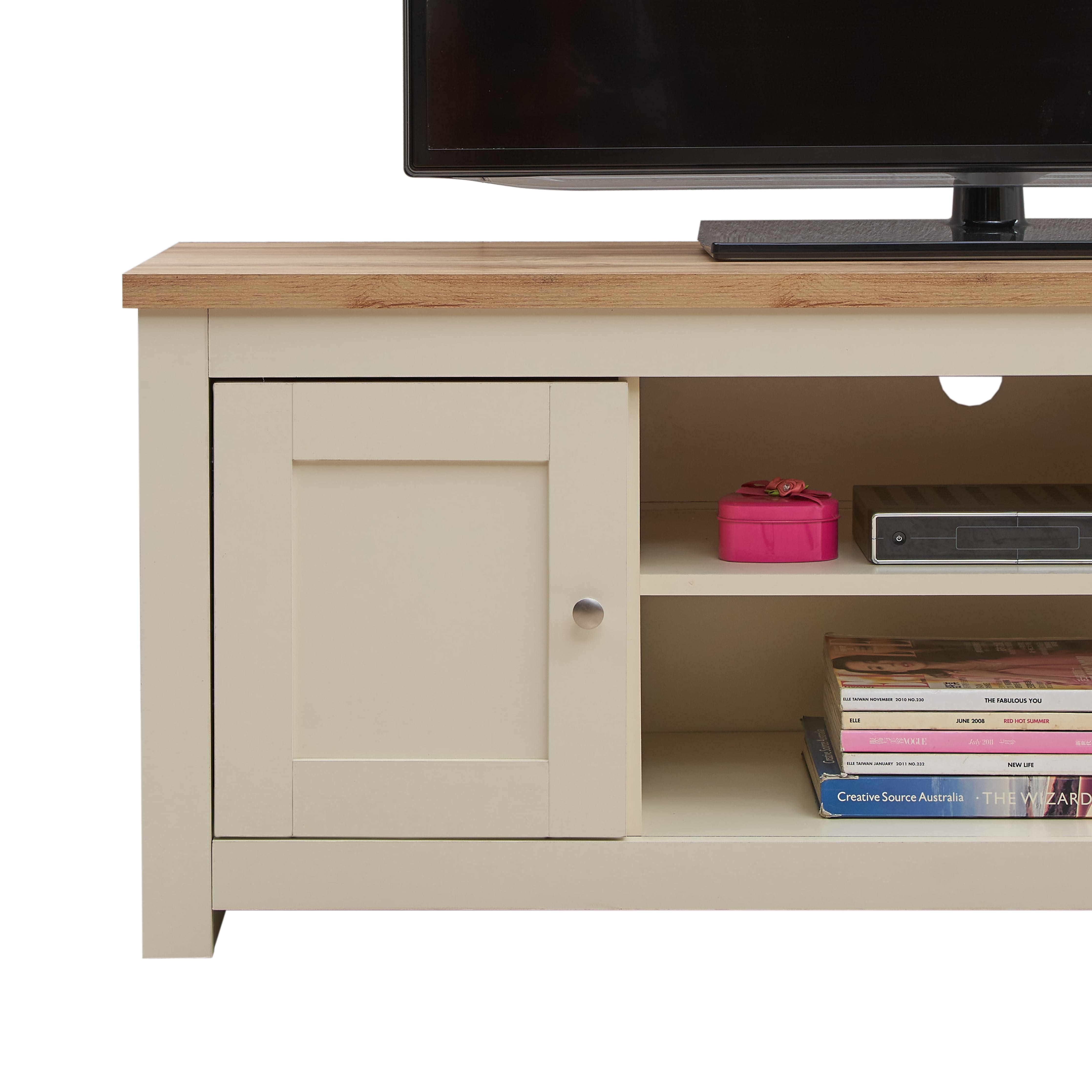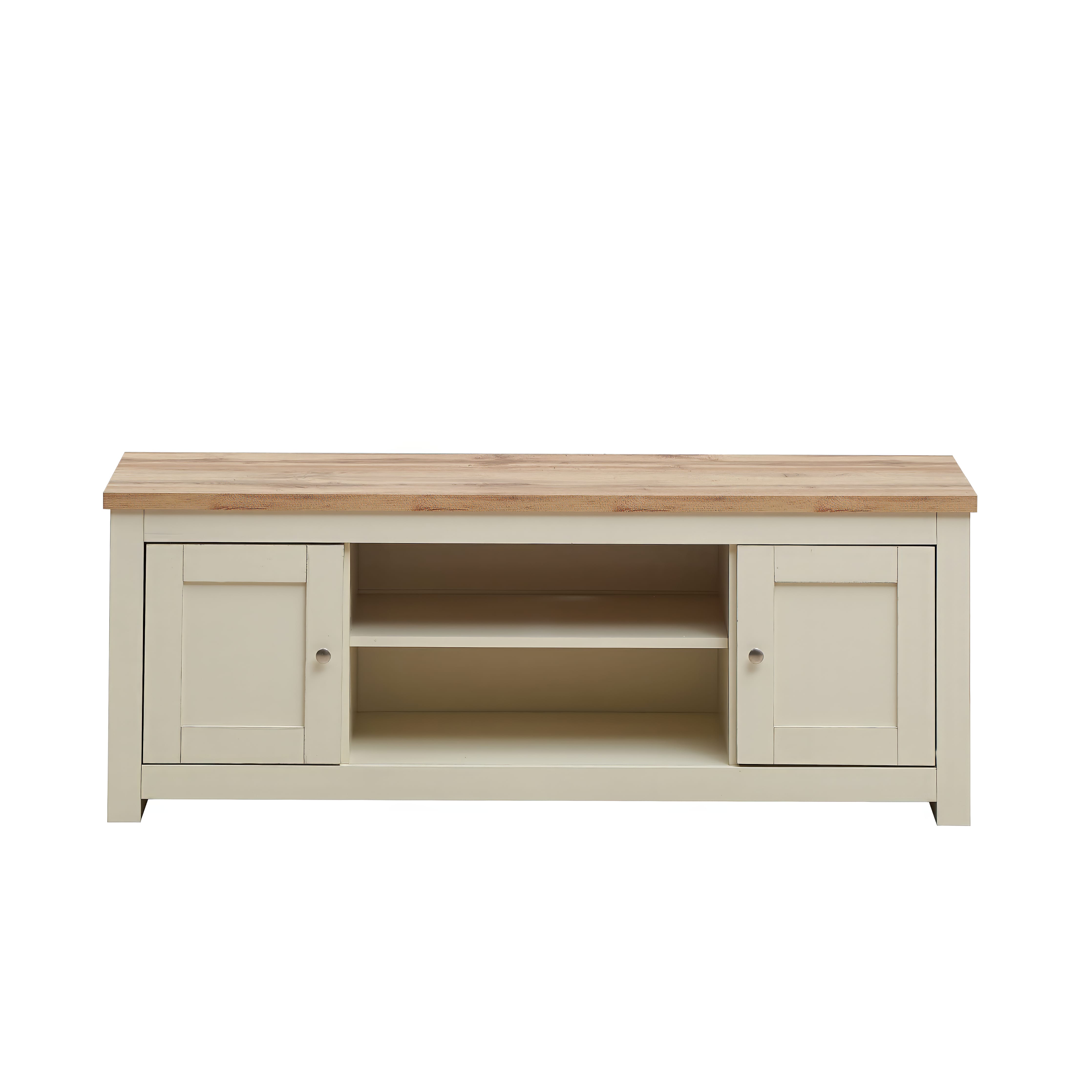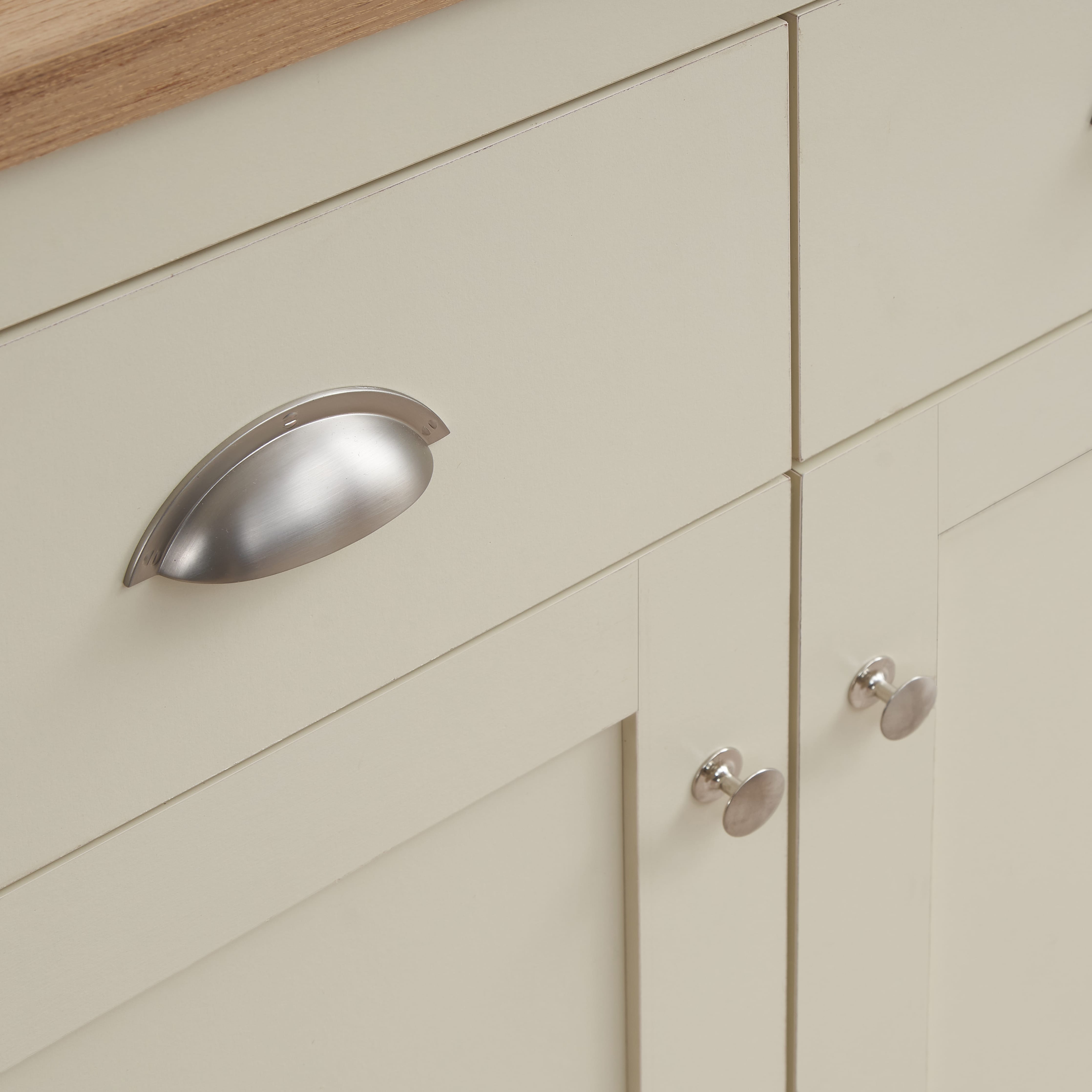 The set is finished in a creamy shade complemented by oak-effect tops, blending traditional charm with contemporary style to enhance your living room décor.