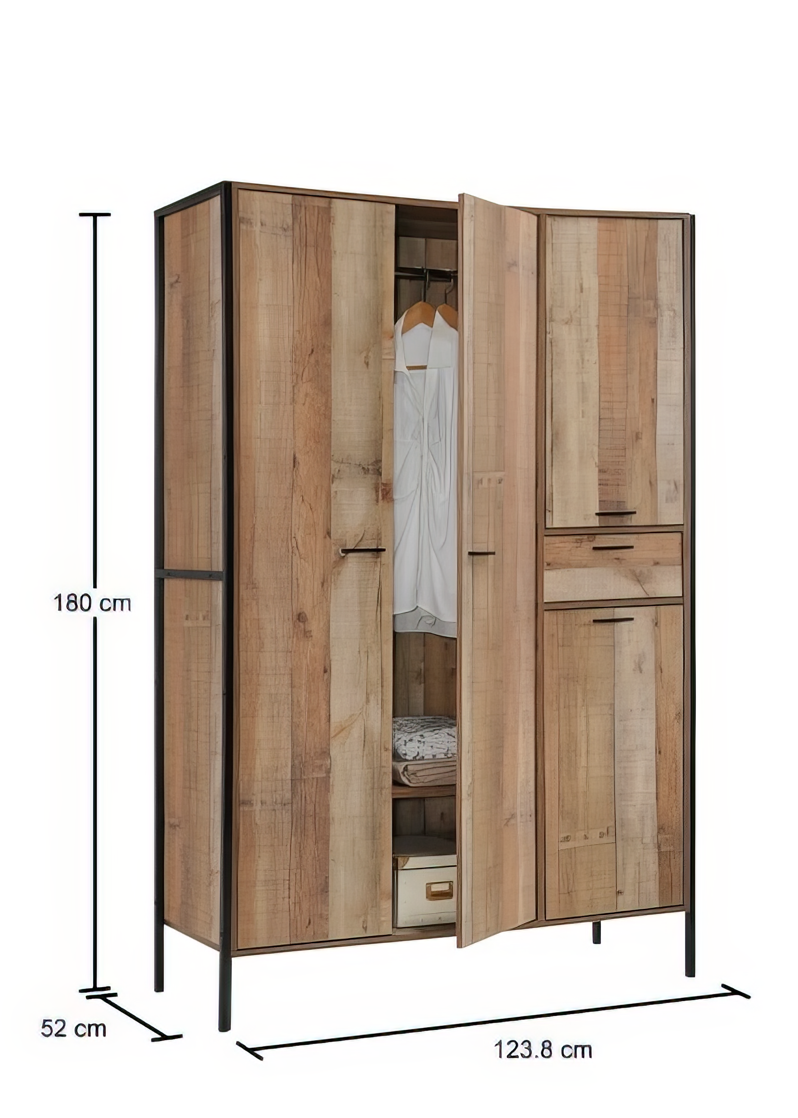 The Stretton Large 4 door wardrobe delivers a striking rustic industrial combination of distressed-look oak effect panels. A bedroom wardrobe designed to give your room a warm modern feel, the Large Stretton Wardrobe has a four doors and one drawer. This stunning wardrobe offers ample storage space for your clothes. Rustic Design 4 Door & 1 Drawer Wardrobe. With Hanging Rail & 2 Internal Shelves. Metal Handles, Hinges, Runners, Outer Frame and Legs. Measures: W124cm x H180cm x D52cm. Manufactured from particle board with a laminated wood effect paper foil finish. Each item comes flat packed for self assembly at home. Part of the Stretton Furniture Collection.