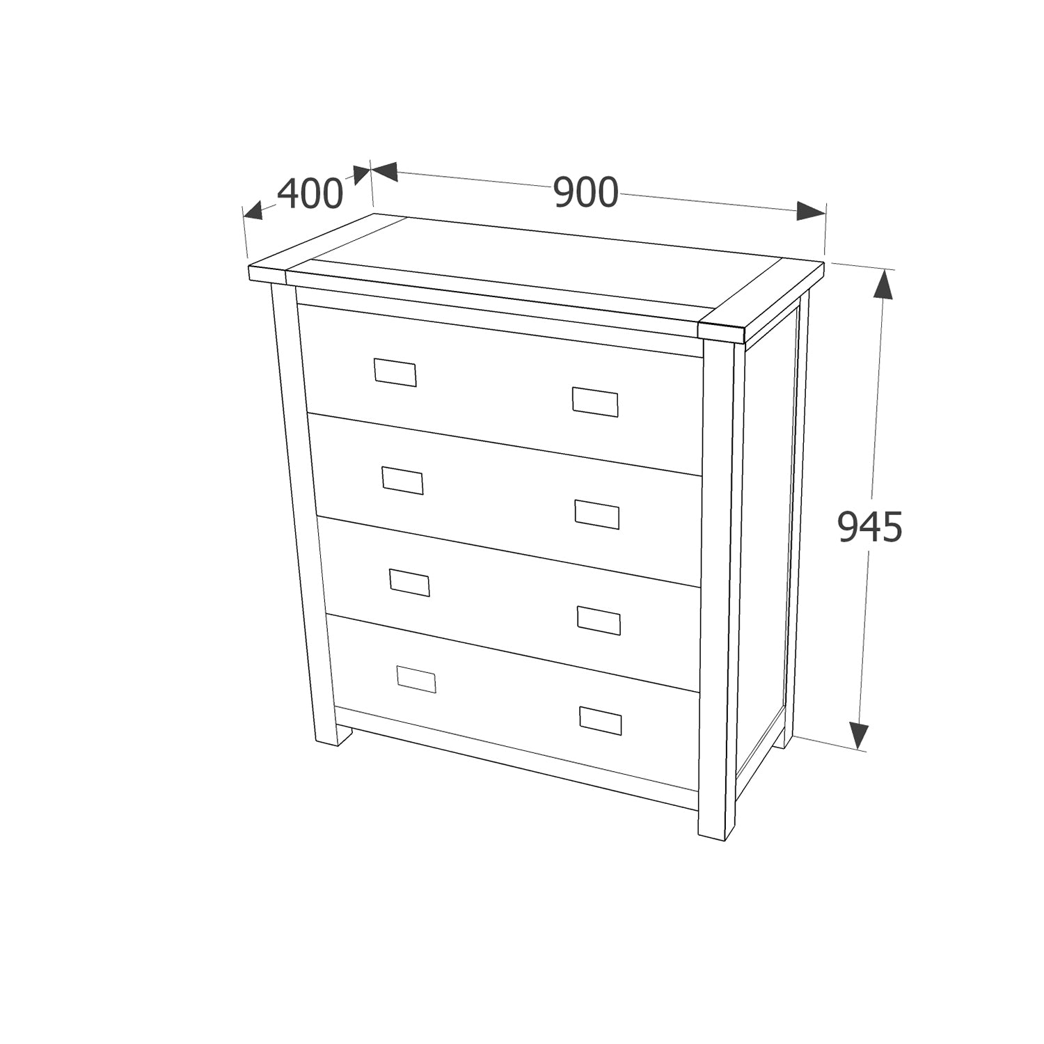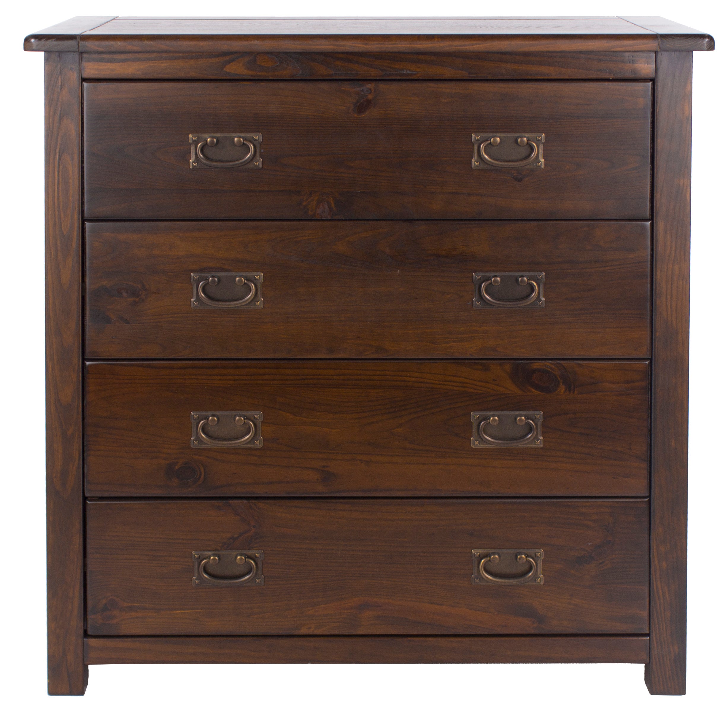 This handcrafted 4 drawer chest blends different woods with a rich dark lacquer finish and real metal handles, offering elegant storage with timeless appeal.