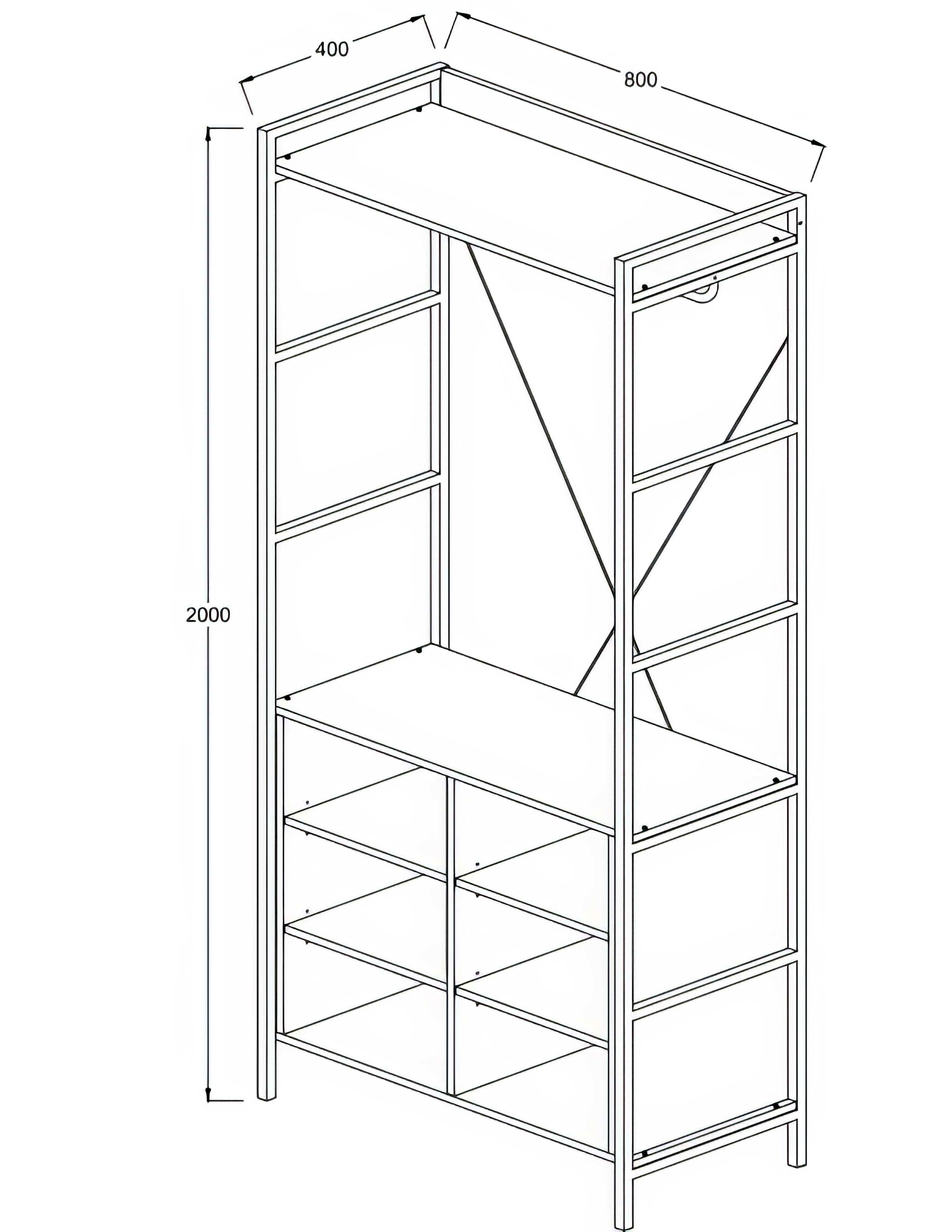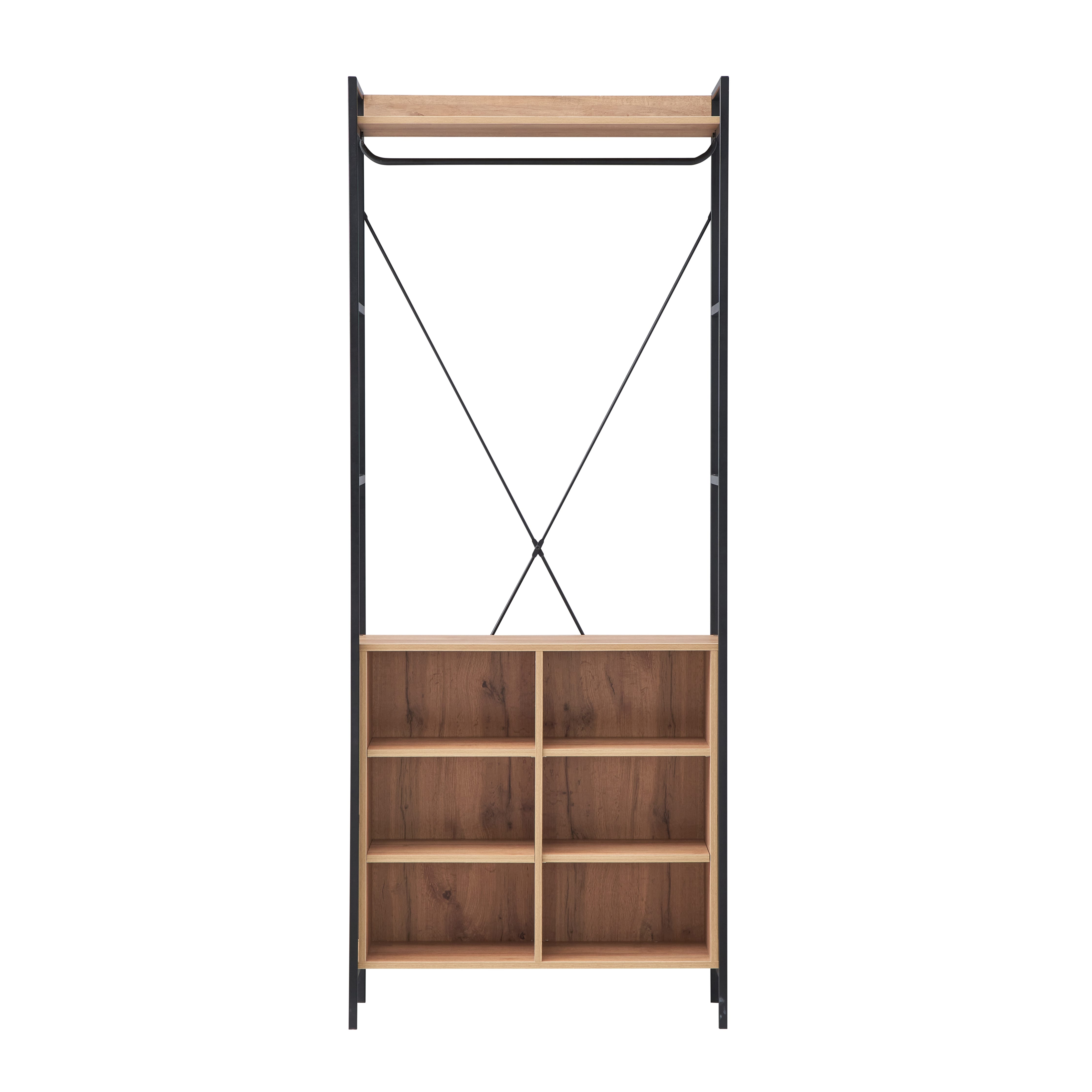 This Claire Open Wardrobe offers open storage and features a Light Oak Finish with Metallic Frames. This item includes a rail for hanging your shirts, suits, or dresses with an additional 8 shelves for extra storage.