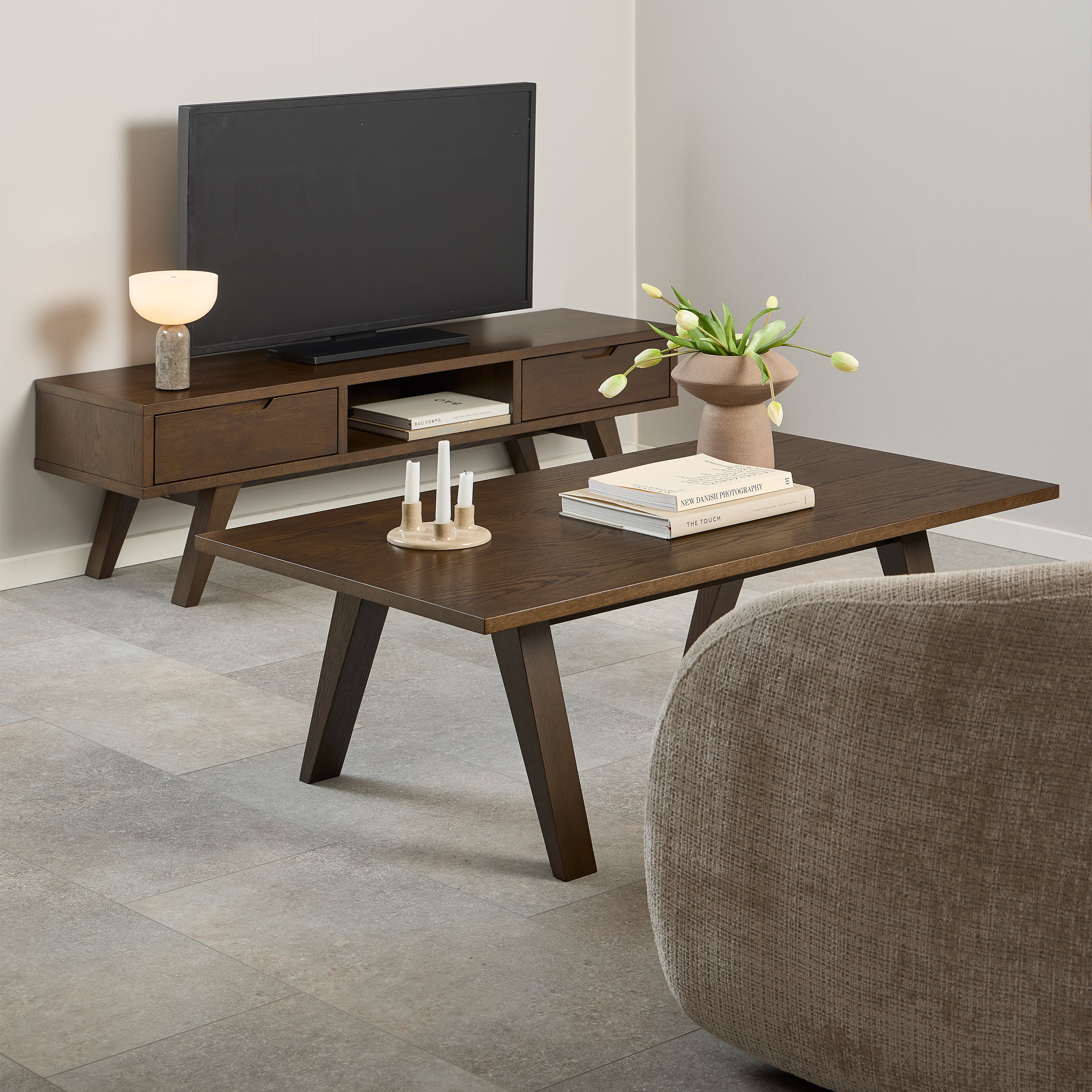 Enhance your living space with the A-Line Coffee Table, featuring a sleek Scandinavian design and a smoked oak veneer that adds warmth and style to any interior.