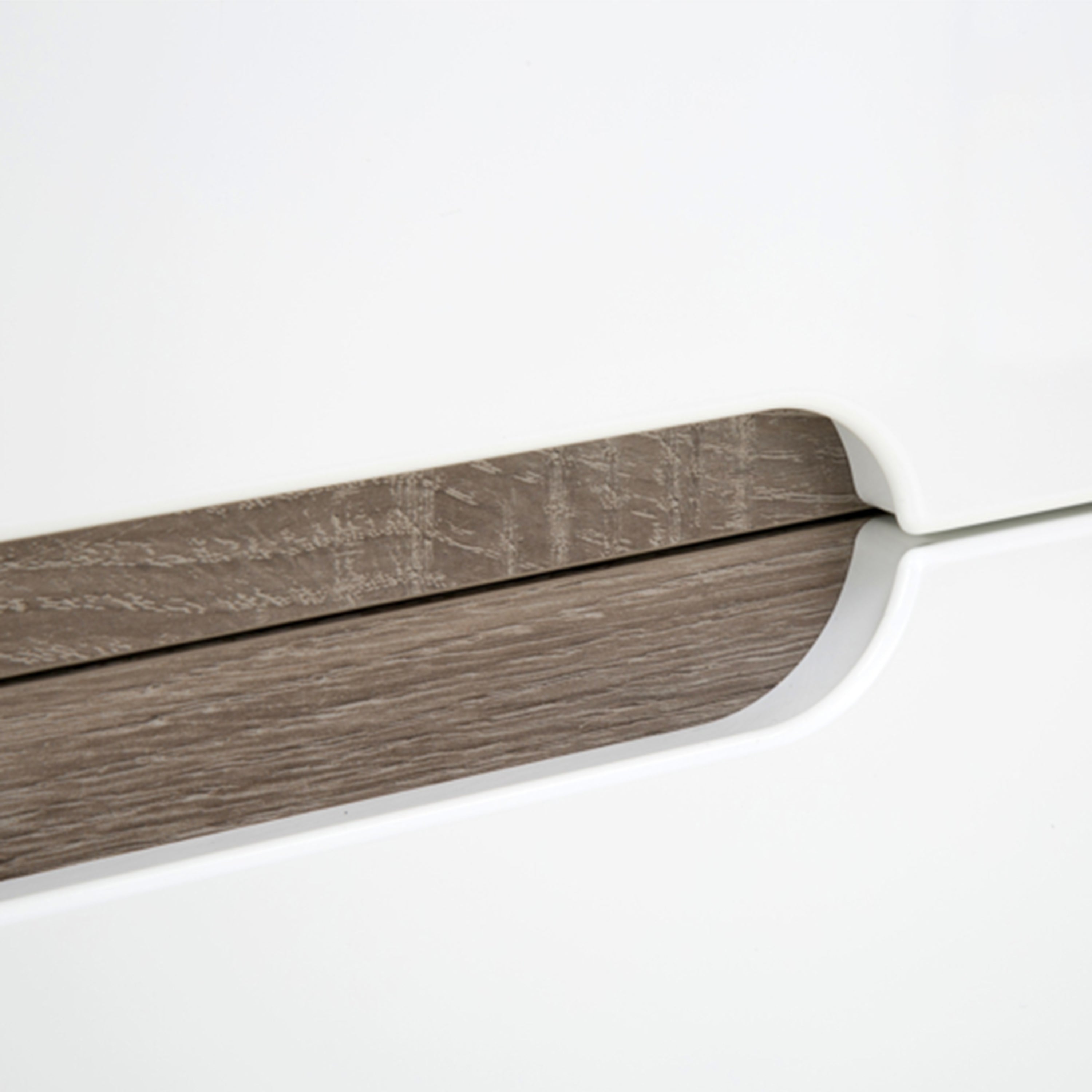 Finished in white with a truffle oak melamine trim, combining a high gloss and natural wood effect for a stylish look.