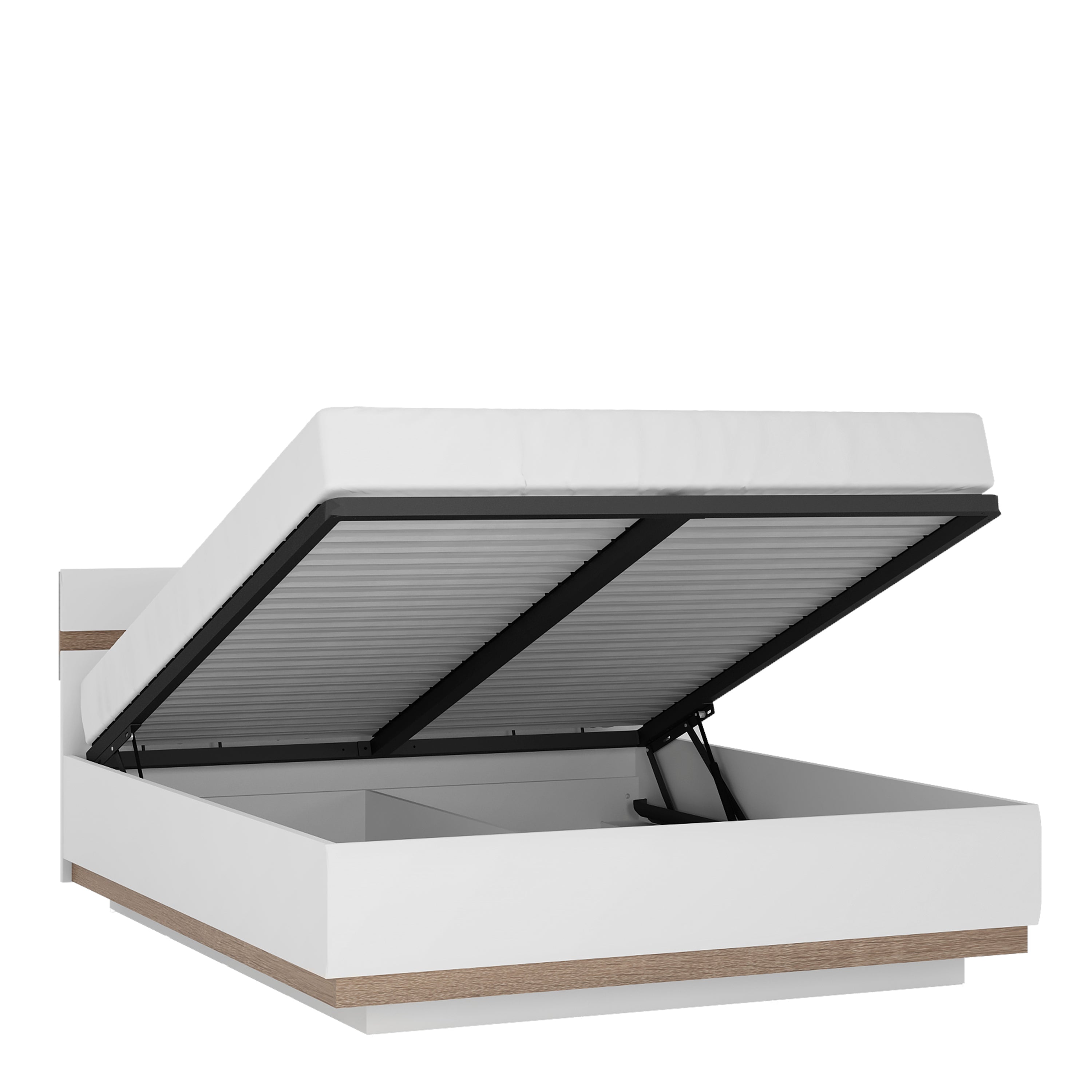 Discover the Chelsea Kingsize Bed, a stylish and practical addition to any modern bedroom. Featuring a sleek white high gloss finish with elegant oak trim, this bed combines contemporary design with clever lift-up storage to maximise space.
