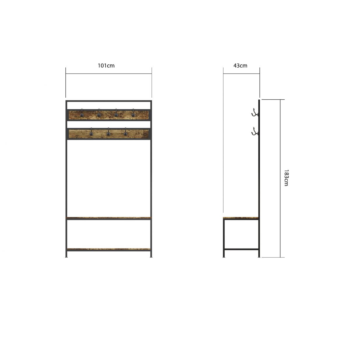 Finished in a warm walnut tone, the coat rack features a durable metal frame paired with a vintage-inspired wooden shelf, blending style with function.