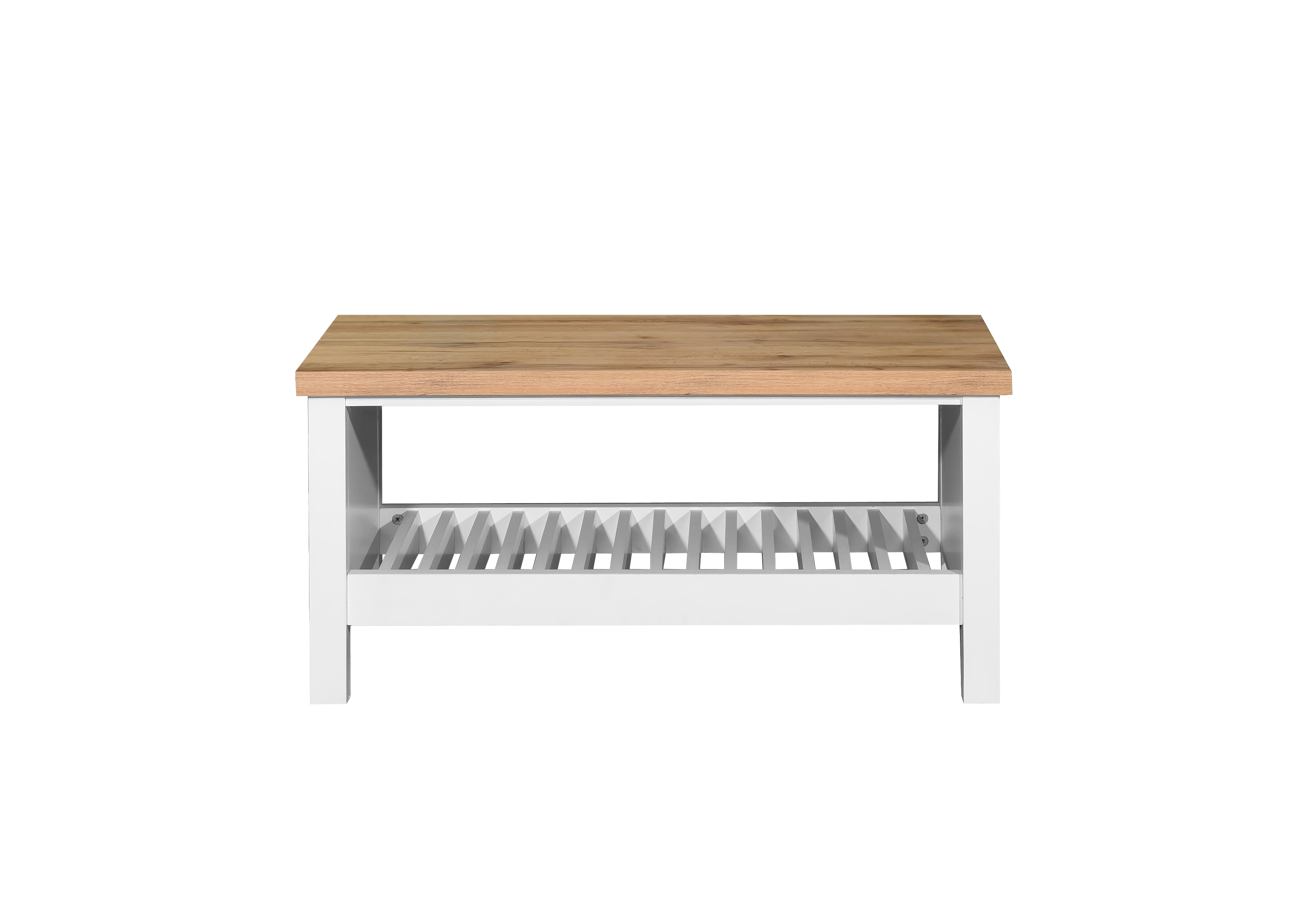 Bring a touch of British elegance to your living space with this stylish coffee table. Featuring a bright white frame contrasted by a warm oak top, it perfectly blends classic solid wood looks with modern design simplicity.