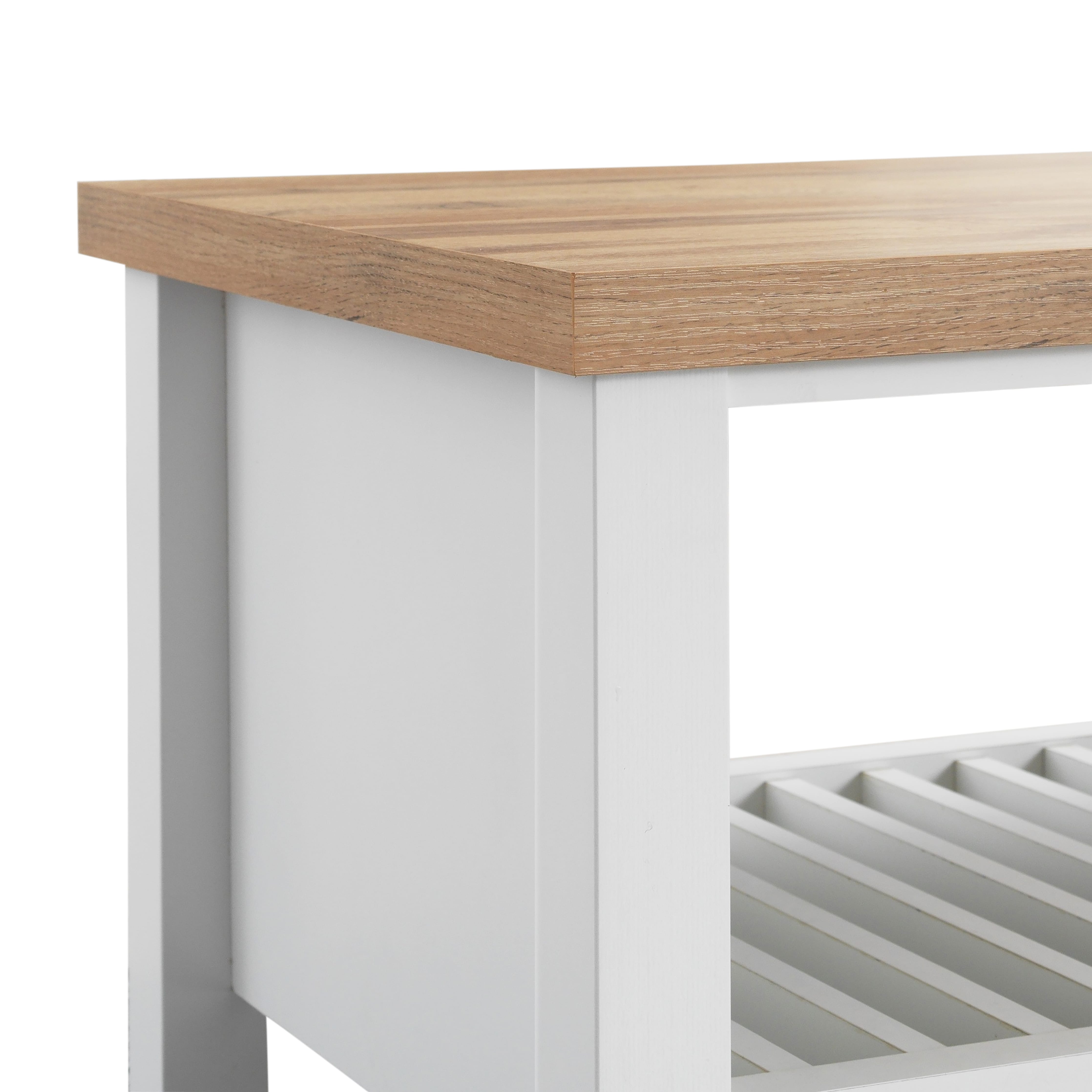 - Bright white frame with contrasting oak top for a timeless look
