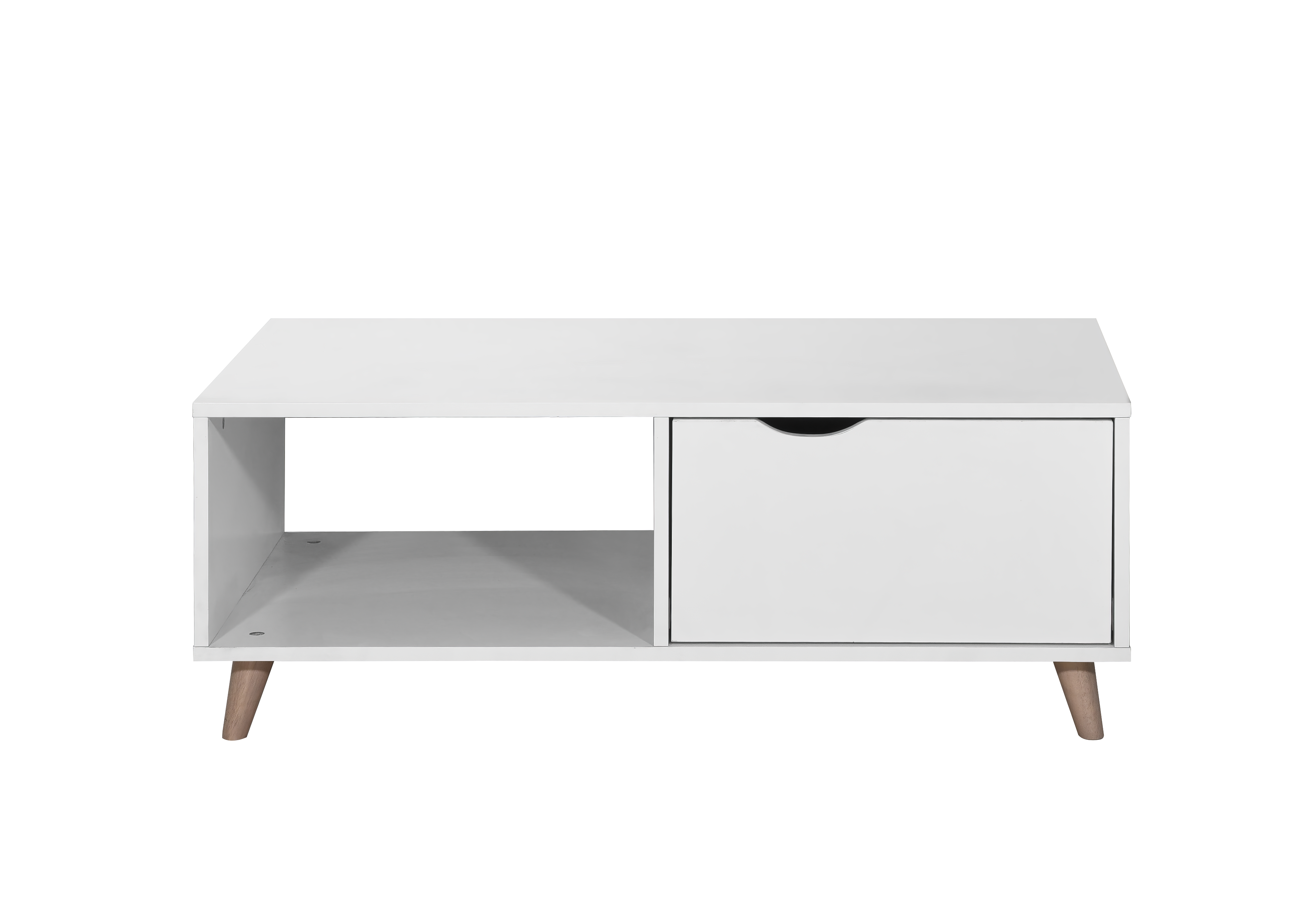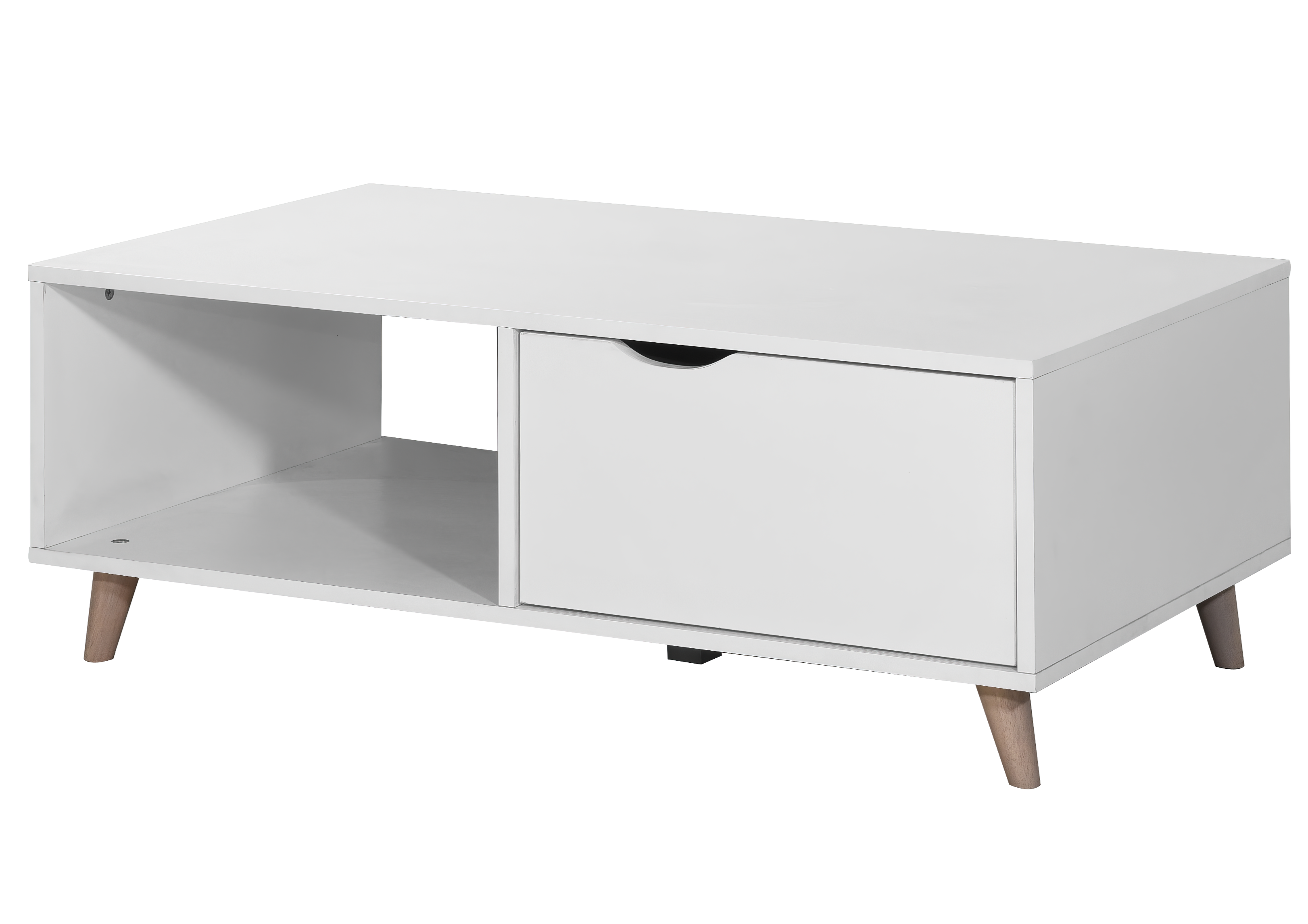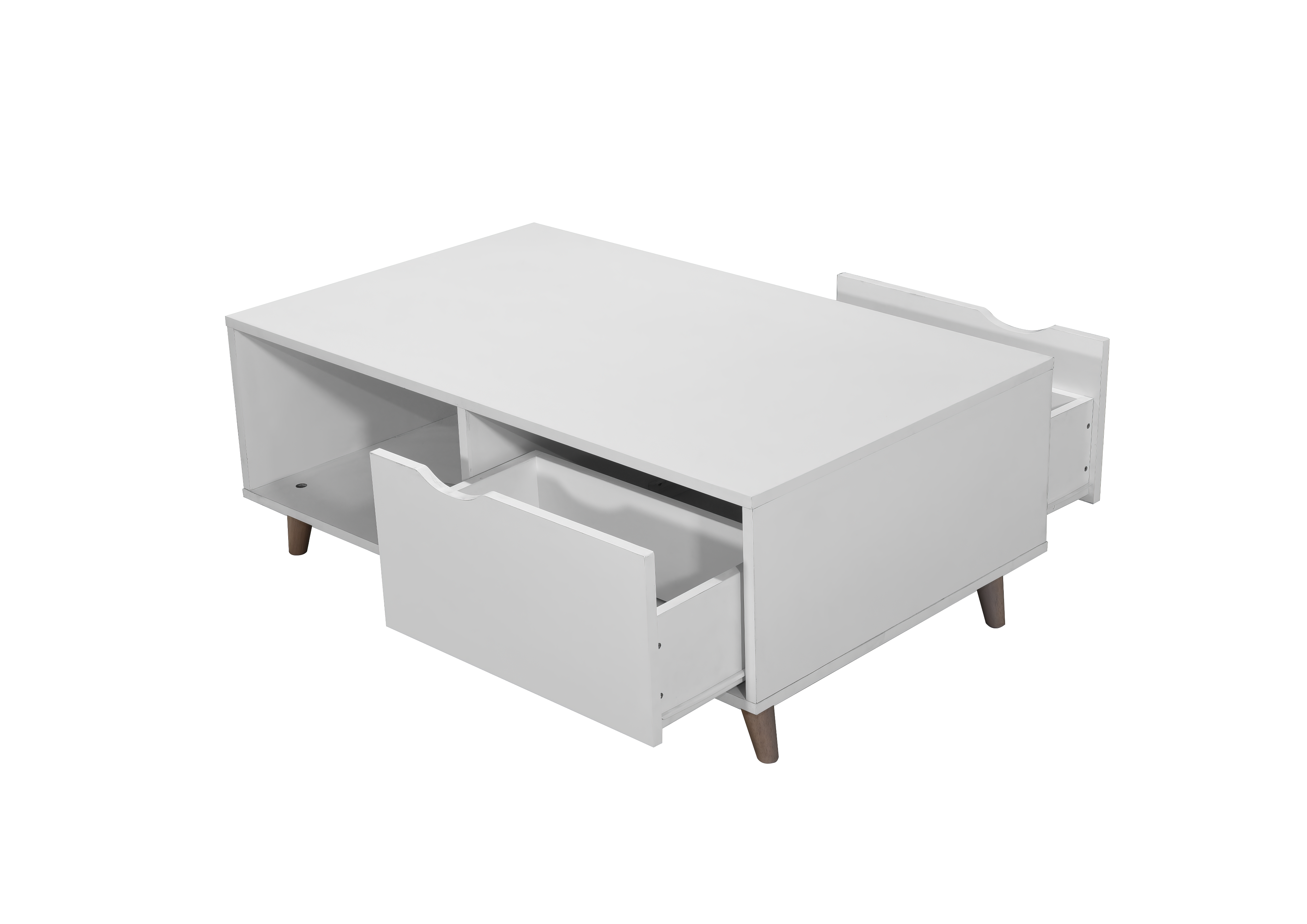 The coffee table features a smooth white finish complemented by natural wooden legs, combining to create a timeless Scandinavian aesthetic. The drawers are fitted with metal runners for smooth operation, and the main structure is made from high-quality particle board for durability.