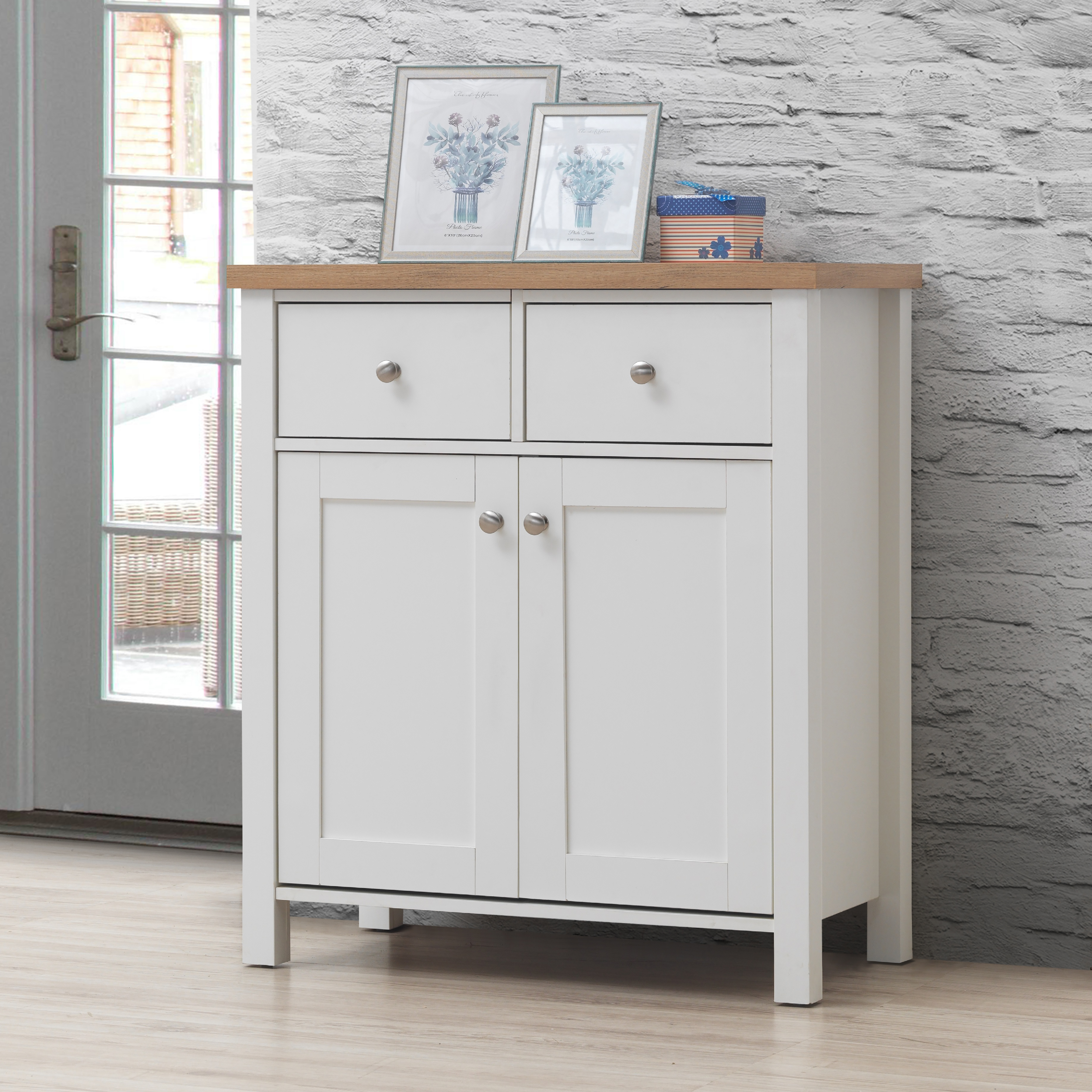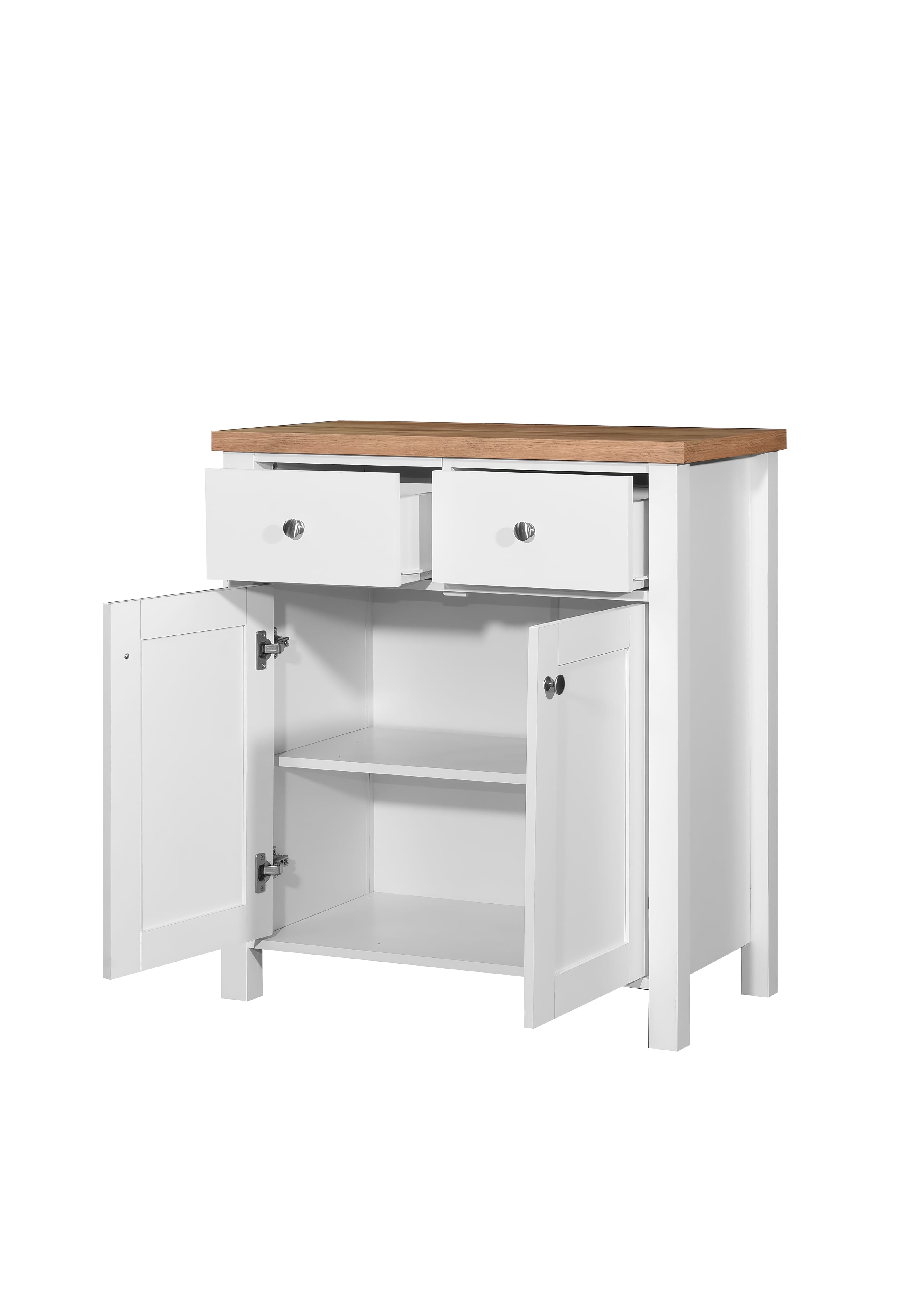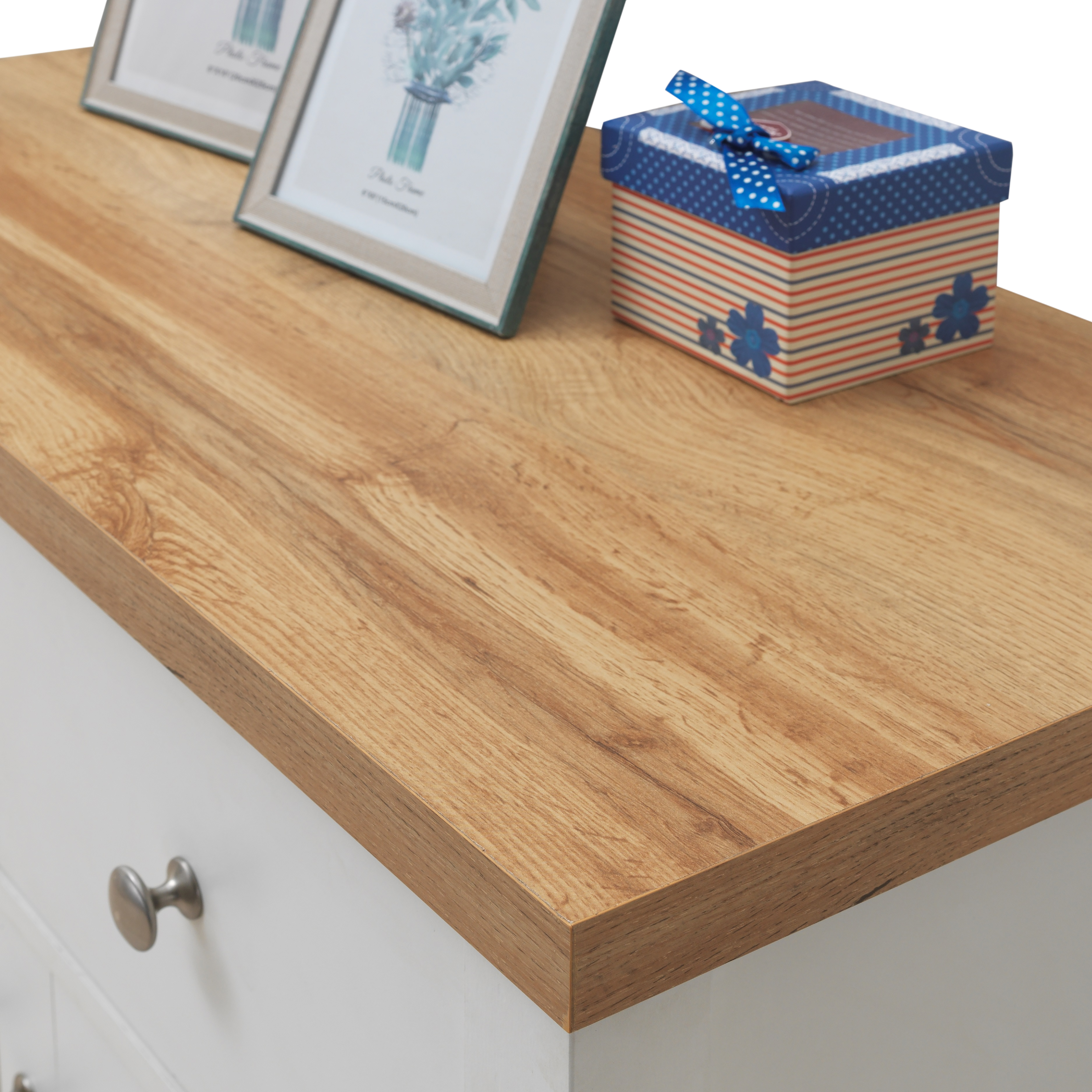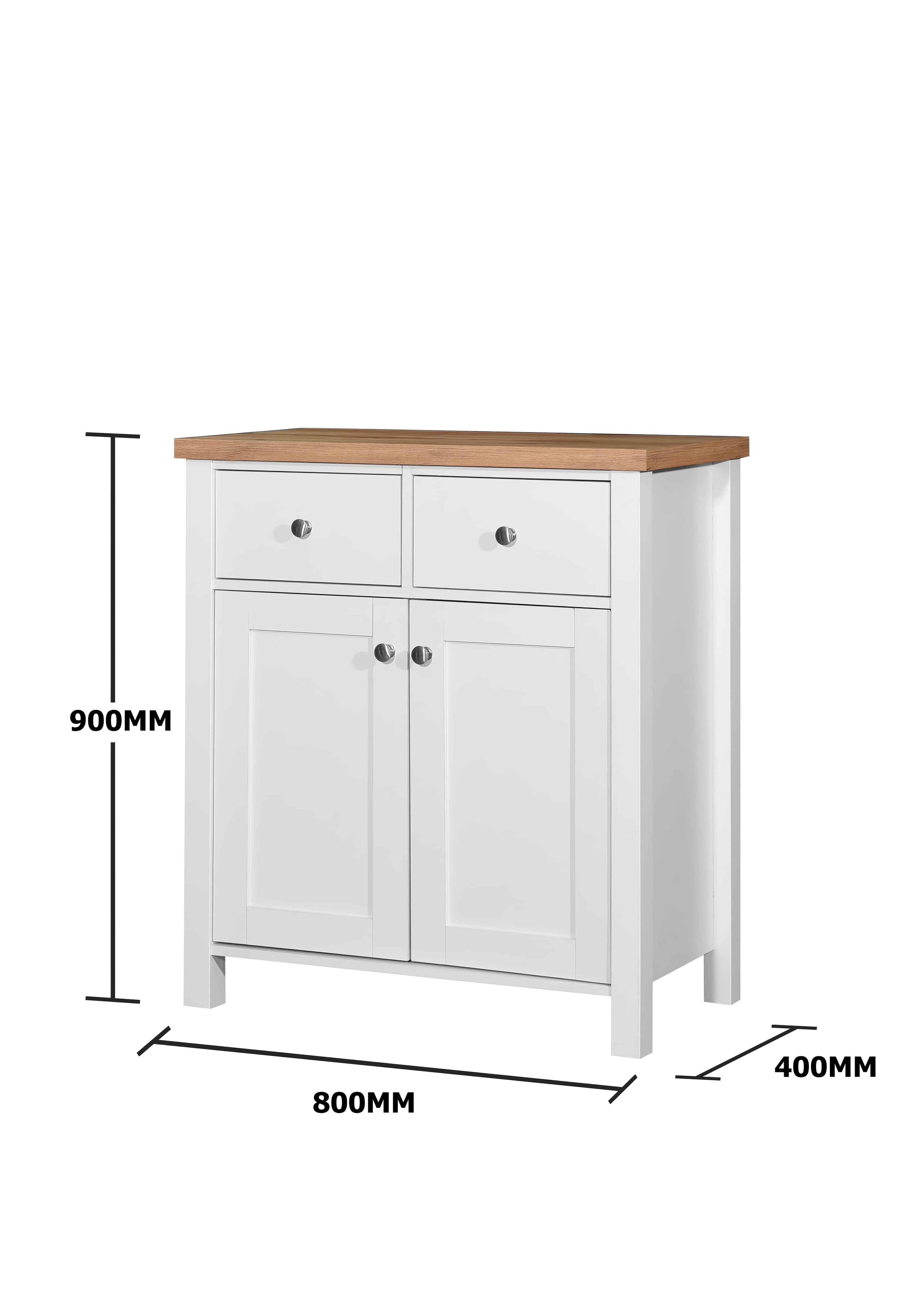 Bring a touch of British elegance and practicality to your living space with the Astbury Compact Sideboard. Featuring a bright white frame complemented by a contrasting oak top, this piece combines classic solid wood looks with modern self-assembly convenience.