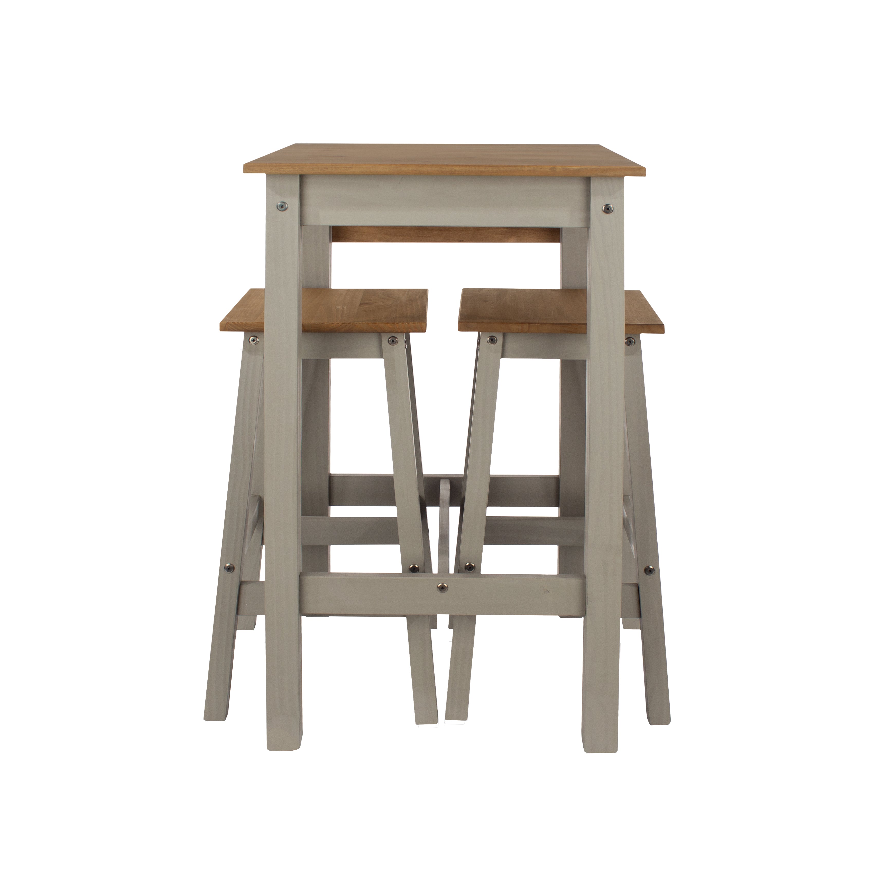 Where space is at a premium this solid wood casual dining set is ideal. The compact bar table features a lift up leaf to provide extra surface area when needed, supplied with 2 matching high stools all finished with grey waxed underframes and antique waxed top surfaces.
