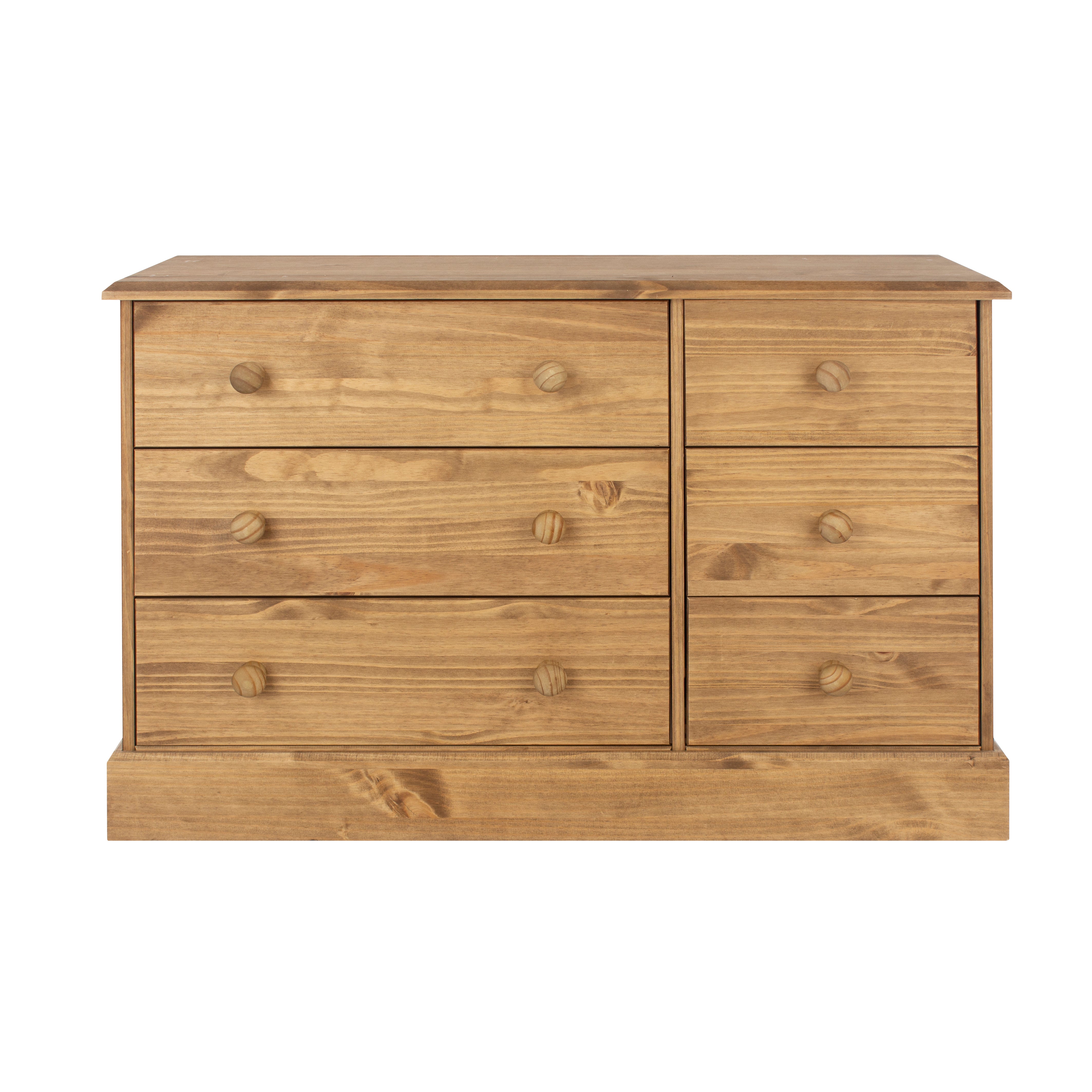 Our classic country style wood double wide chest of drawers offers generous storage with a charming antique wax finish and solid pine construction. Perfect for adding rustic warmth to your home.
