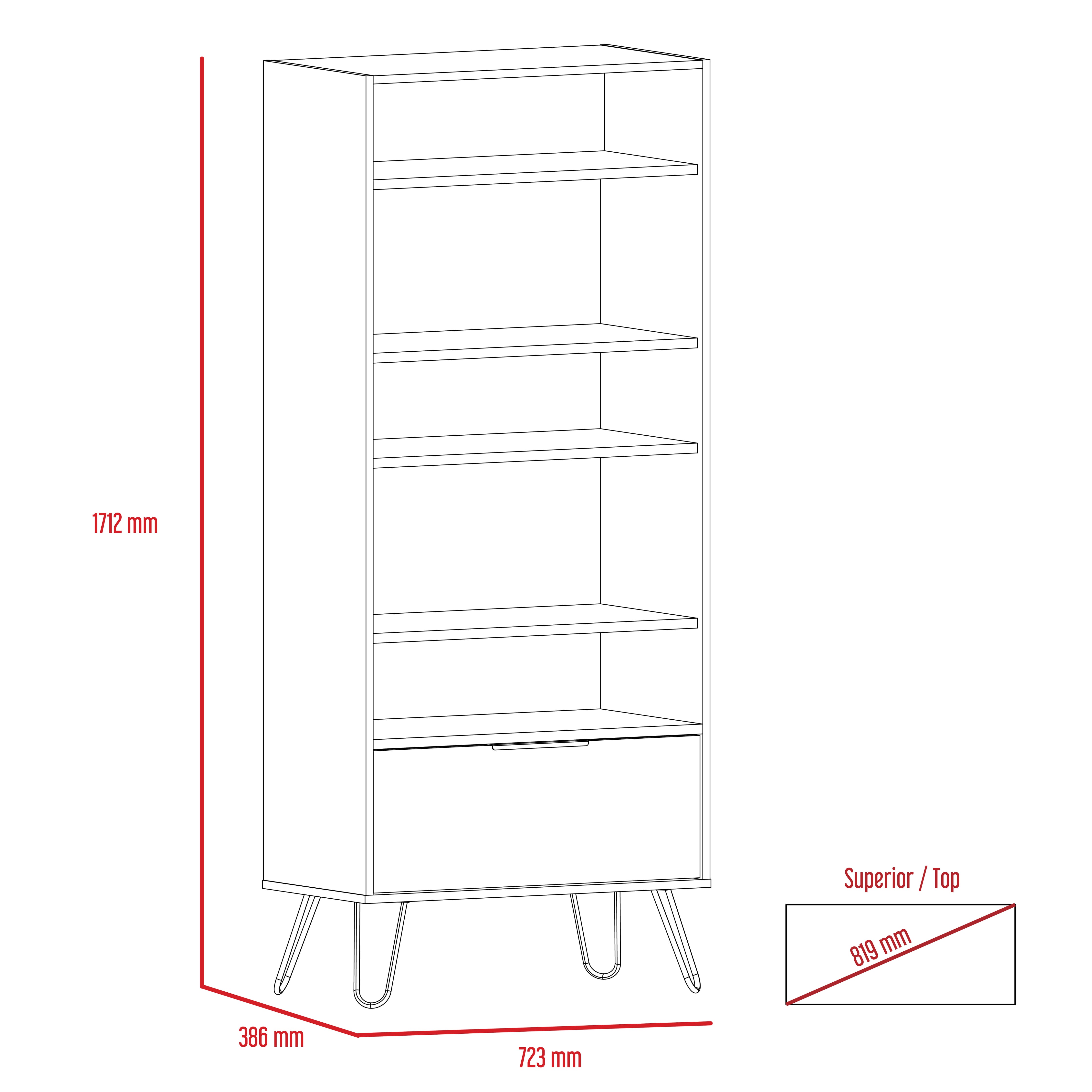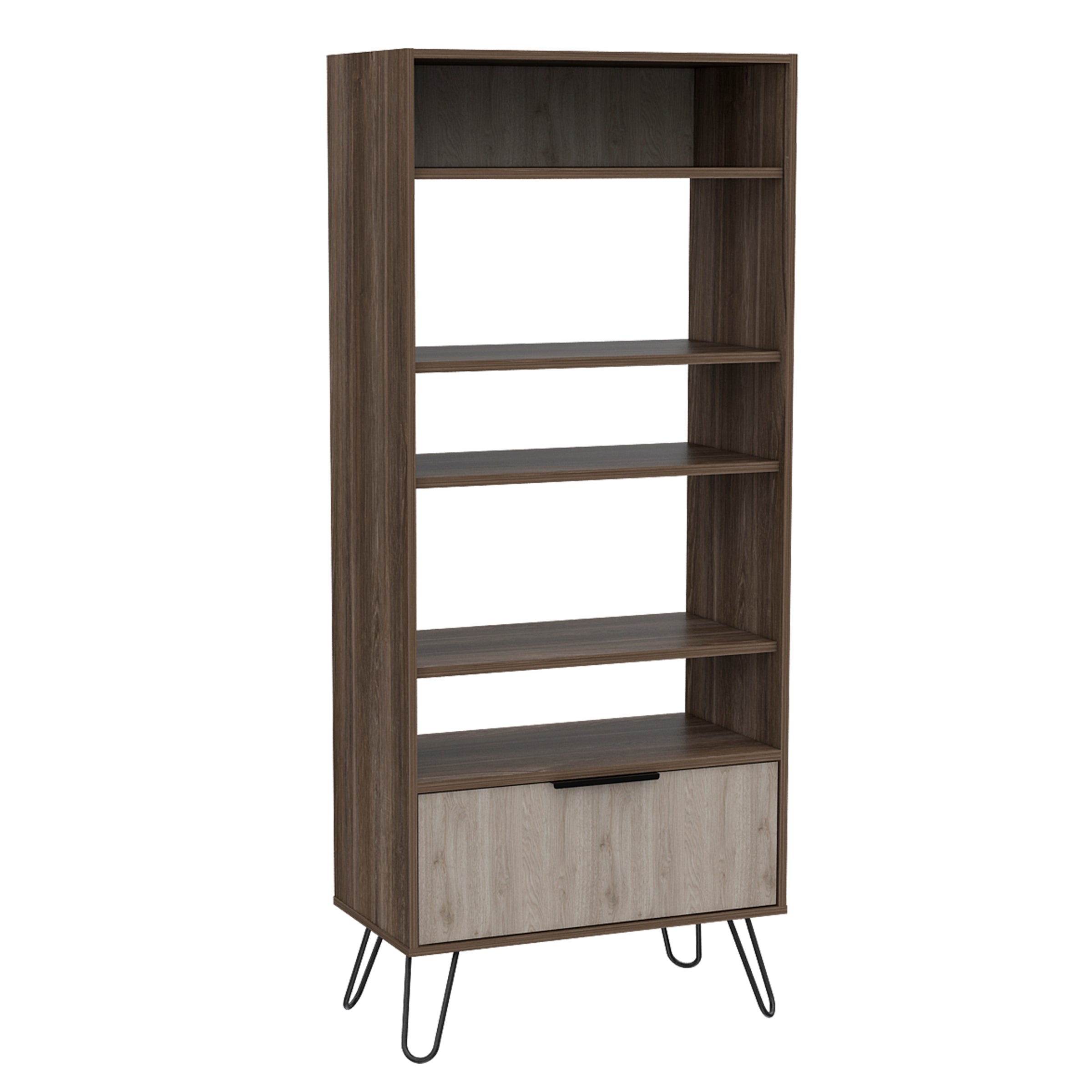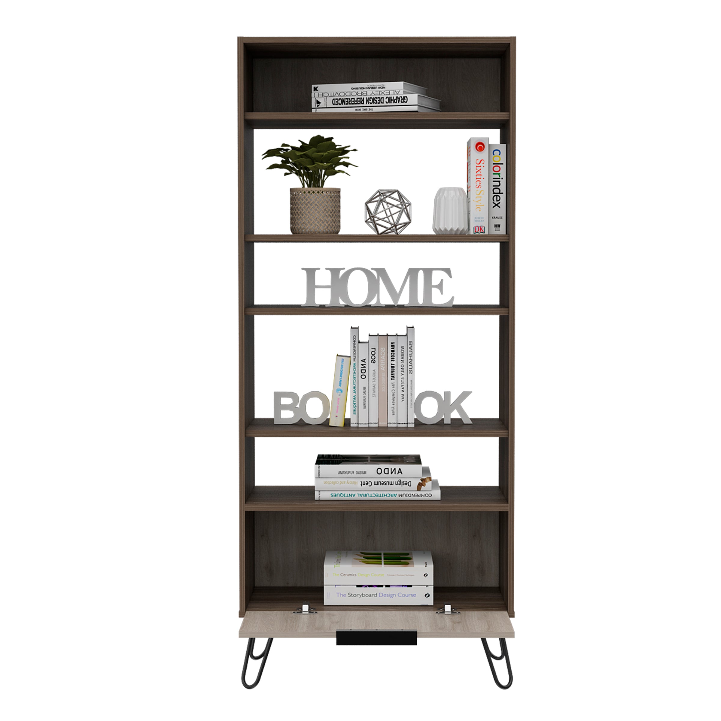 This display bookcase features an abundance of shelving space plus a handy enclosed storage area behind a drop down door. Crafted in a smoked oak effect with contrasting bleached grey oak finish, it is completed with black pull handles and stylish hairpin legs, combining practicality with modern design.