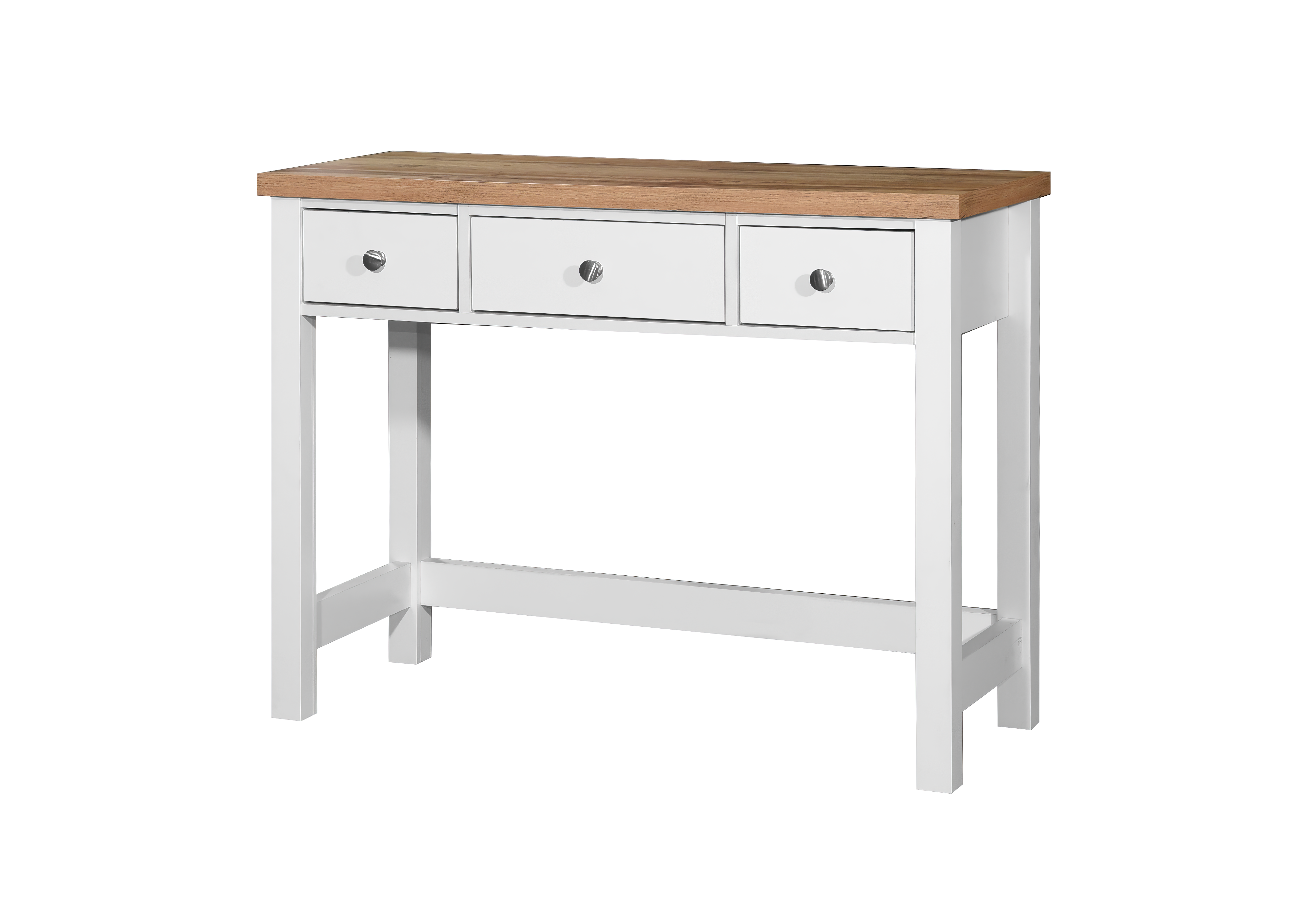 Bring a touch of British elegance to your bedroom with the Astbury Dressing Table. Featuring a bright white frame complemented by a contrasting oak top, this piece combines classic style with practical design.