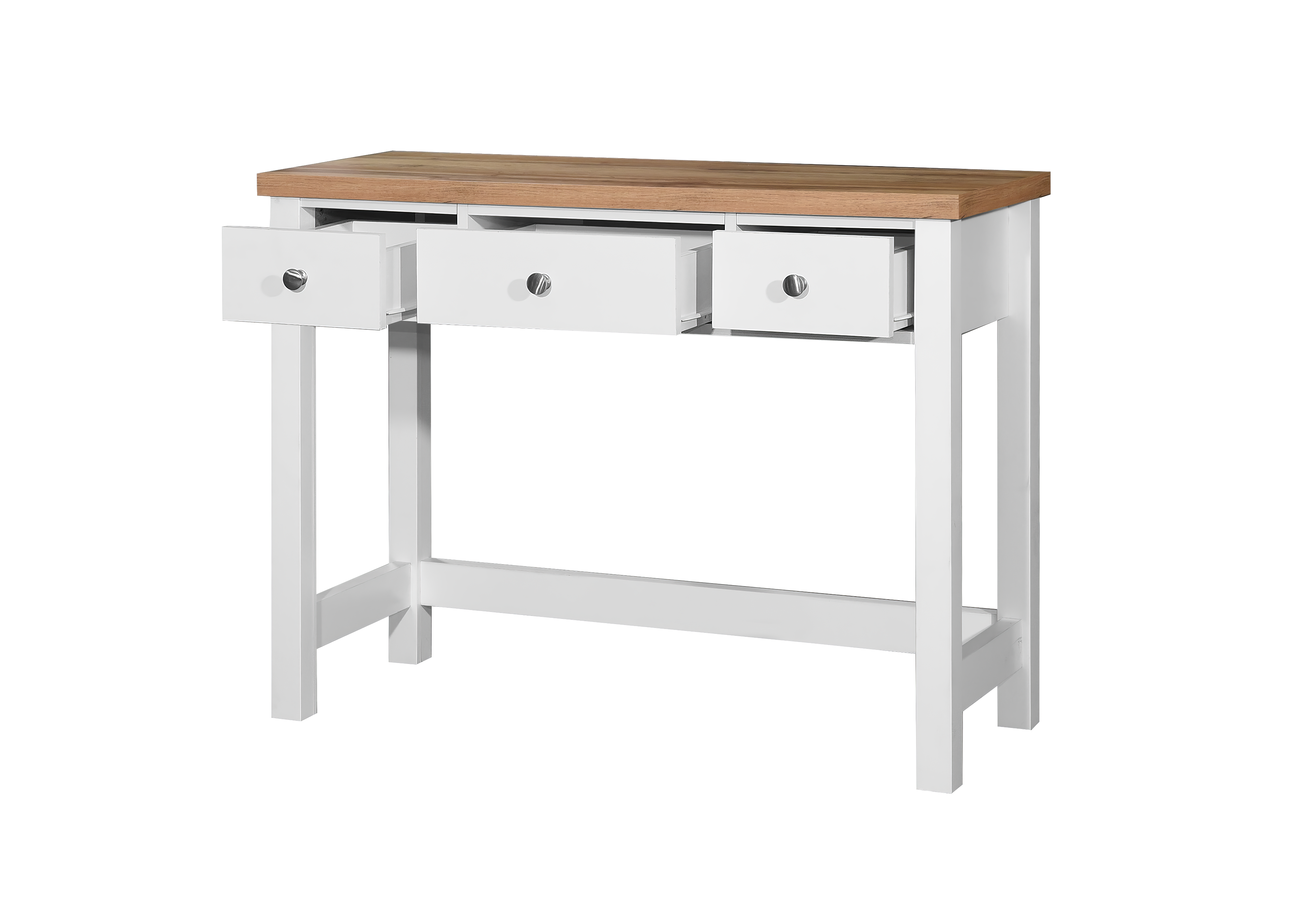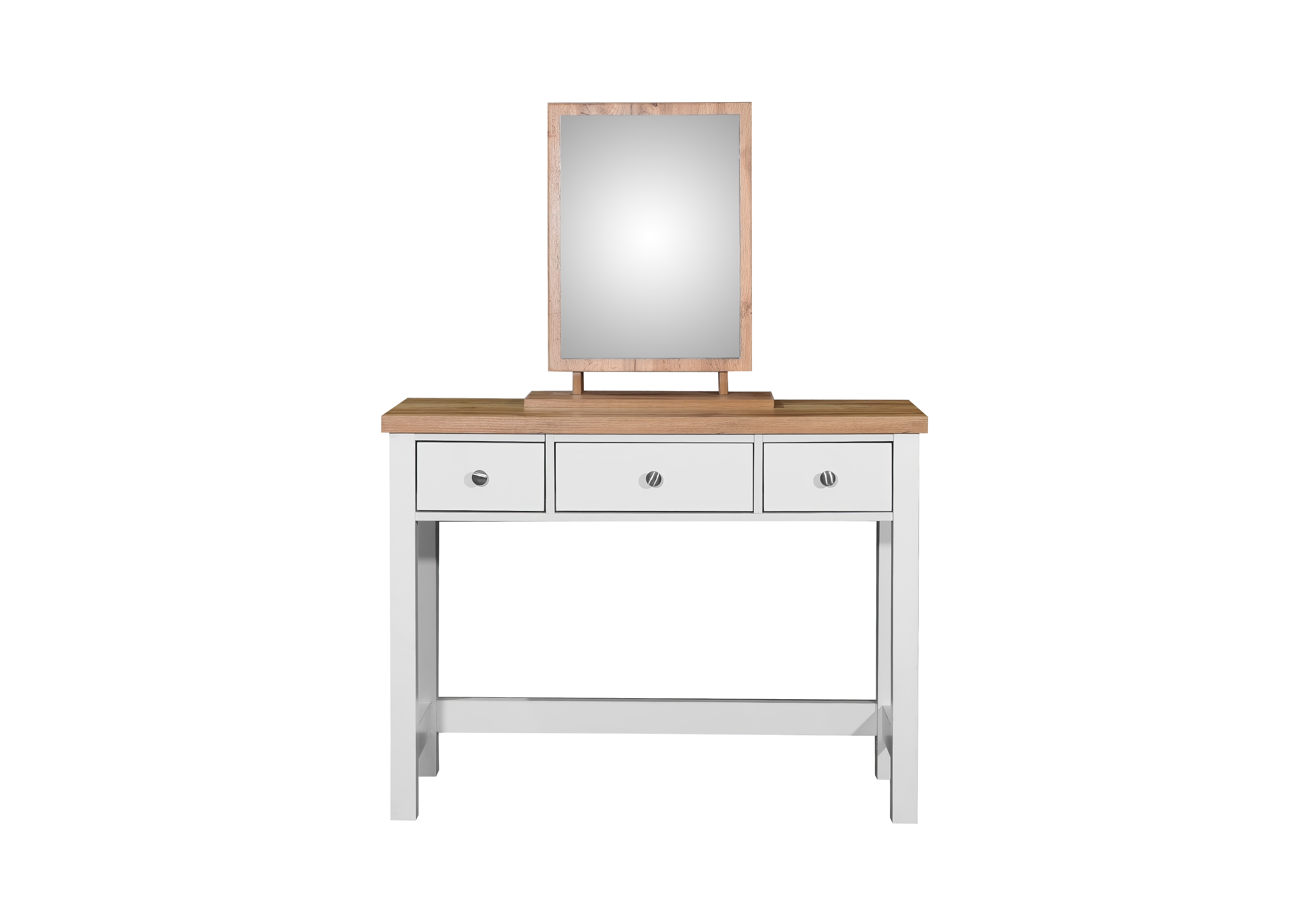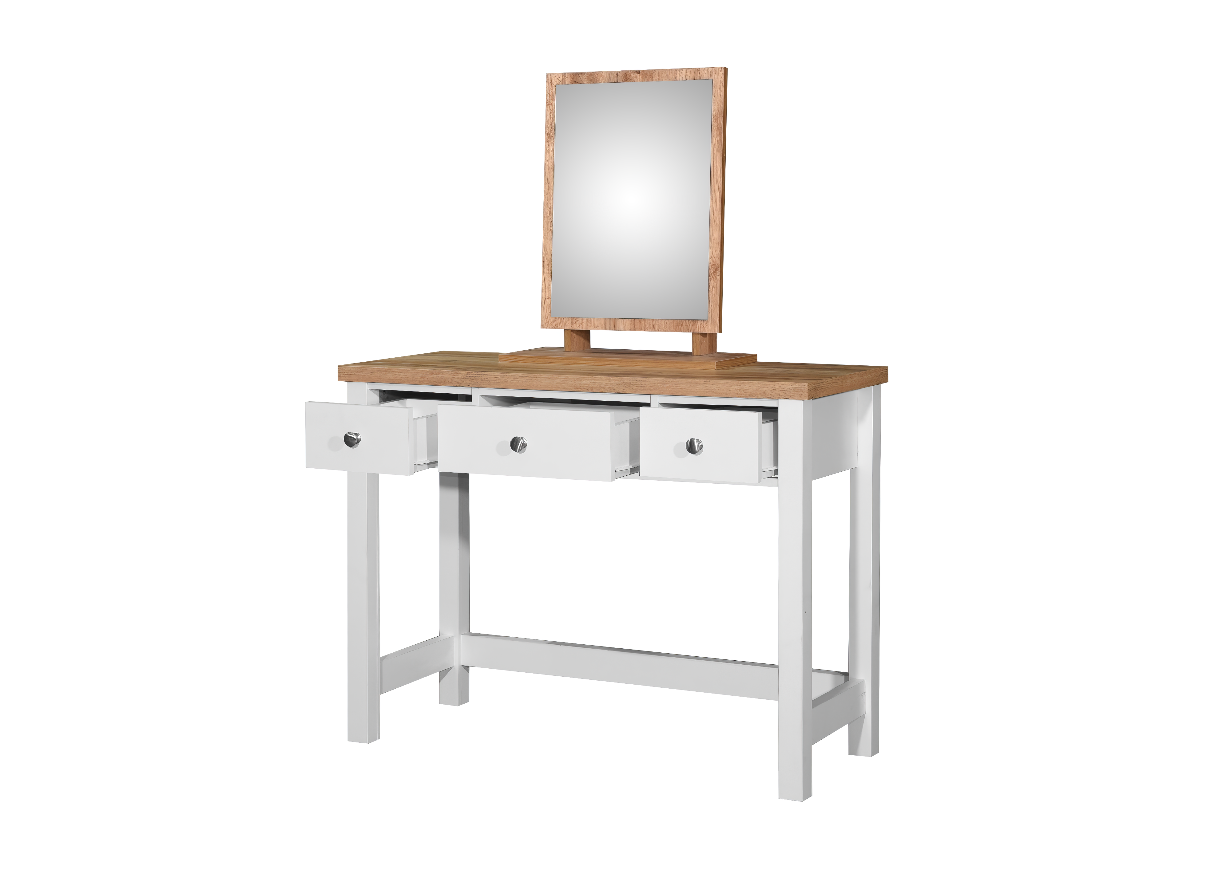 The dressing table showcases a crisp white finish on the frame, paired beautifully with a contrasting oak effect top. Crafted to offer the look of solid wood with the convenience of contemporary materials.