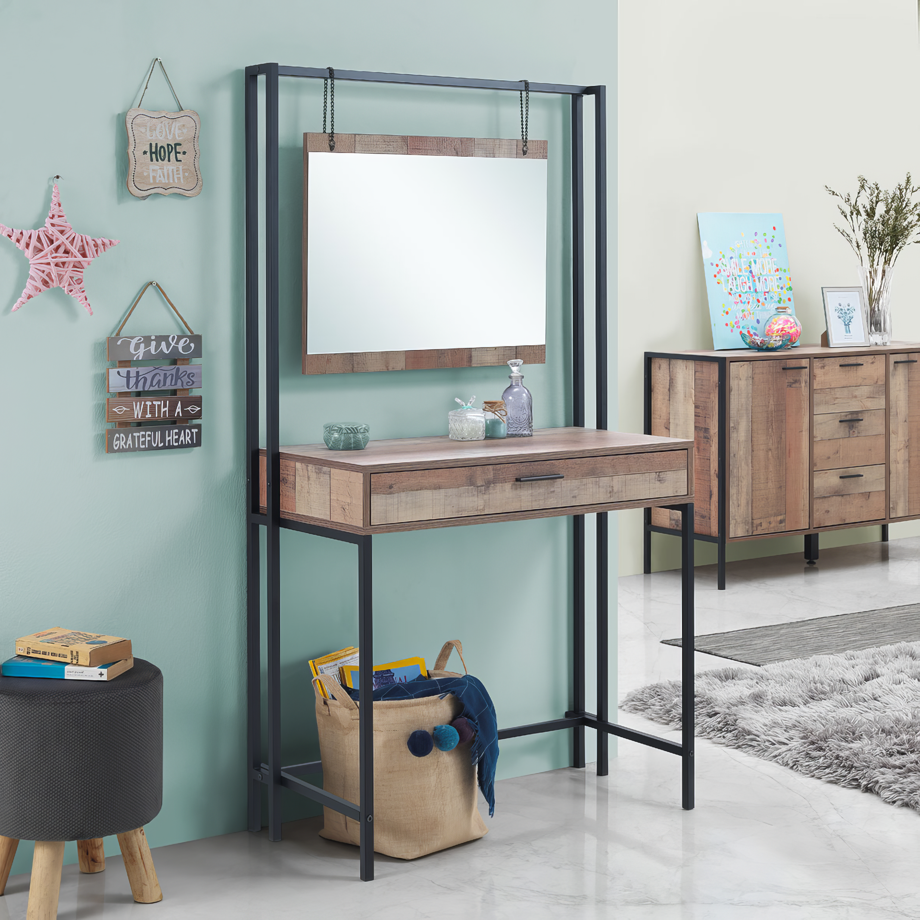 This dressing table features a warm rustic medium oak effect finish that brings character and warmth to any room. The combination of wood effect panels and metal elements adds durability and a distinctive rustic industrial look.