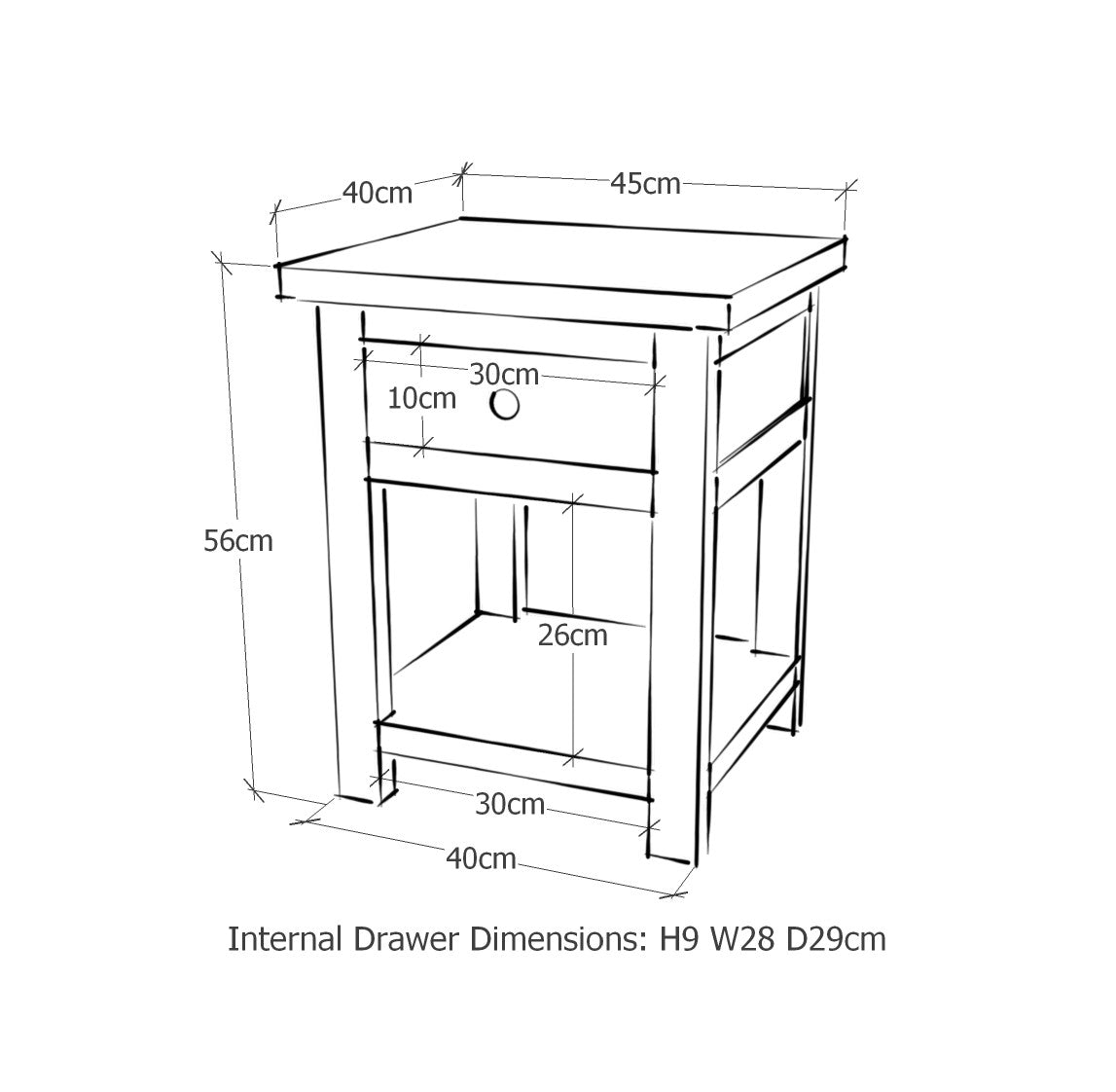 This handcrafted 1 drawer bedside cabinet combines different woods with a rich dark lacquer finish and real metal handles. Also ideal for use as a side table.