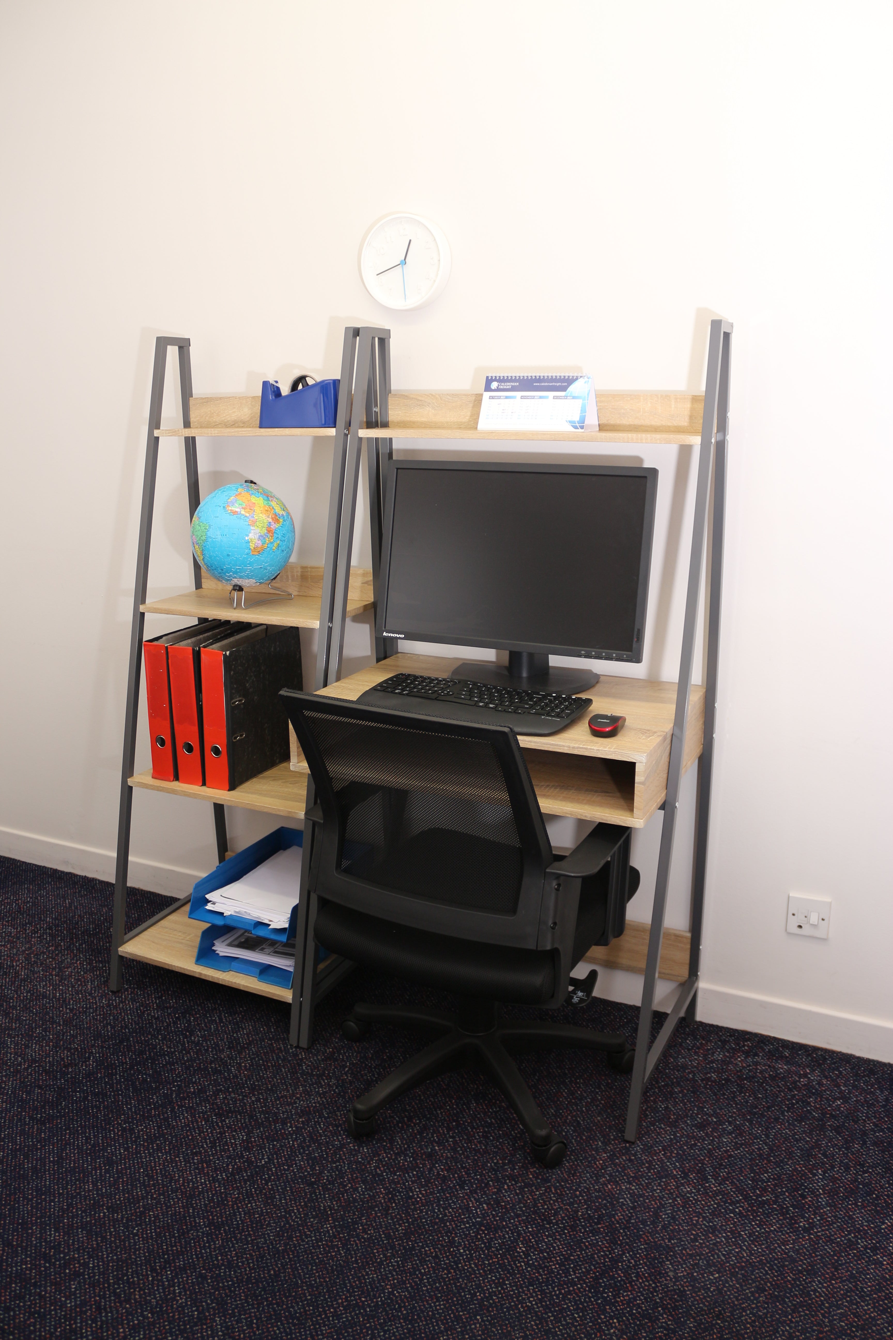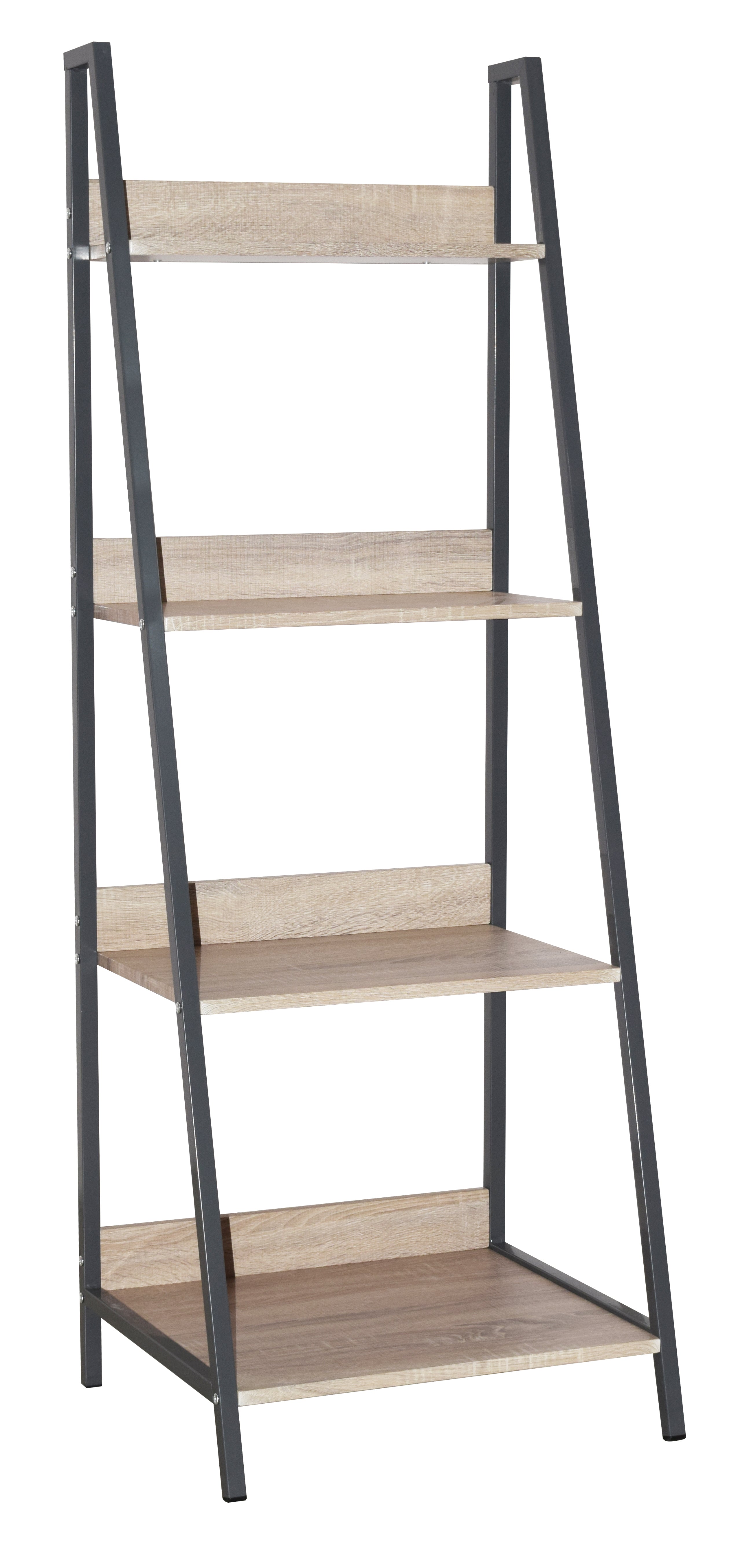 This ladder style bookcase offers ample graduated depth shelving, perfect for organising your home study or office. Finished in an Oak effect with sturdy grey metal frames, it can be used alone or paired with the matching ladder desk unit to create a stylish run of wall units.