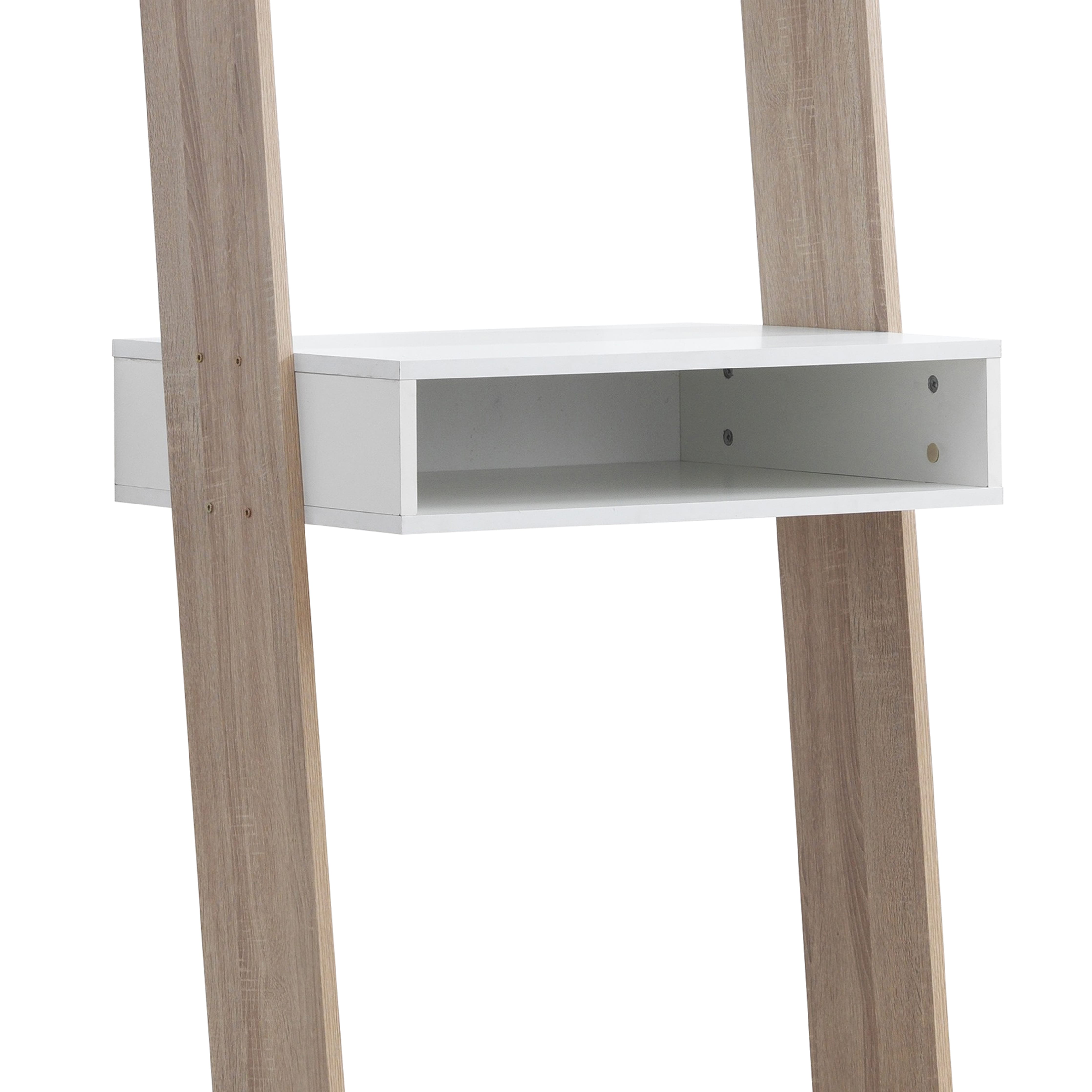 The Pulford tall ladder desk shelving unit offers a sleek Scandinavian design, combining functionality with style. Finished in white and sonoma oak wood effect, this versatile piece can be used as a desk, shelving unit, or both, making it perfect for space-saving storage and display.