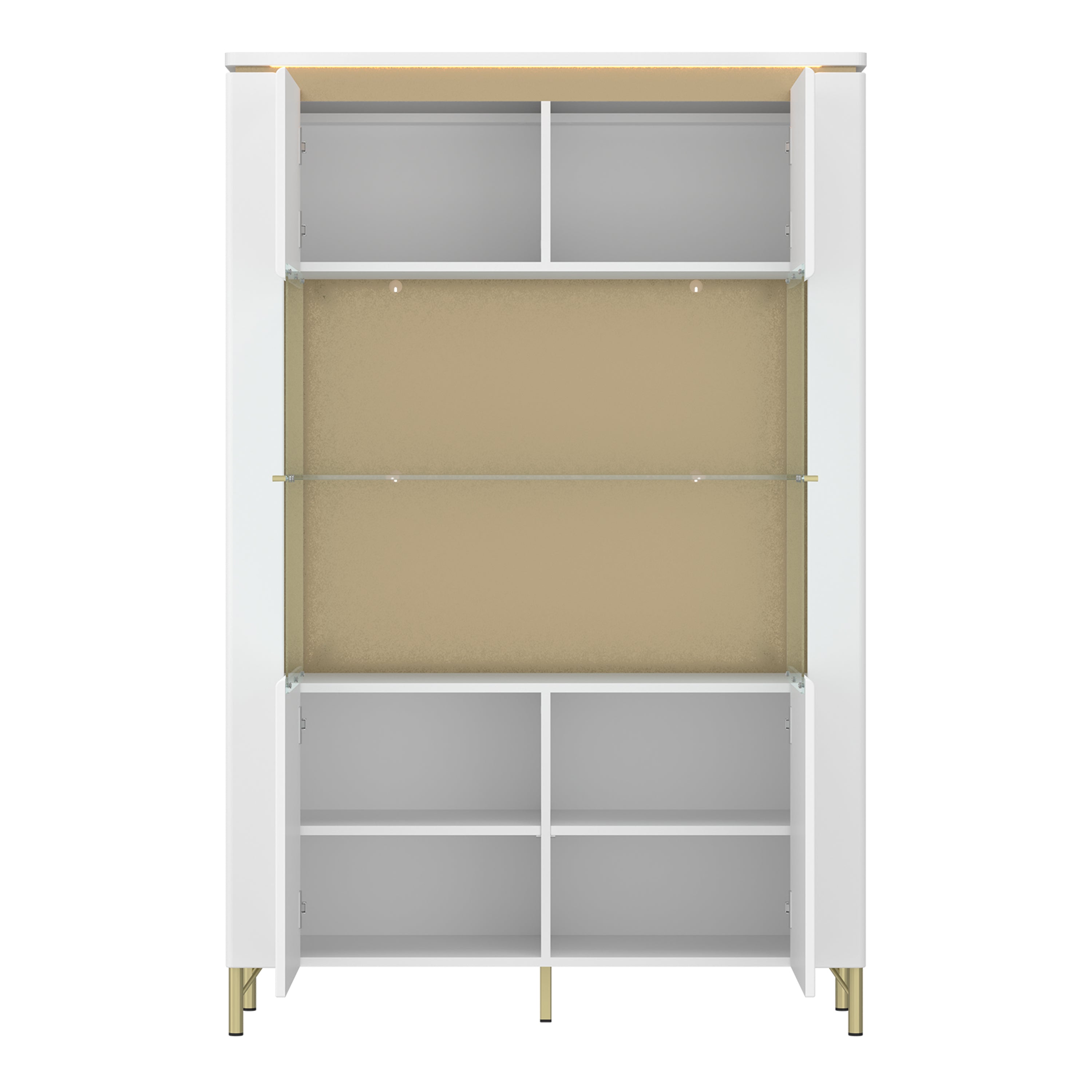Enhance your living space with the Lazio Vitrin 2 Door Display Cabinet, combining sleek modern design with practical storage. Its high gloss Alpine White and White Gloss finish, complemented by elegant gold accents and integrated LED lighting, creates a stunning focal point in any room.