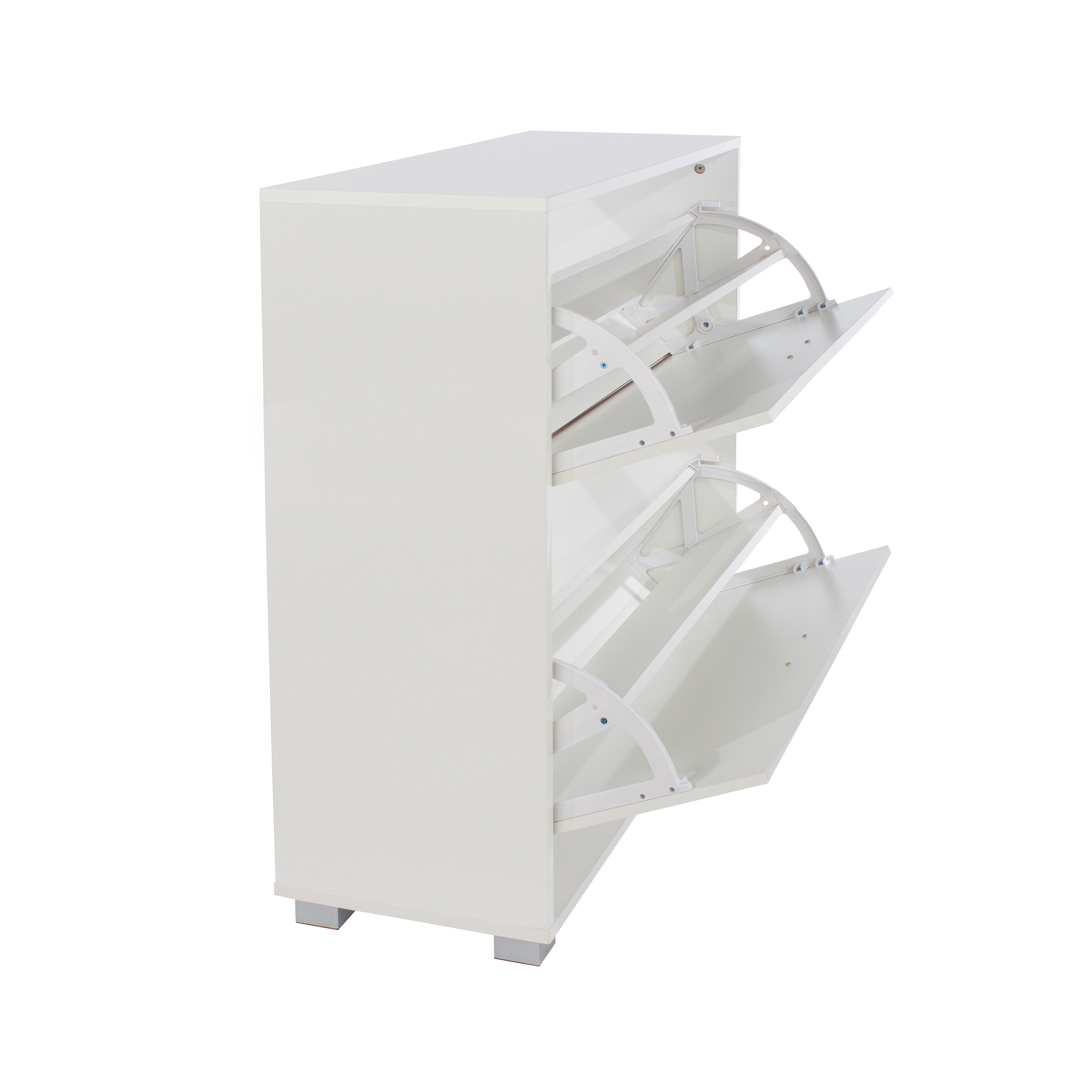 Ideal for hallways or bedrooms, this white shoe cabinet offers a practical and stylish solution to store slippers and shoes. Each drop down drawer front provides a double layered storage compartment, keeping your footwear organised and accessible.