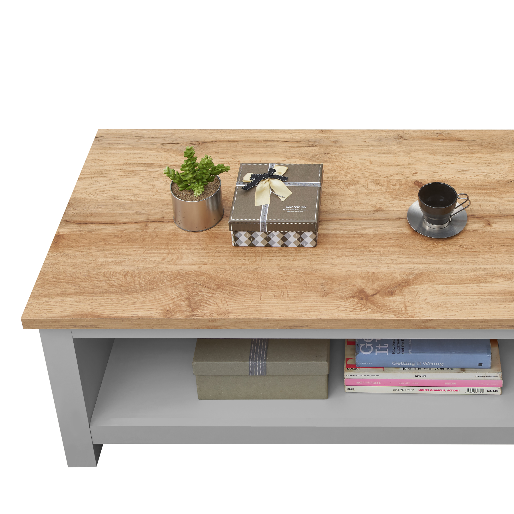 Finished in light grey with a contrasting oak effect top, this coffee table is made from particle board. The combination creates a warm and inviting look, perfect for any living space.