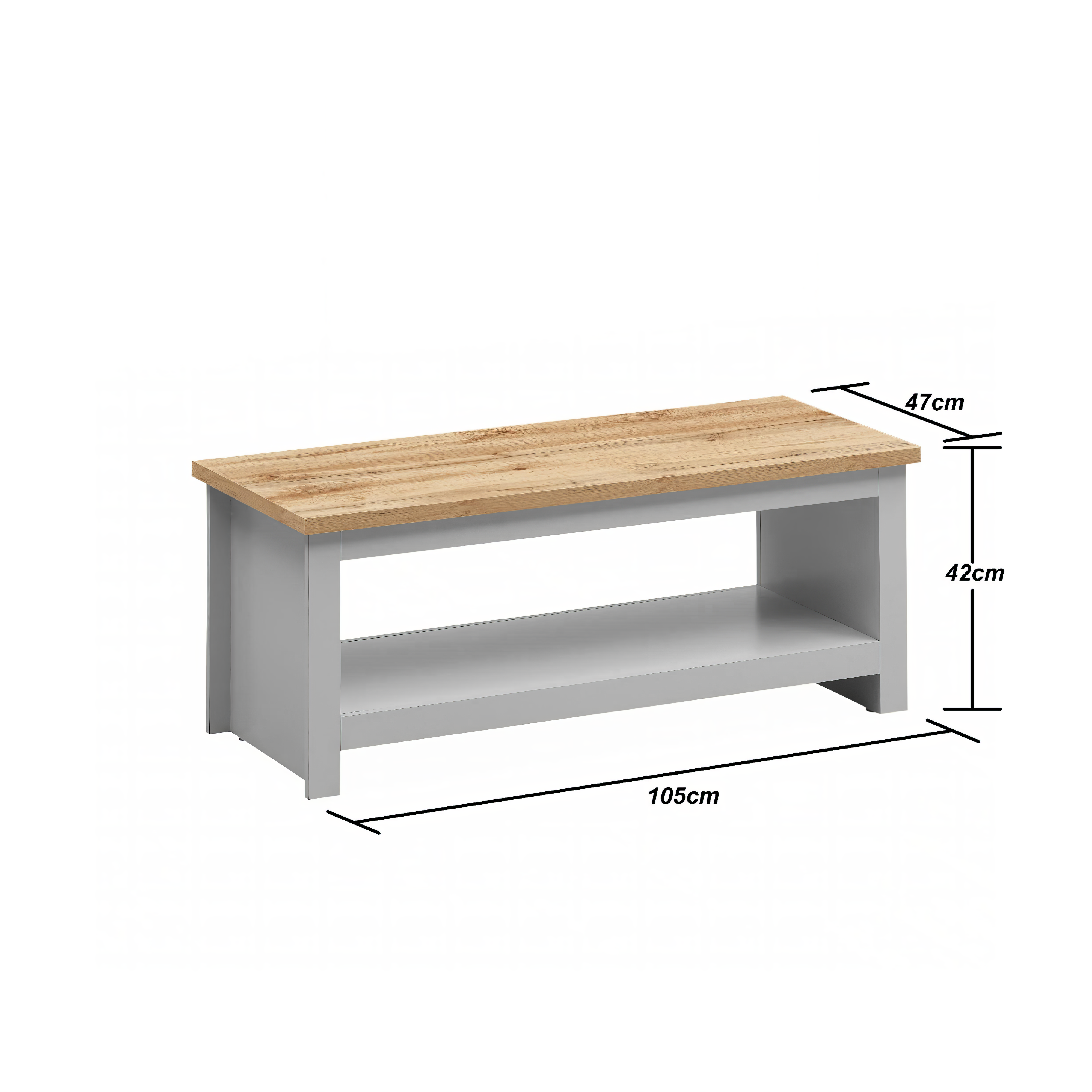 Bring warmth and style to your living room with this charming coffee table from the Lisbon collection. Featuring a light grey finish with a contrasting oak effect top, this piece combines practicality and elegance to create a welcoming atmosphere.