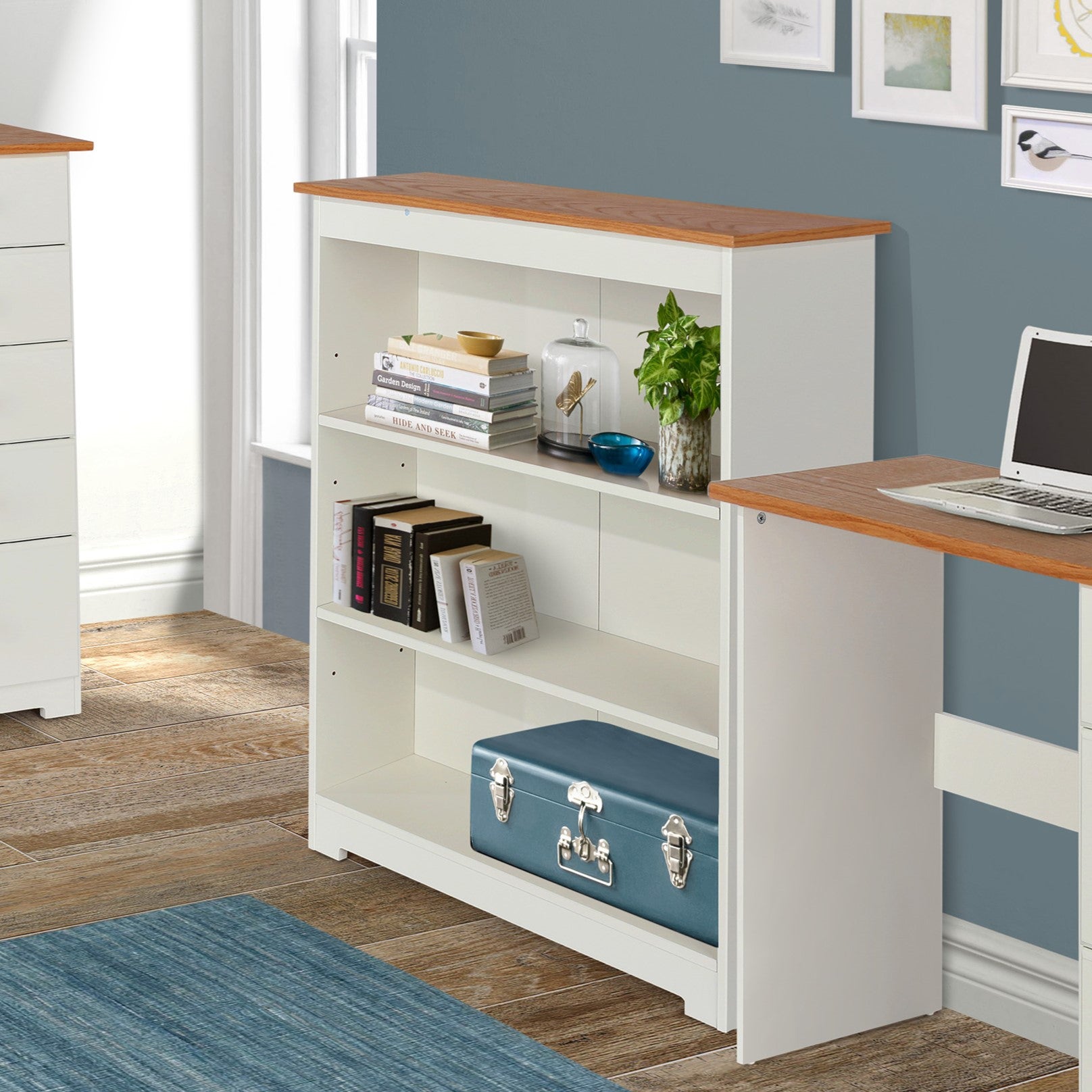 A useful wide bookcase featuring adjustable shelves finished in a soft white paint with an oak woodgrain effect top that is easy to clean.