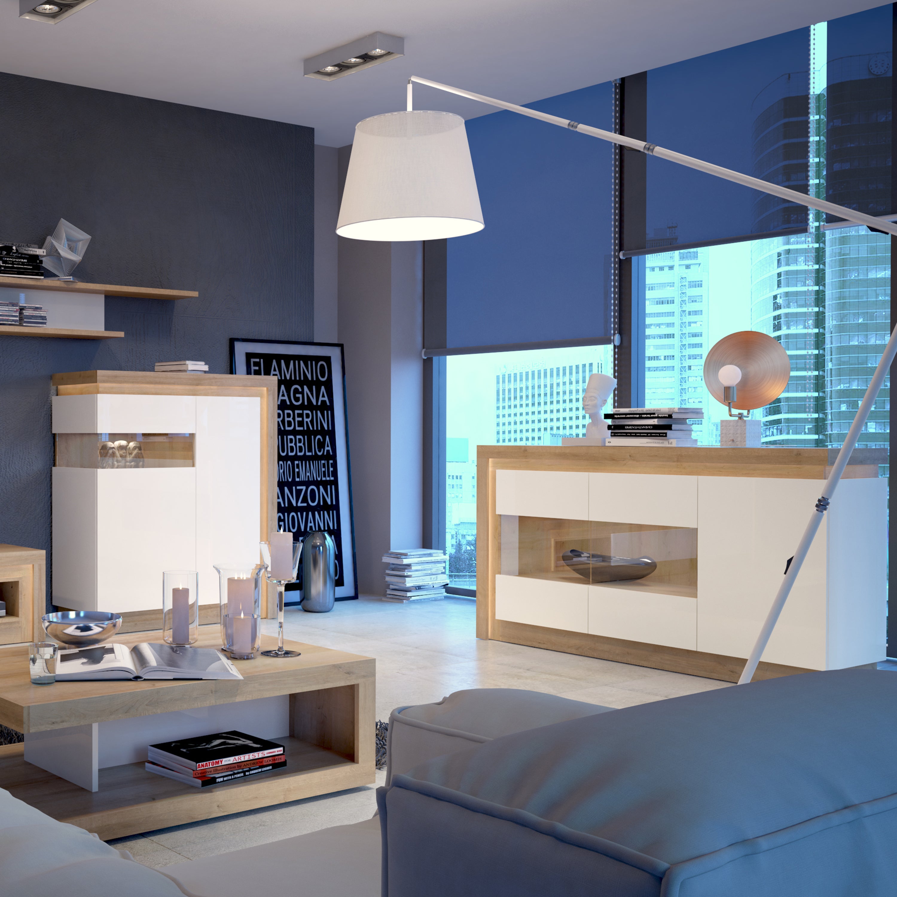 Choose from Riviera Oak with White High Gloss or White and High Gloss finishes, both crafted from laminated board for durability and a sleek modern look.
