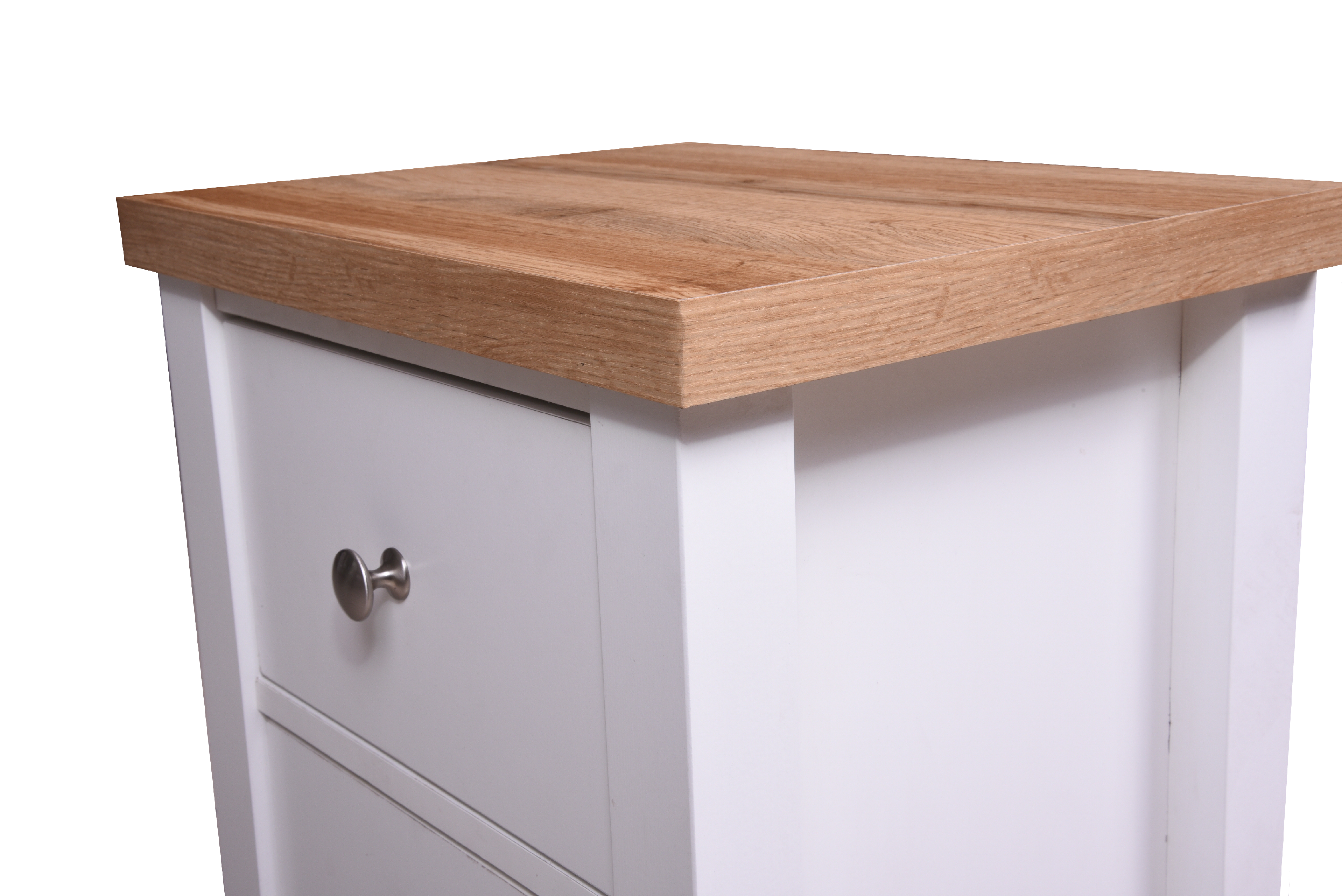 The nightstand boasts a crisp white finish complemented by a contrasting oak top, creating a bright and inviting look. Metal drawer runners and knobs add subtle detailing and durability.