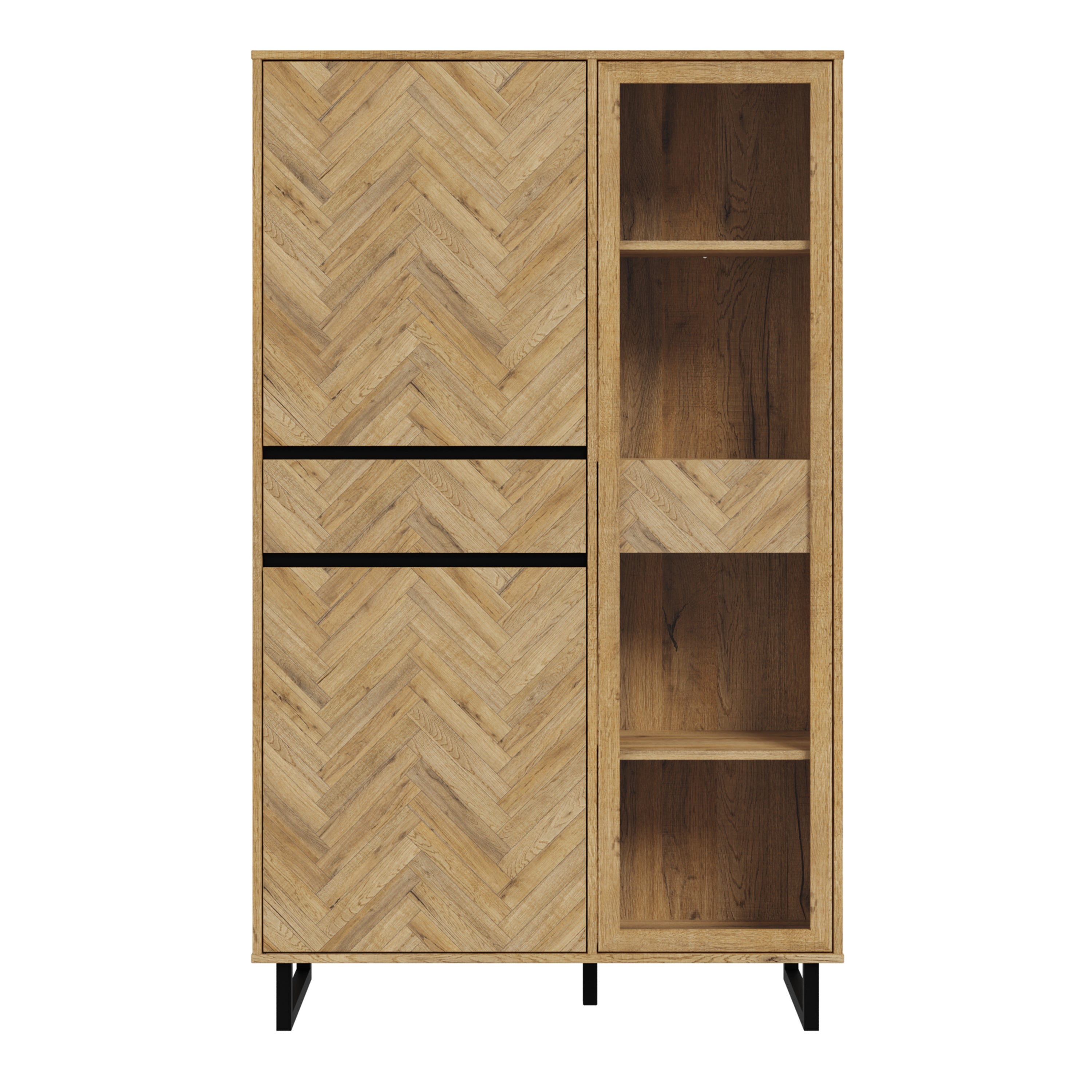 Discover the Nikomedes Display Cabinet, a stunning fusion of contemporary design and classic charm. Featuring decorative herringbone panels inspired by traditional wood block flooring, this cabinet adds rustic warmth and mid-century sophistication to your living or dining space.