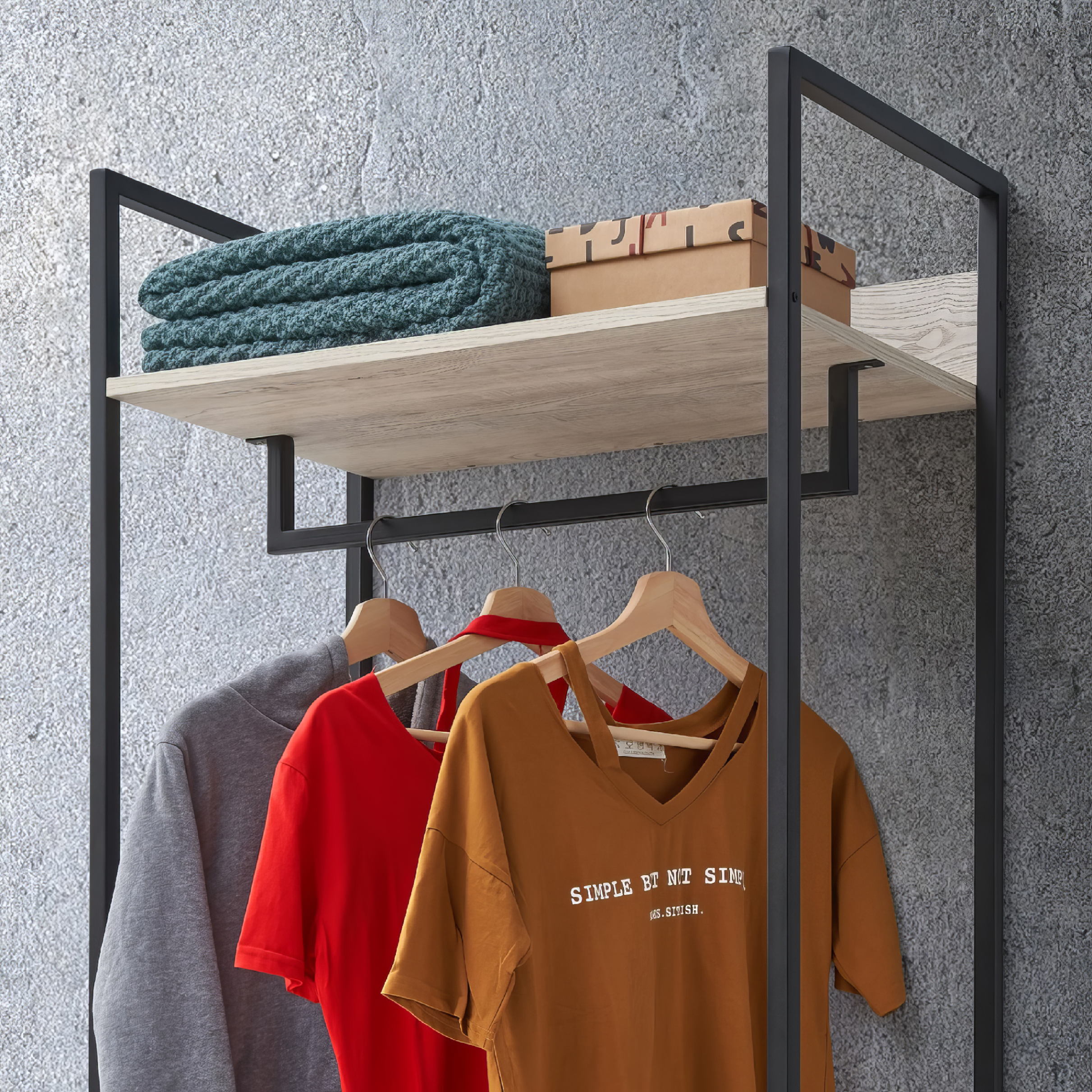Available in four sophisticated finishes: Zahra Oak, Ash Oak, Black, and Dark Grey. The wardrobe features an oak effect finish on the shelves paired with a sturdy metal frame and legs, combining natural warmth with industrial style.