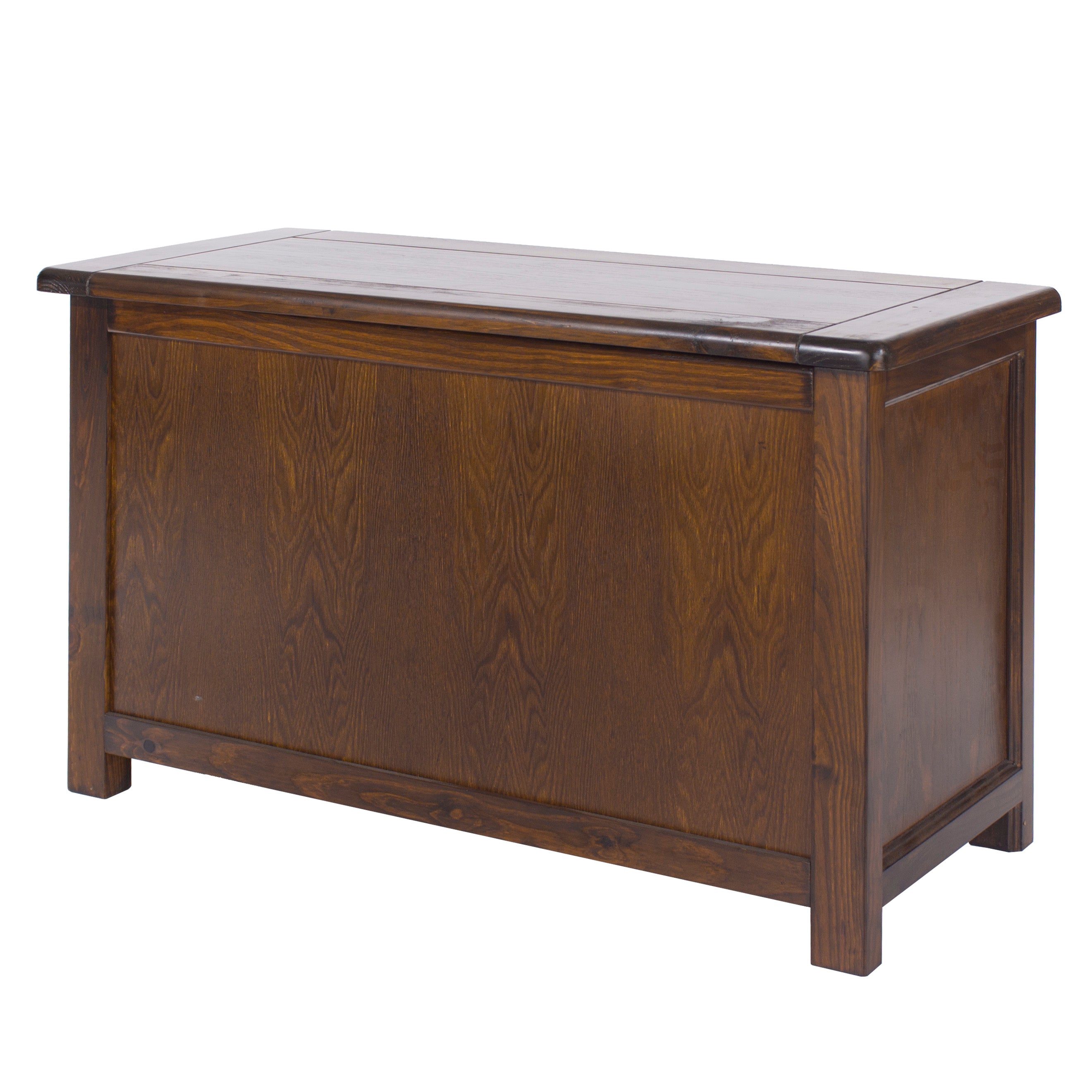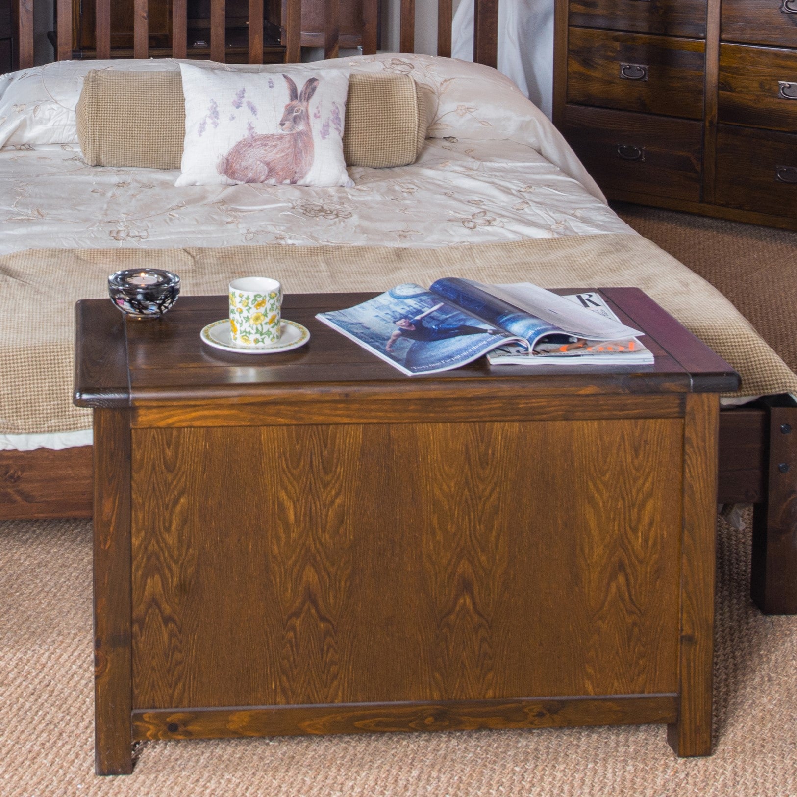 This storage trunk comes in a dark brown colour with a rich dark lacquer finish. Made from pine, it offers durability and a classic appearance.