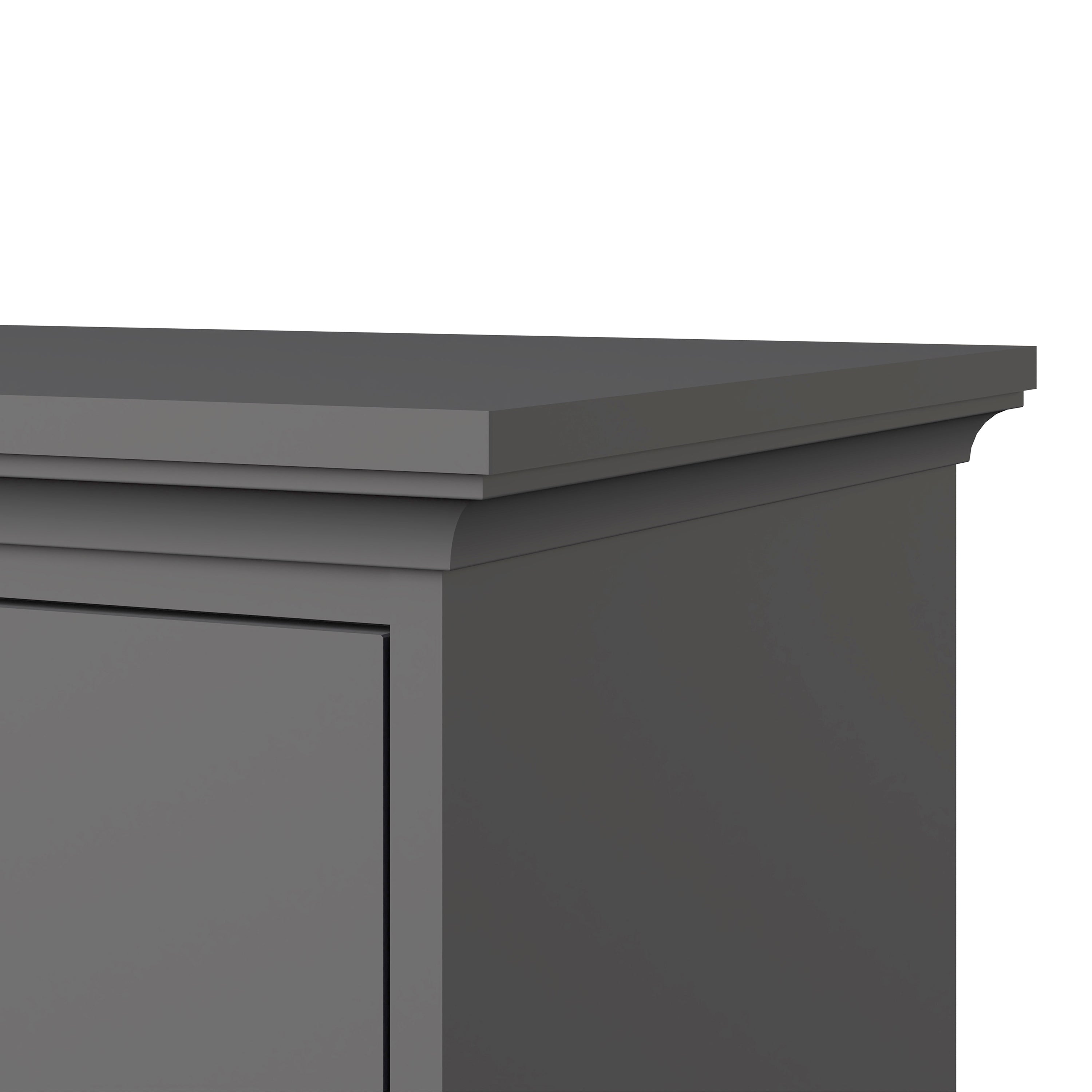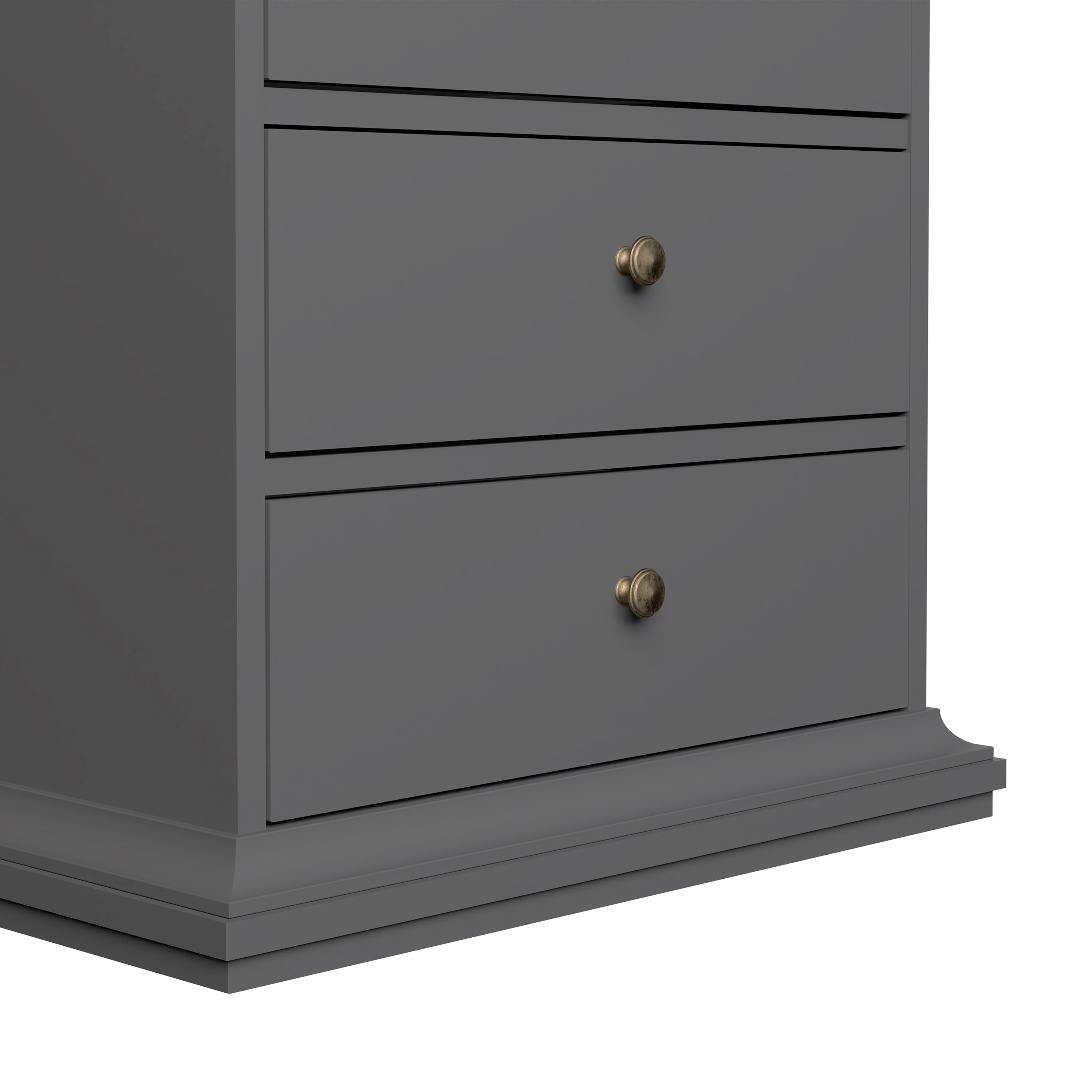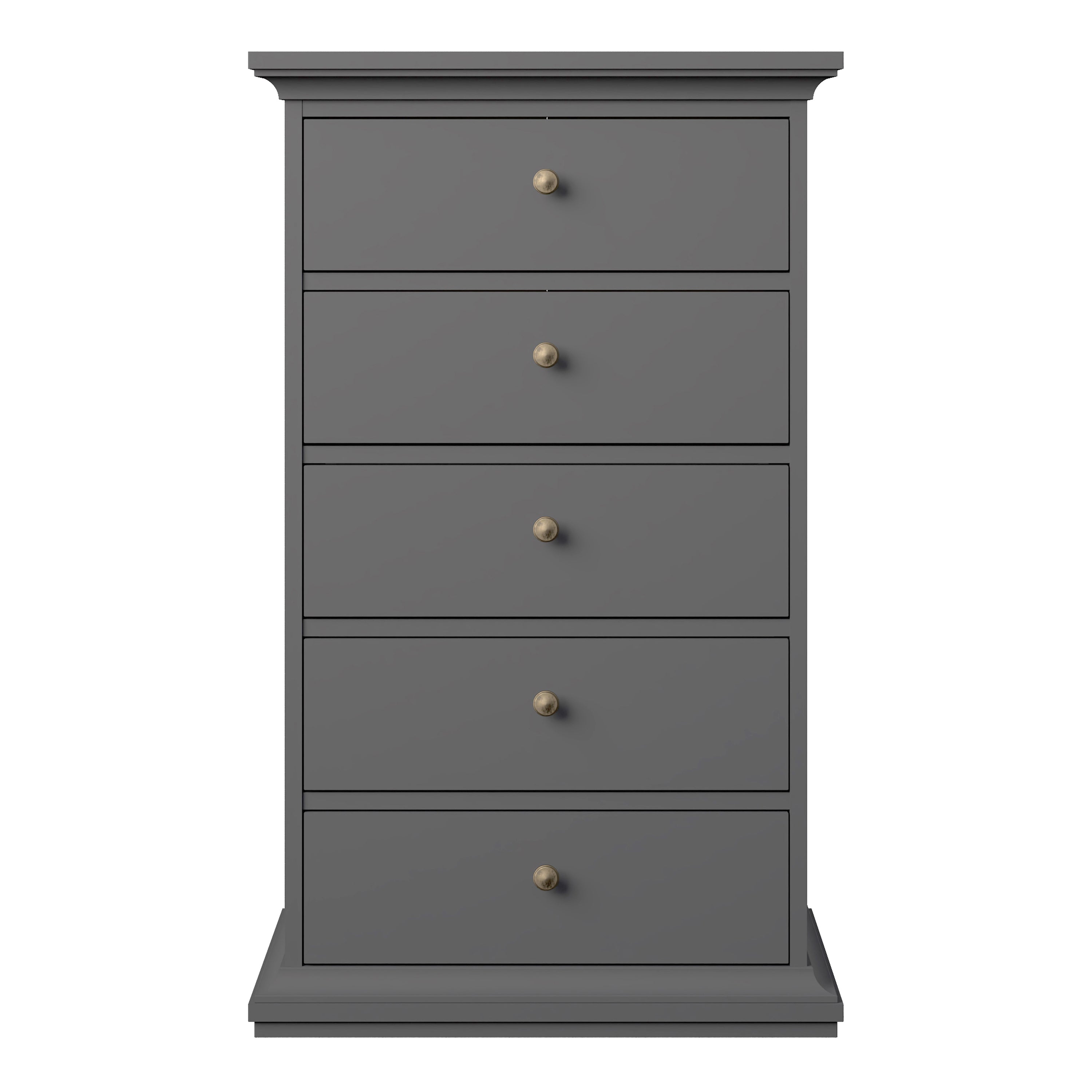 Enhance your living space with the Paris Chest 5 Drawers in Matt Grey, combining timeless elegance with practical storage. Its romantic and sophisticated design adds classic charm while offering ample room to keep your belongings organised.