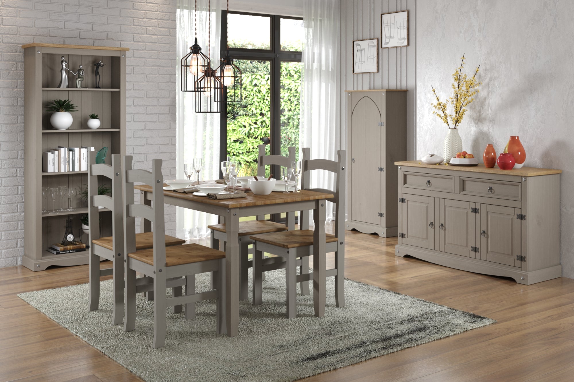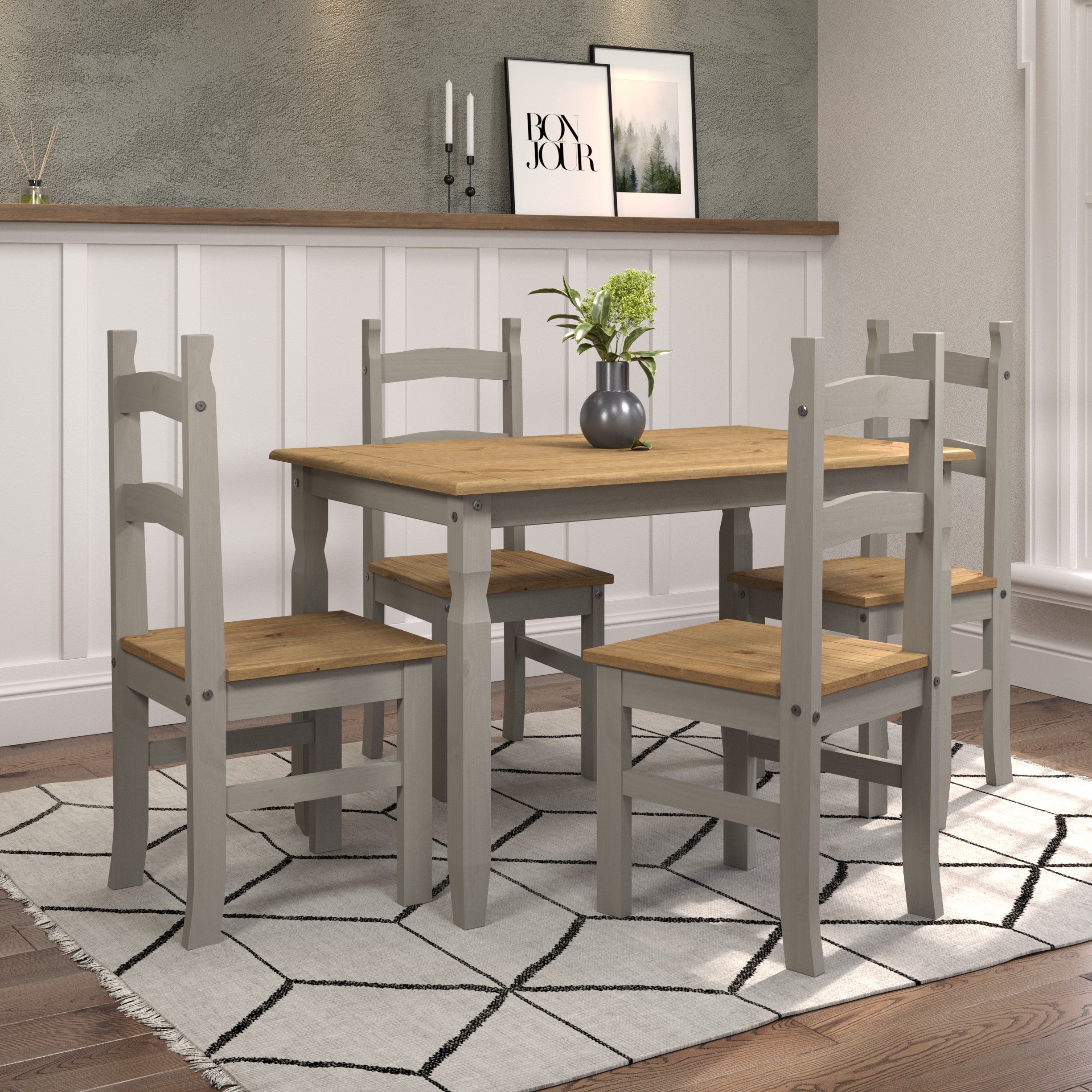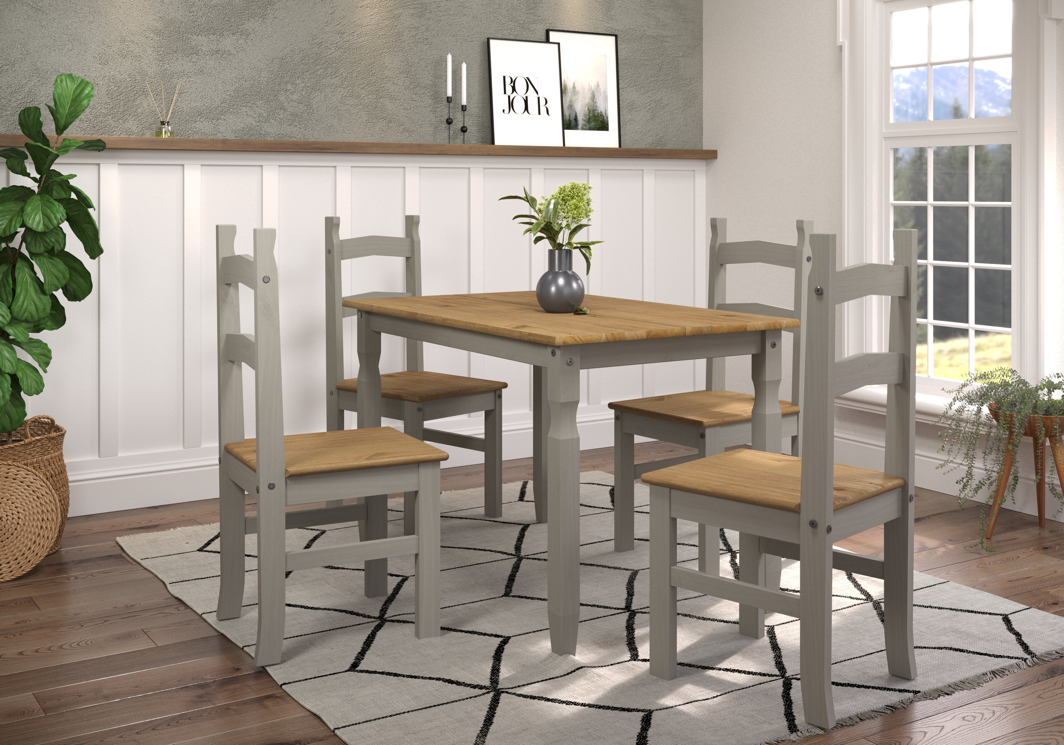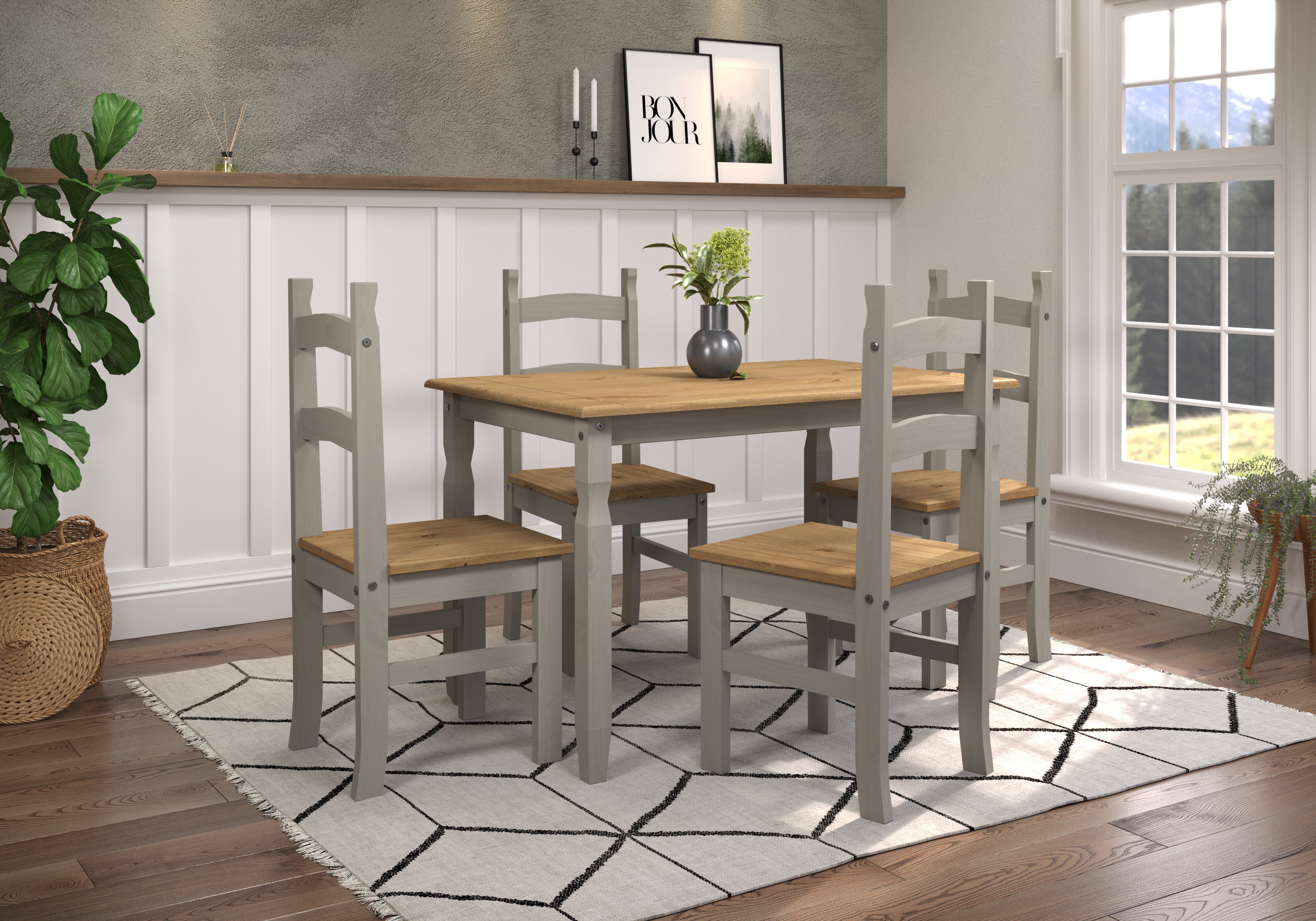 A practical rectangular table and 4 chair set in solid pine with an antique and grey wax finish and steel bolt construction for strength & stability.