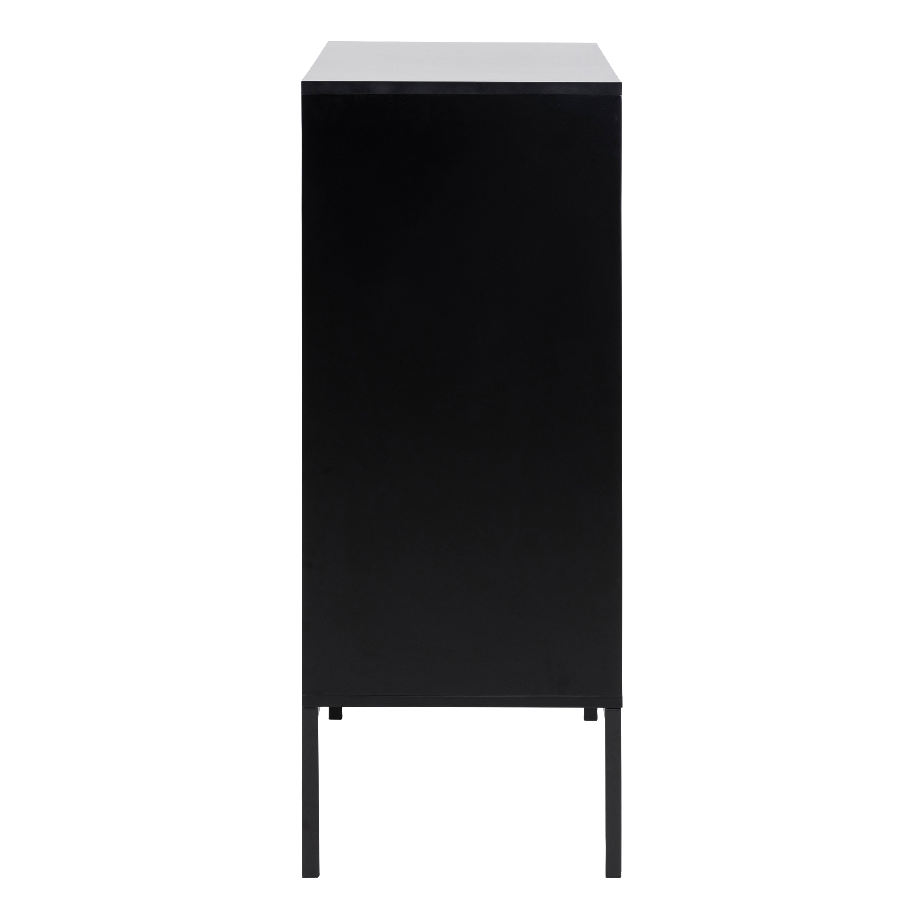 Top MDF with black PU paint finish, base made of matte black powder-coated steel, and doors/drawers featuring a matte wild oak texture.