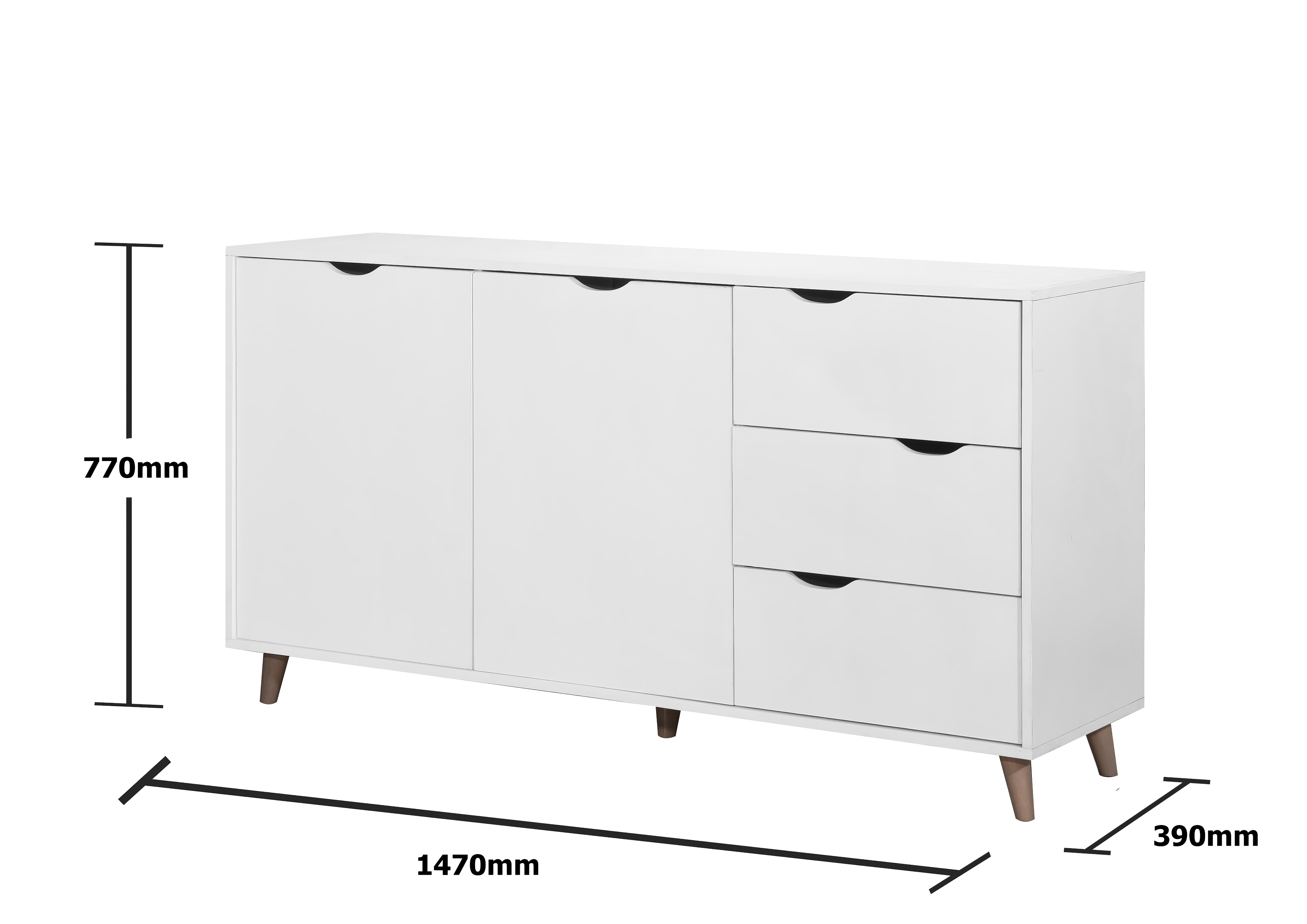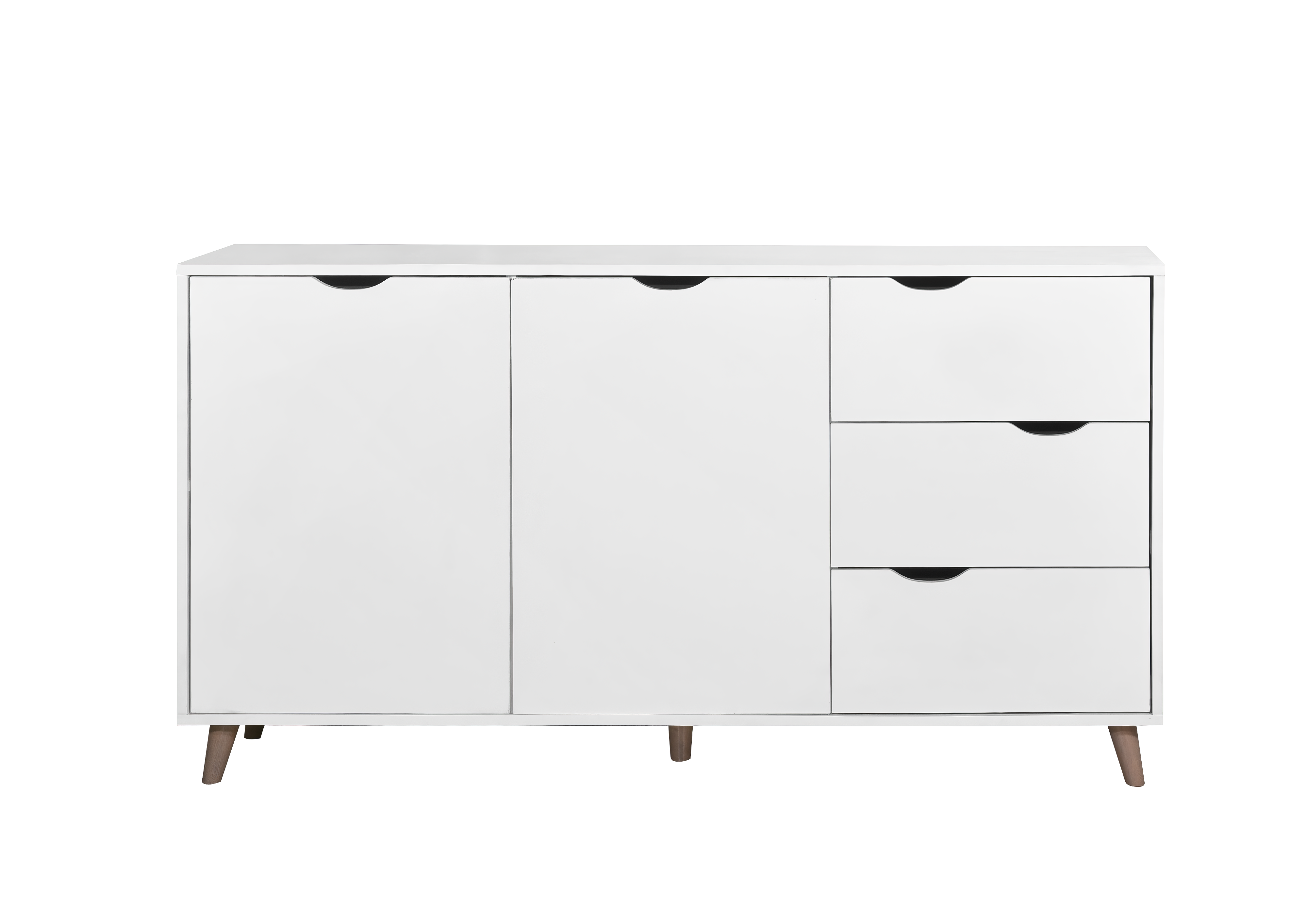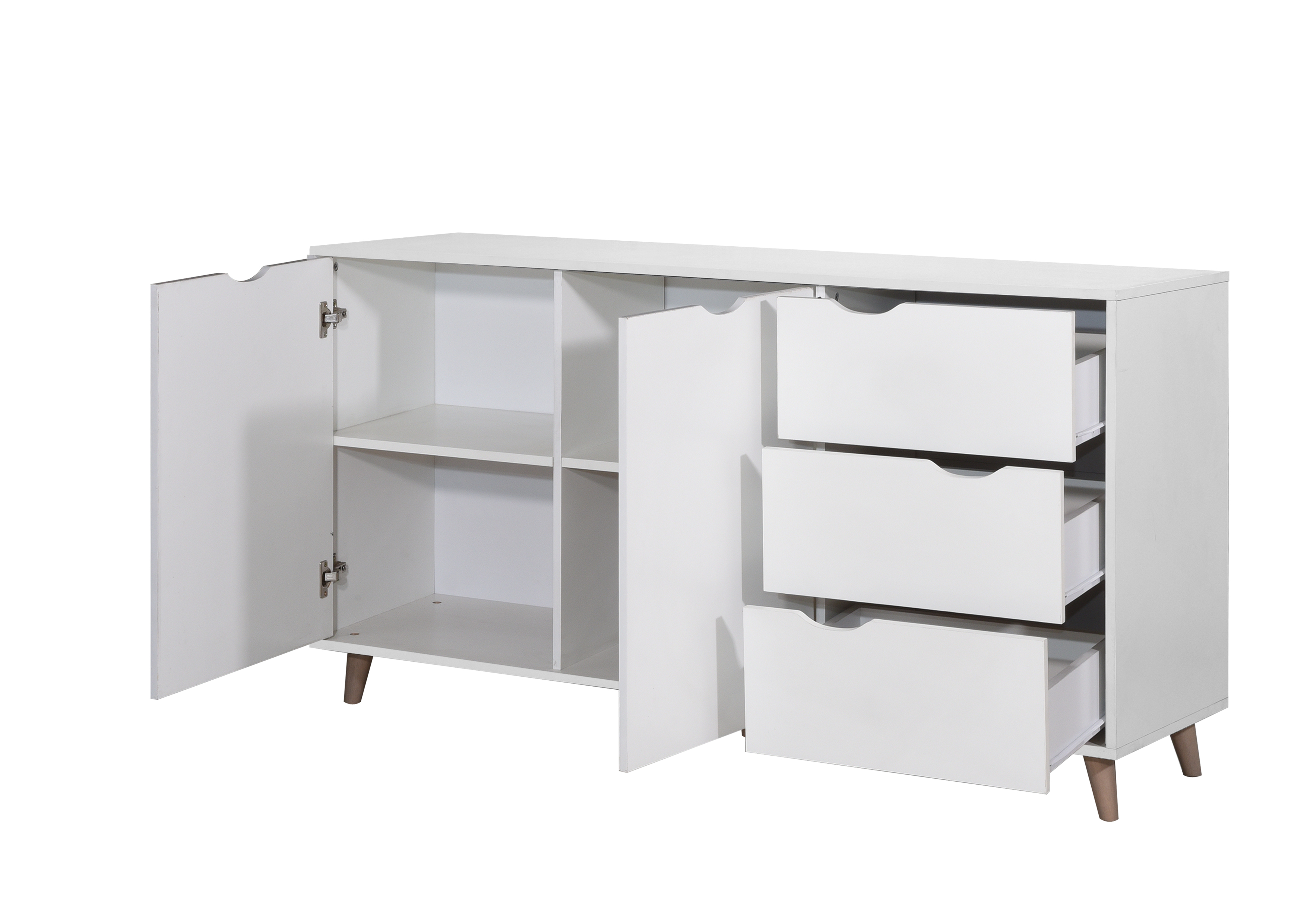This sideboard is finished in a sleek white colour that complements a wide range of décor styles. Made from durable particle board, it stands on solid wooden legs and features metal runners on the drawers for smooth, reliable use.