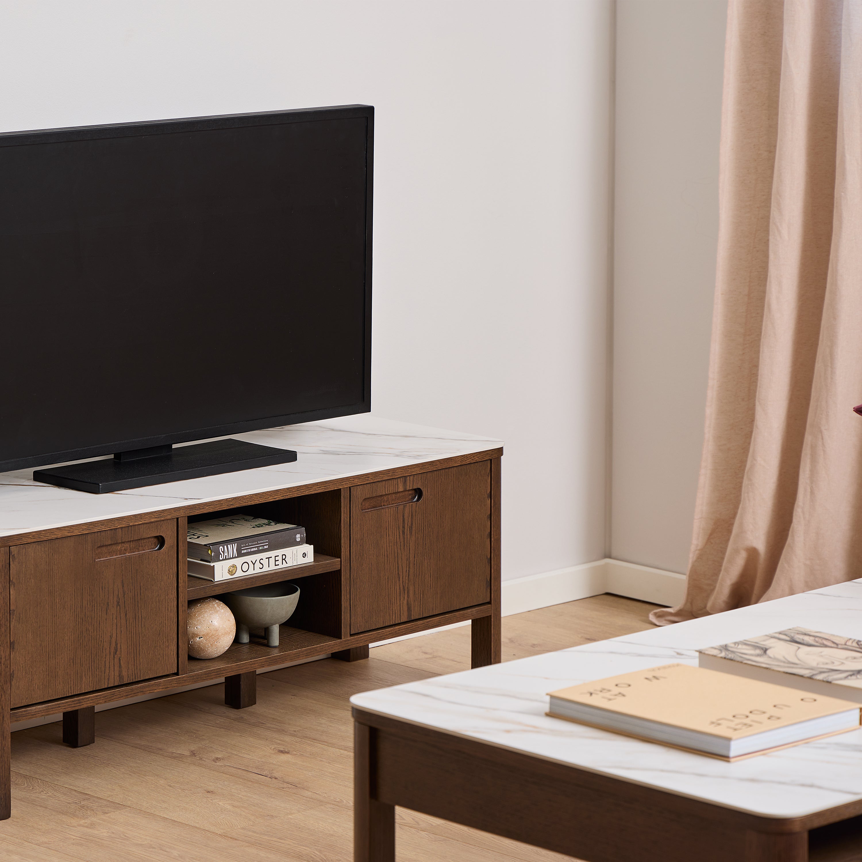 Cream polished ceramic top with subtle veining for a marble-like finish, paired with a smoked oak veneer base.