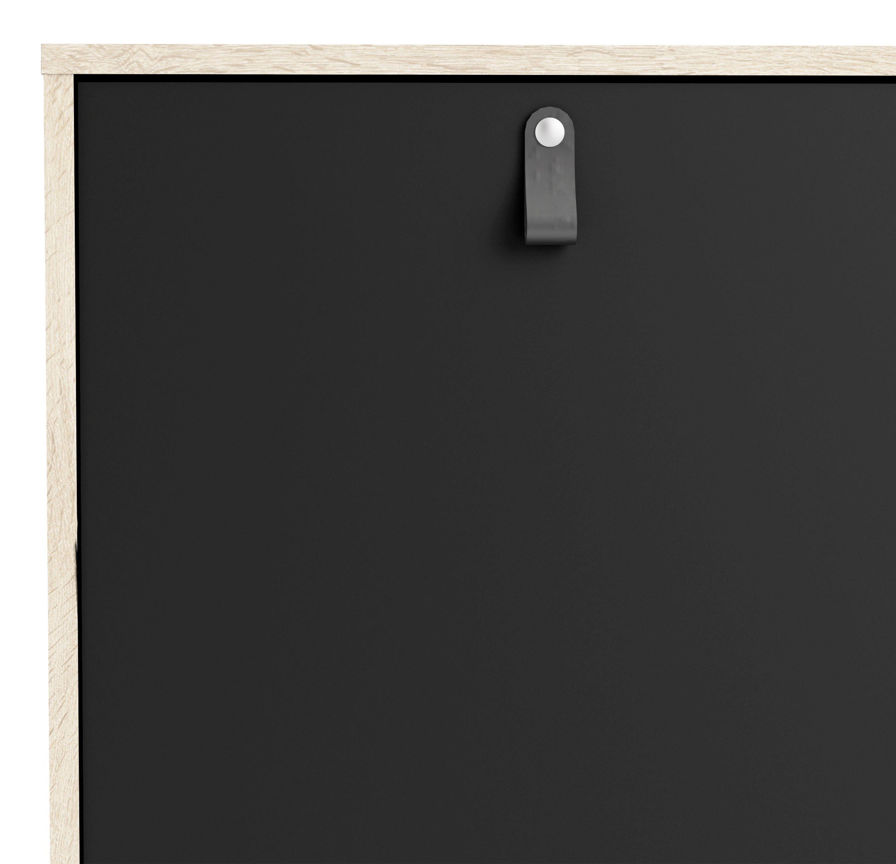 Available in Matt Black Oak finish featuring cut-out handles on small drawers and smooth black or brown leather handles on large drawers and doors (both versions included).