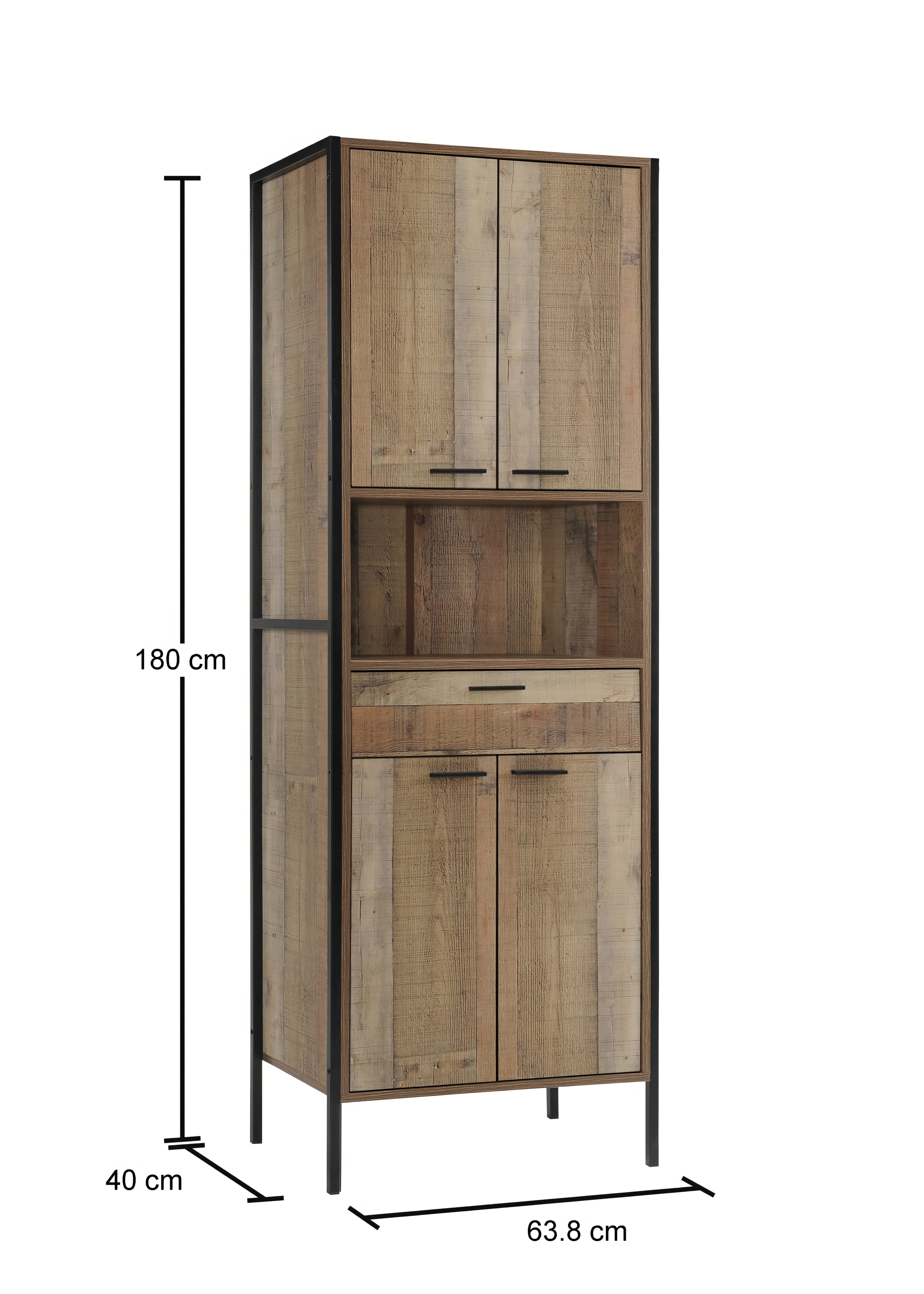 The Stretton Tall Storage Cabinet is a striking rustic combination of rustic medium oak and a black metal outer frame, creates a contemporary look for your home. A multi purpose cabinet, The Stretton Tall Storage Cabinet has a four doors with shelves inside and one drawer, offering storage for any room. Contemporary Rustic Design Tall Storage Cabinet. Suitable for Kitchen, Dining Room or Home Office. Metal Drawer and Door Handles. Metal Hinges, Runners, Outer Frame and Legs. Measures: W64cm x H180cm x D40cm. Manufactured using particle board, each item comes flat packed for self assembly at home. Part of the Stretton Furniture Collection